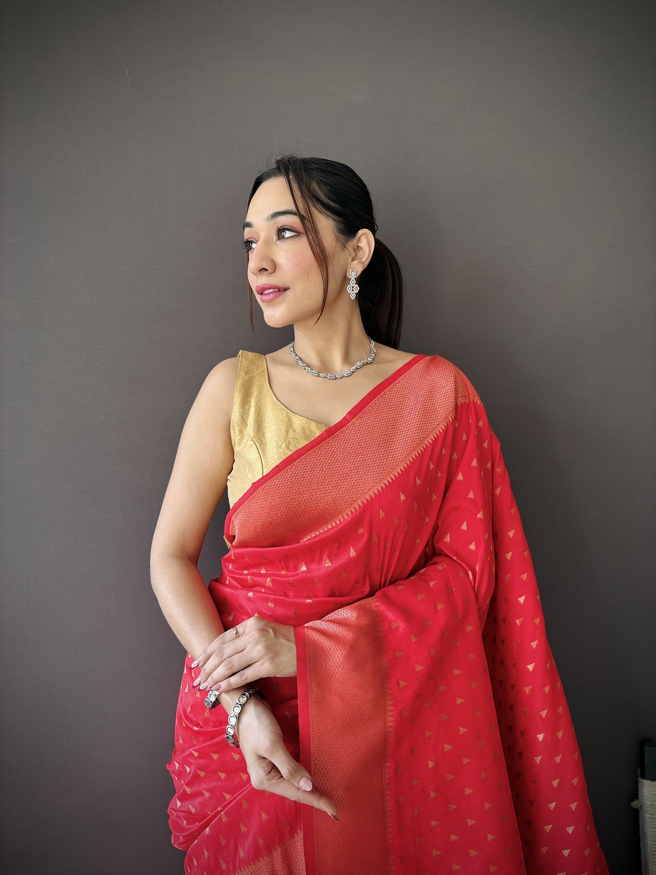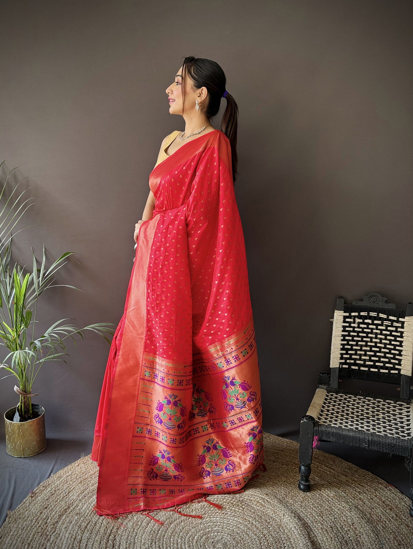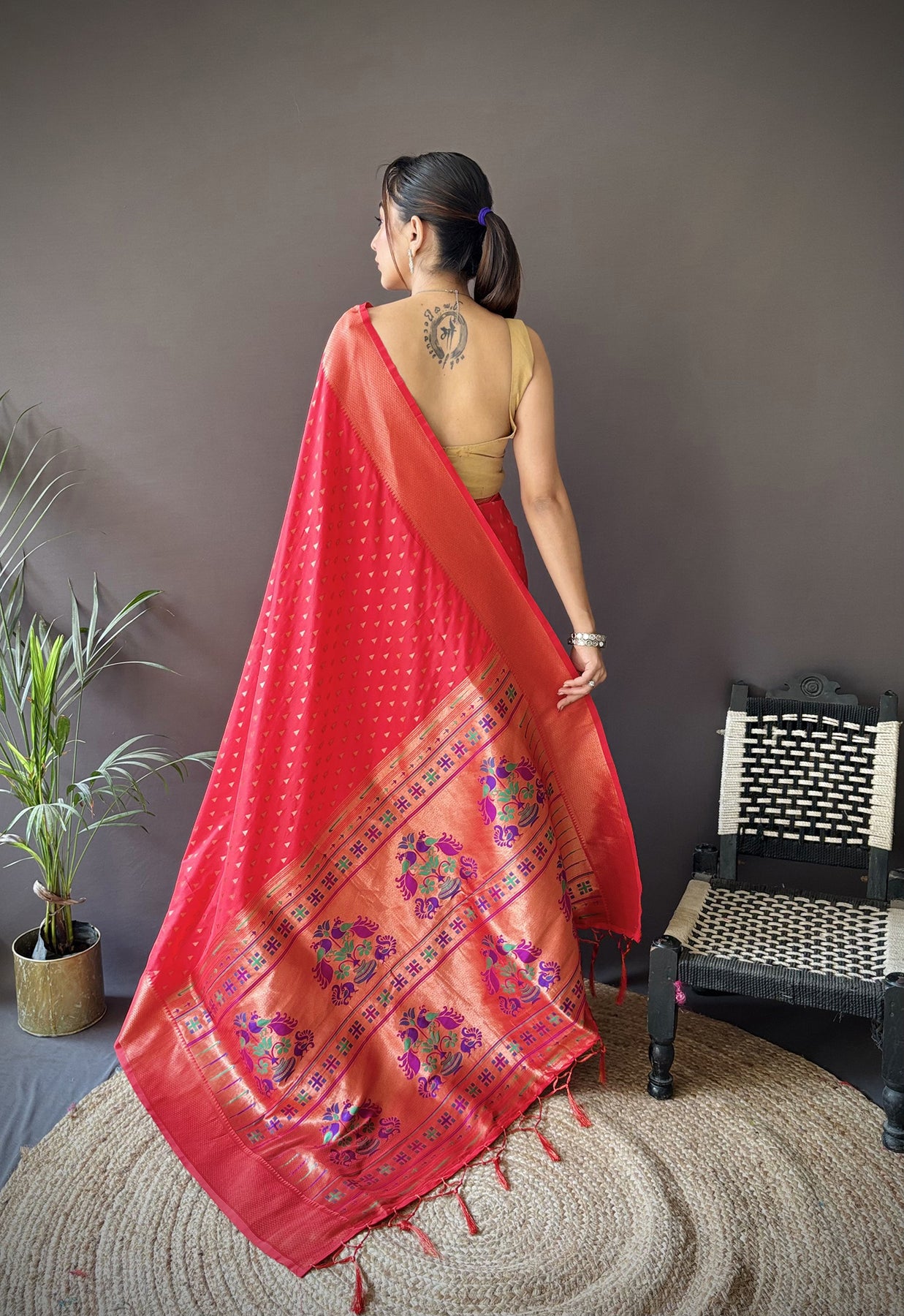 Red Soft Lichi Silk Jacquard Butti Zari Weaving Paithani Saree