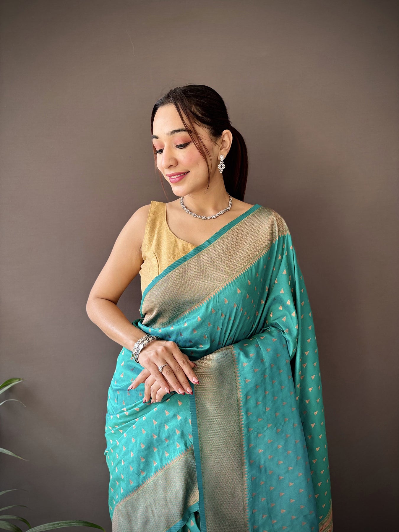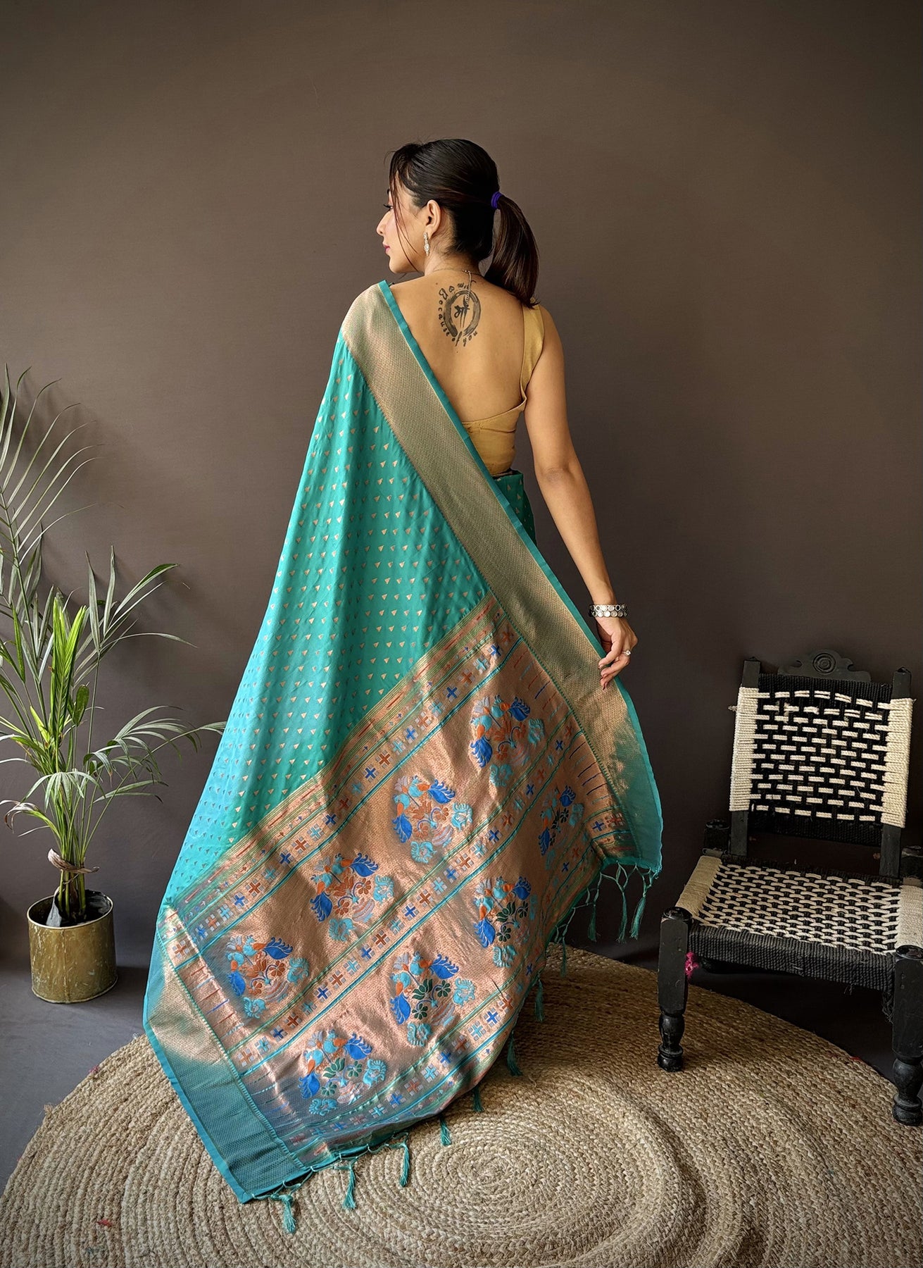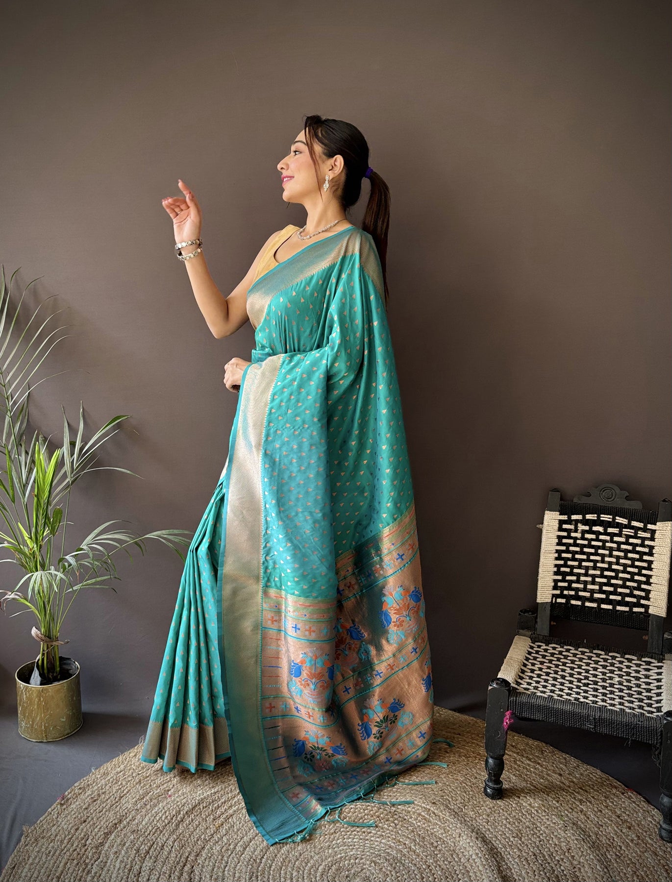 Teal Green Soft Lichi Silk Jacquard Butti Zari Weaving Paithani Saree