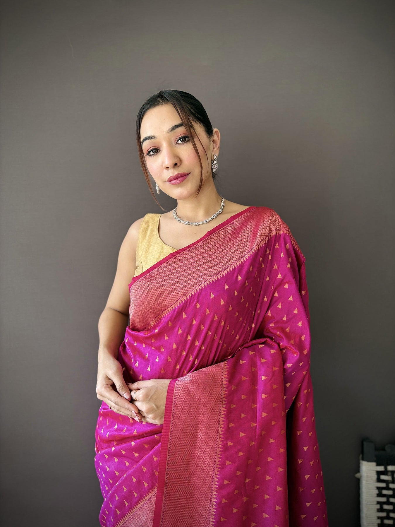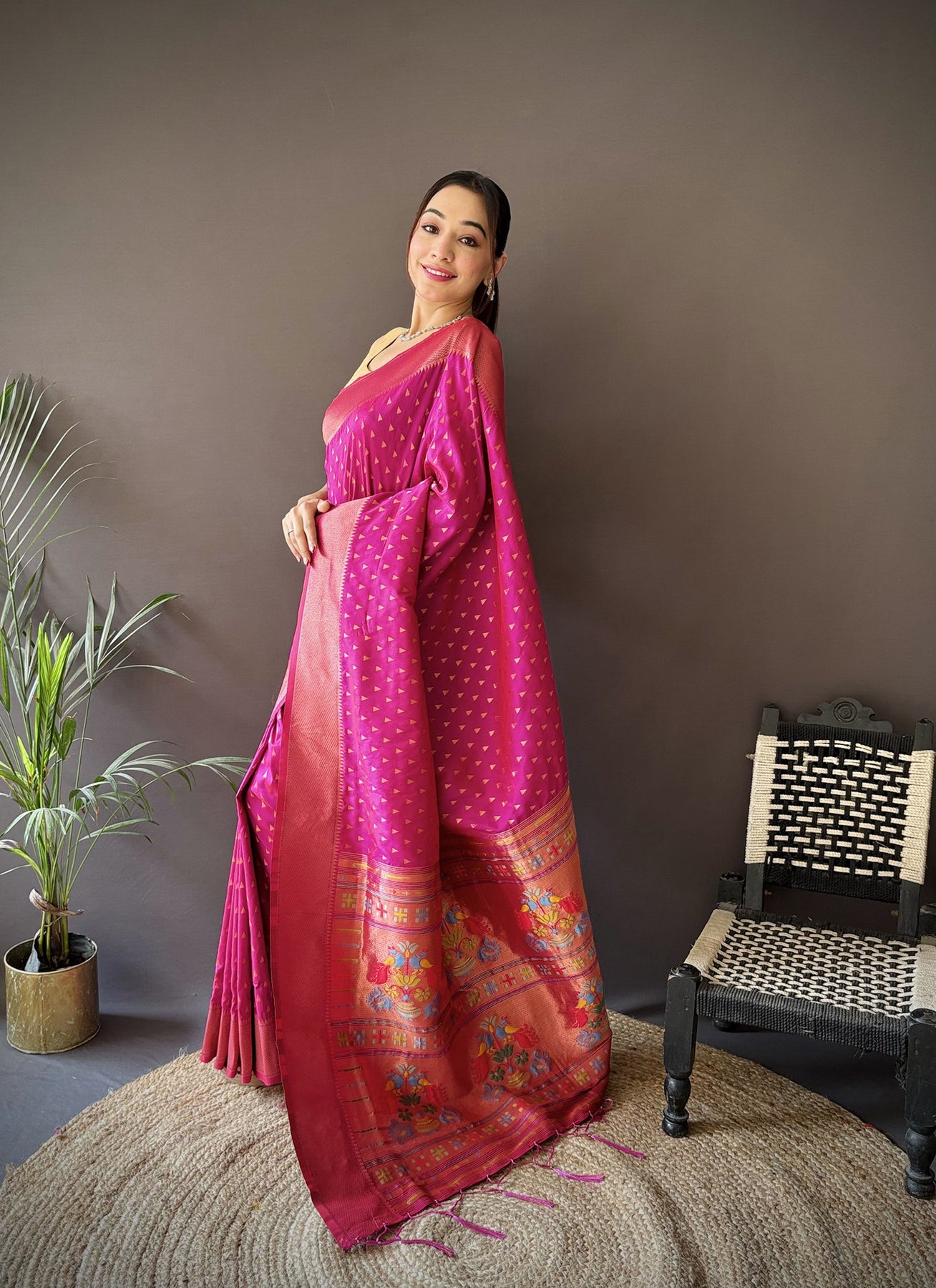 Rani Pink Soft Lichi Silk Jacquard Butti Zari Weaving Paithani Saree