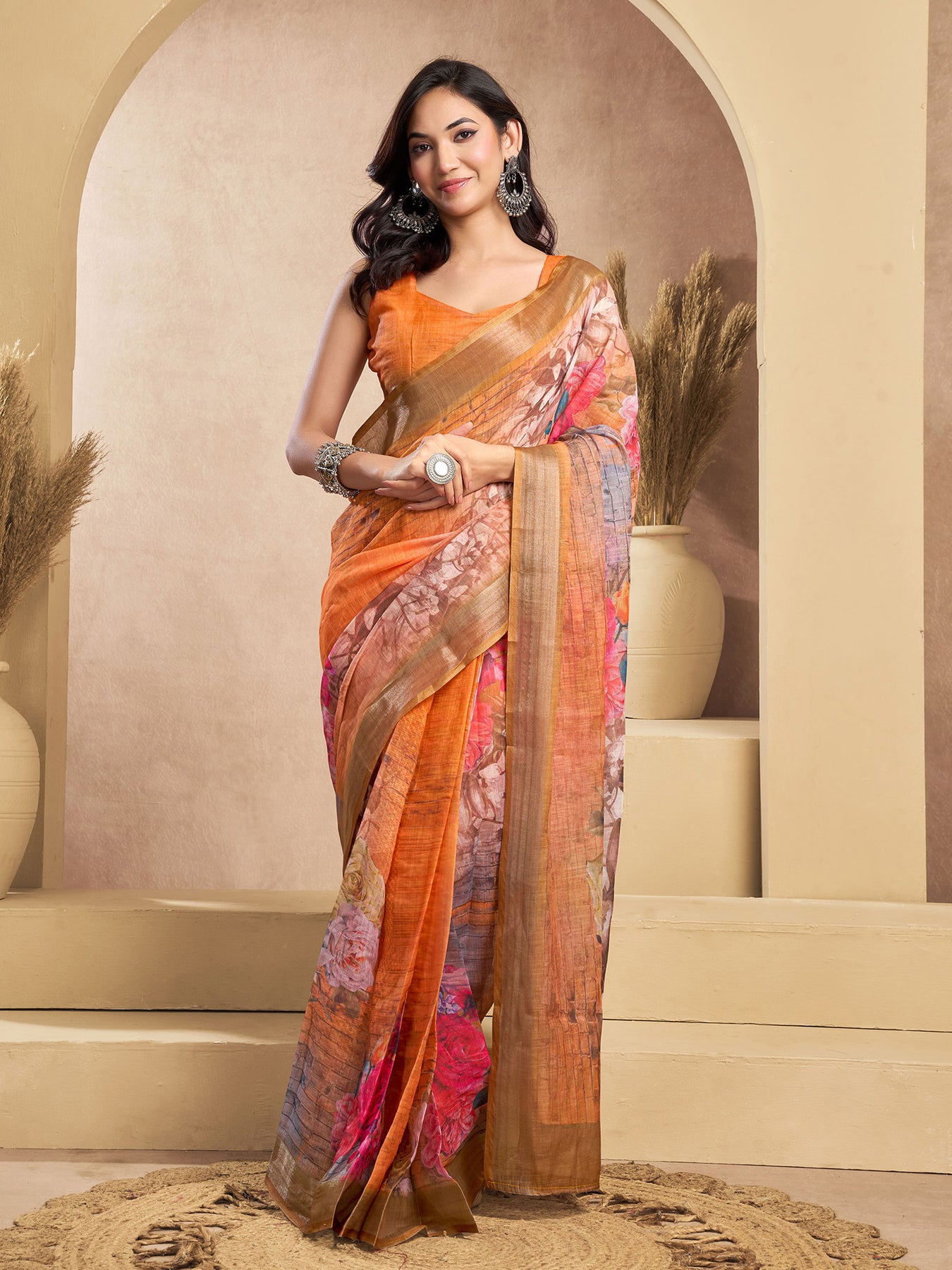 Orange Linen Floral Motifs Printed Ready To Wear Saree