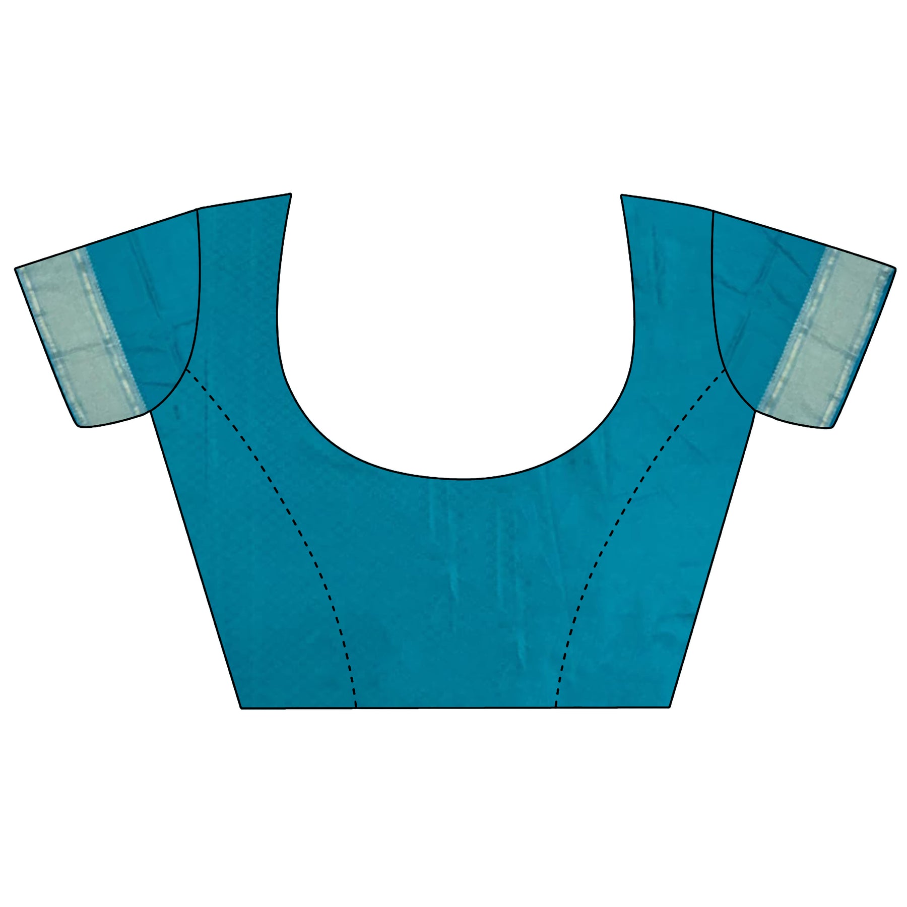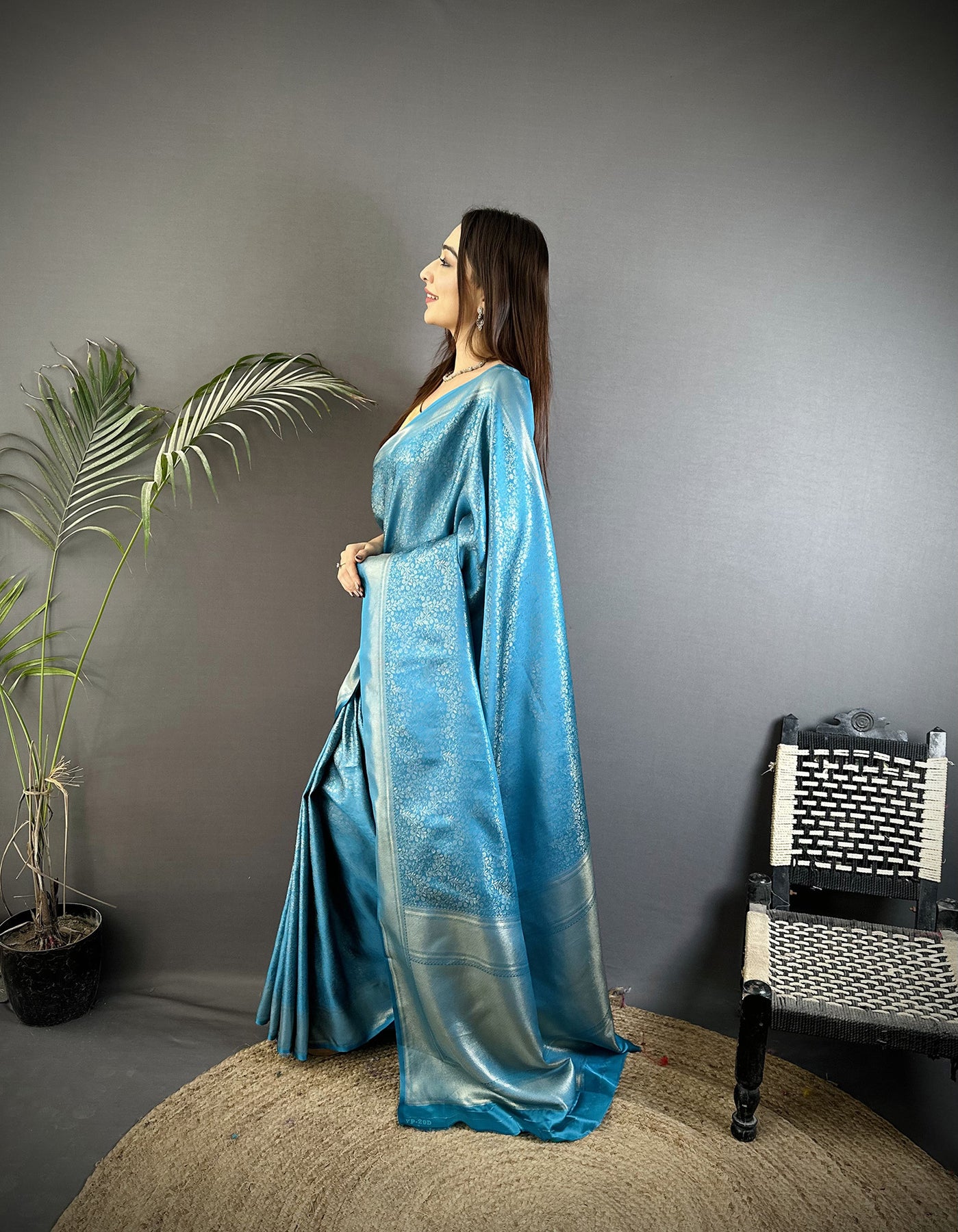 Ocean Blue Satin Silk Floral Motifs & Ethnic Silver Zari Design Kanchipuram Saree