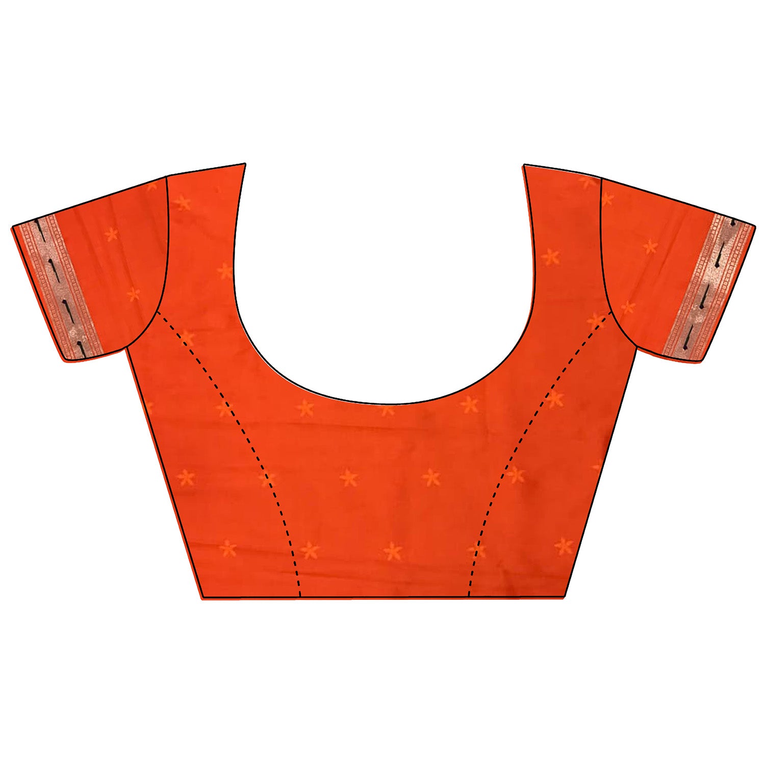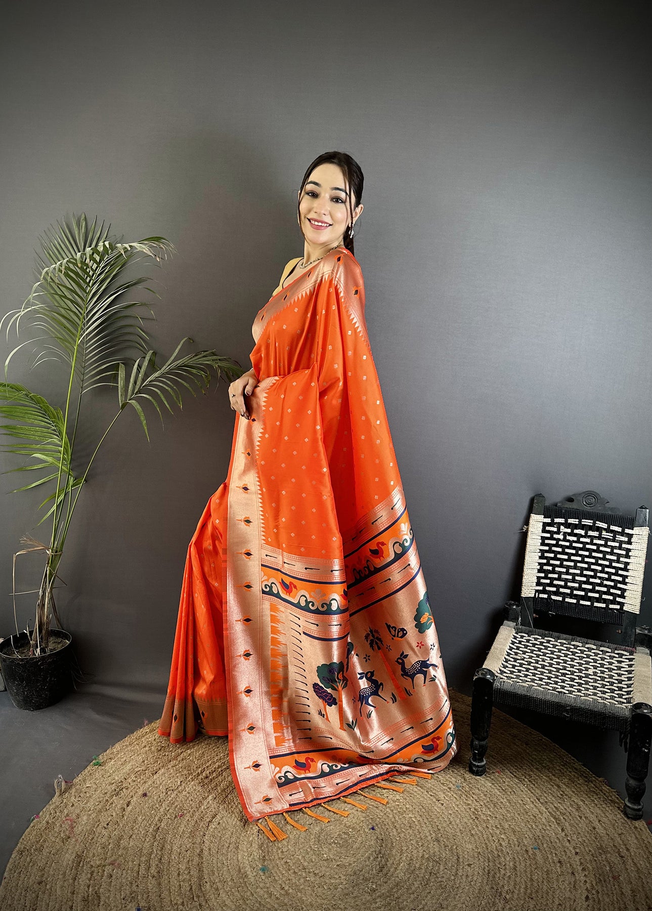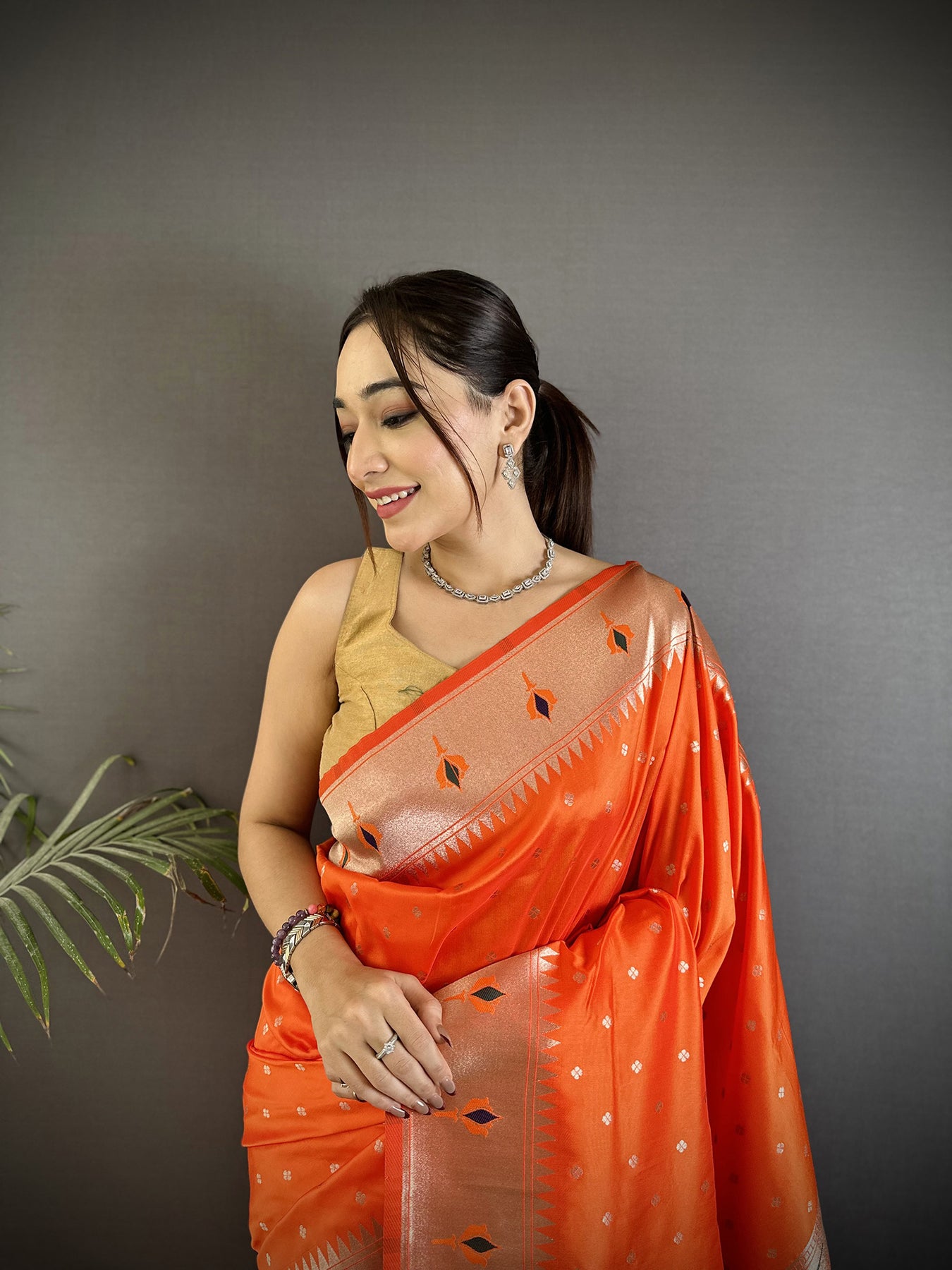 Orange Soft Lichi Silk Peacock & Floral Motifs Jacquard Kanchipuram Saree