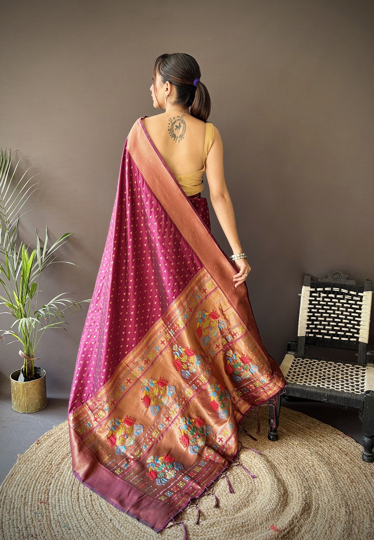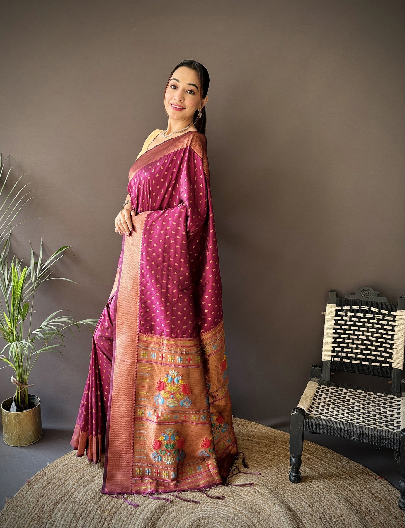 Maroon Soft Lichi Silk Jacquard Butti Zari Weaving Paithani Saree