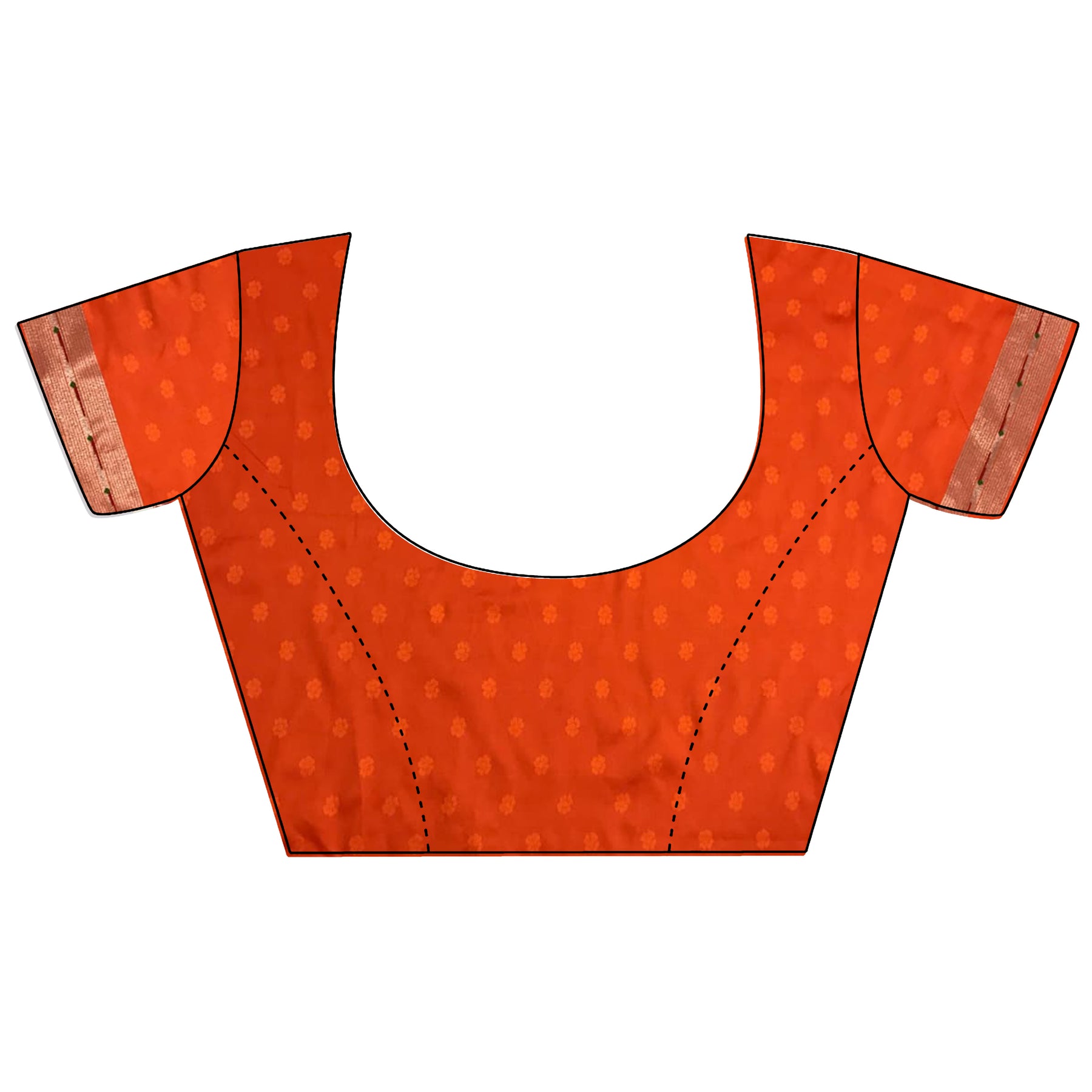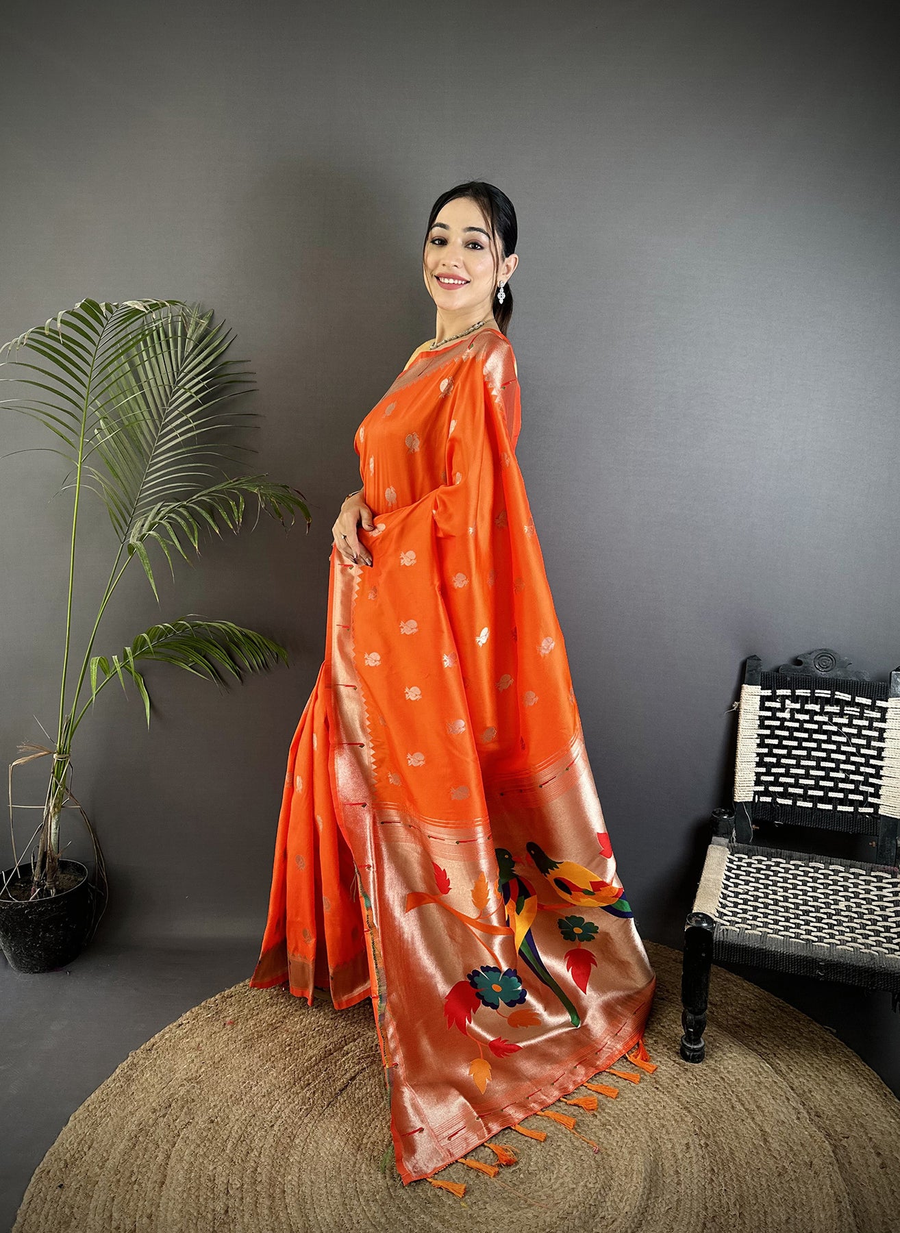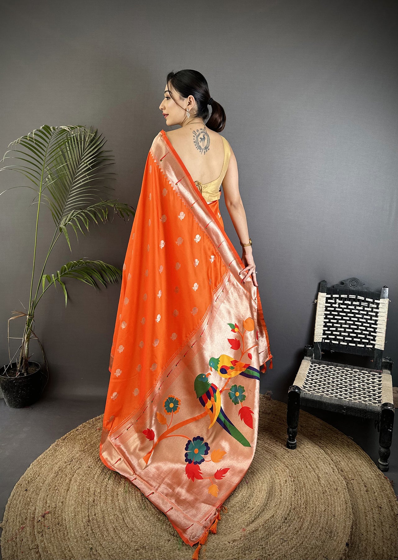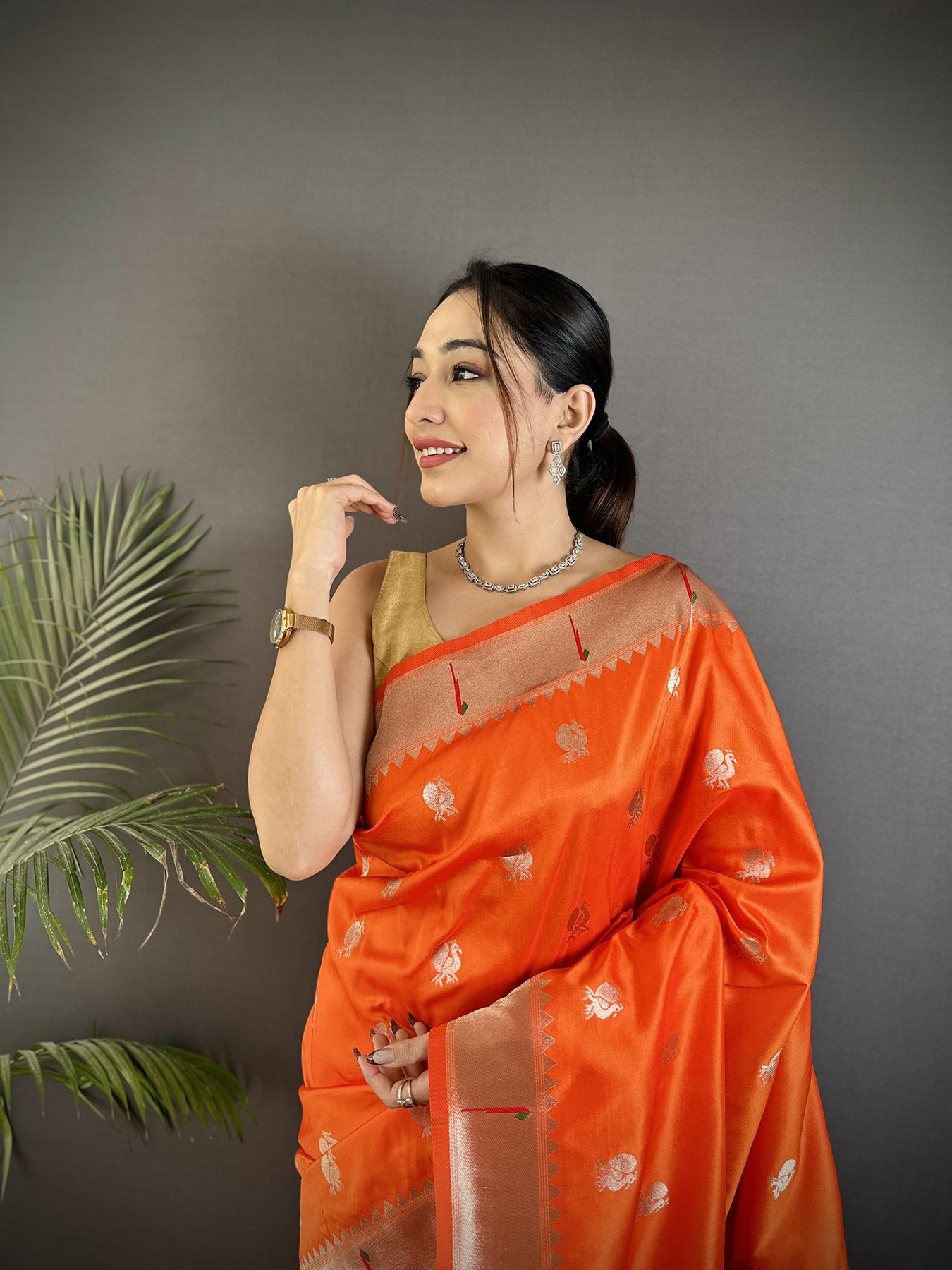 Orange Soft Silk Peacock & Floral Zari Motifs Kanchipuram Saree