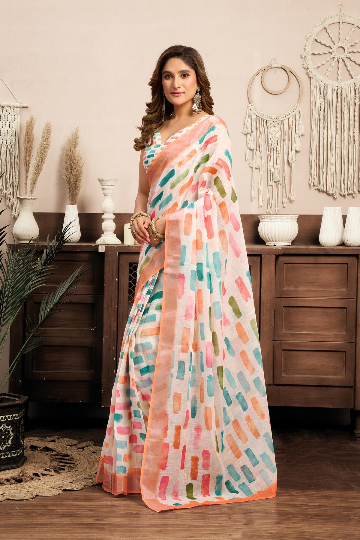 White Linen Color Block Printed Ready To Wear Saree With Pocket