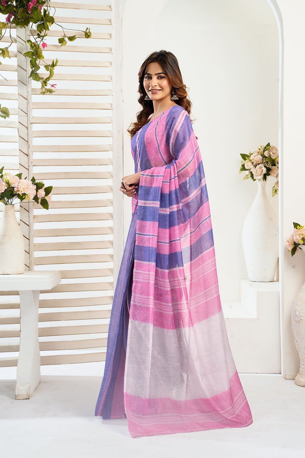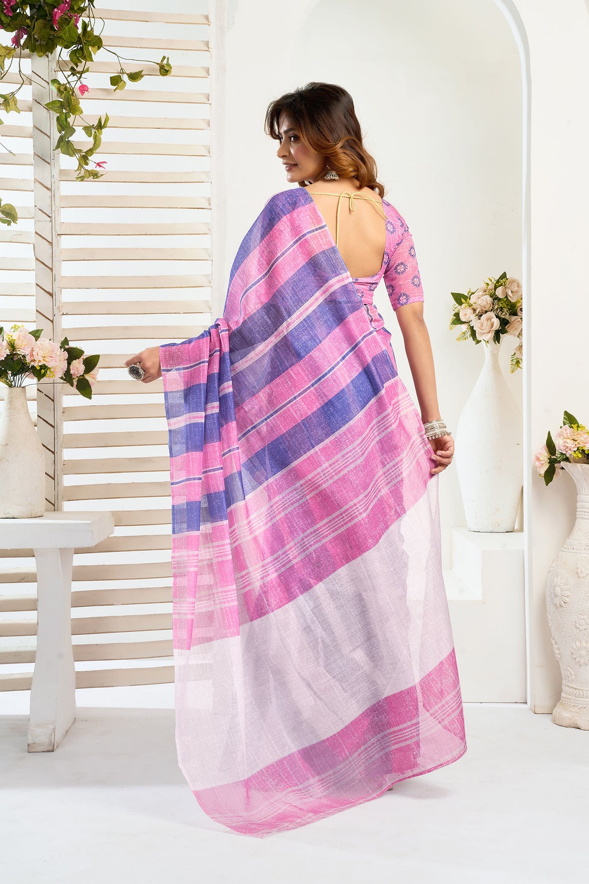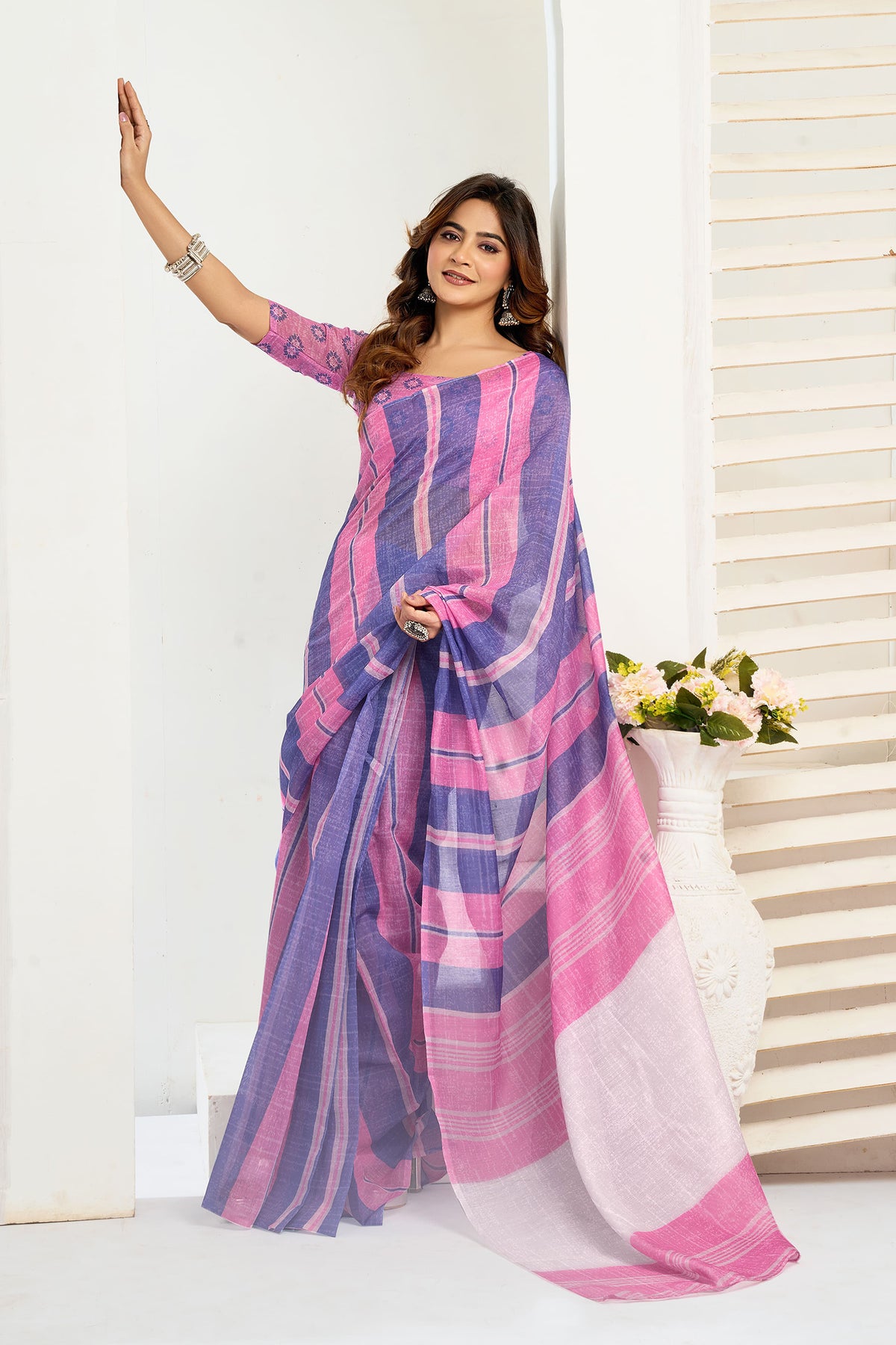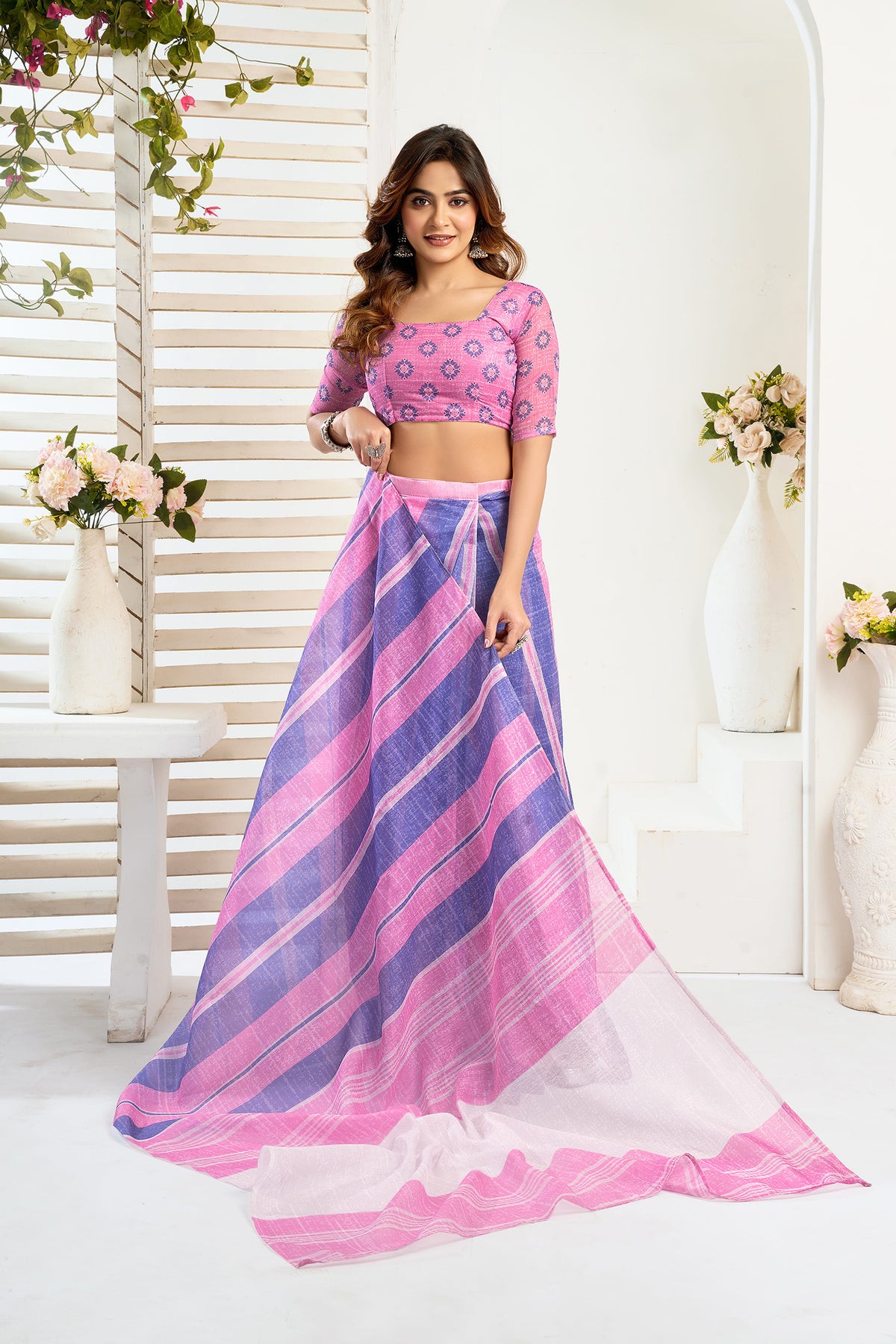 Pink & Blue Linen Striped Printed Ready To Wear Saree