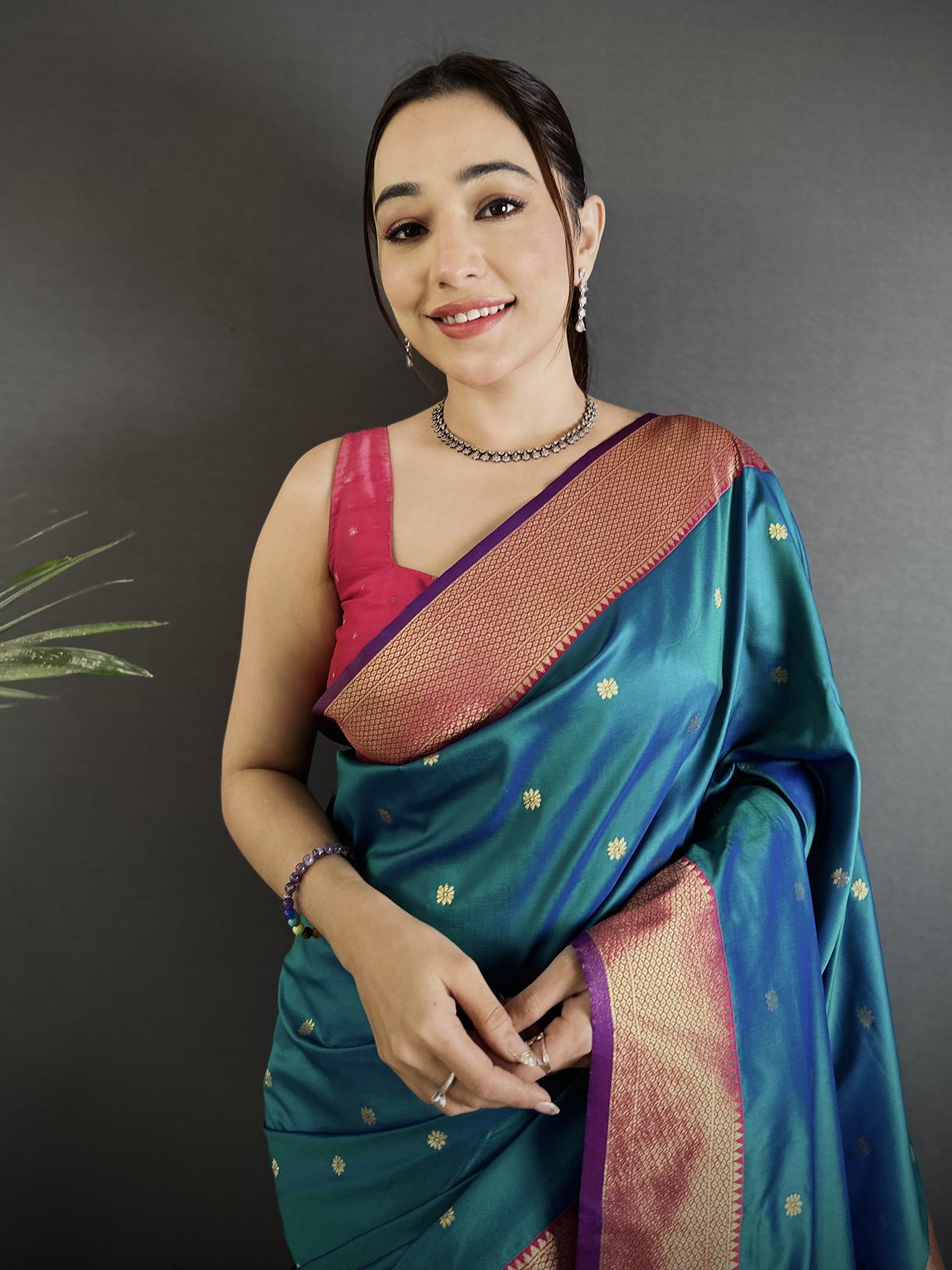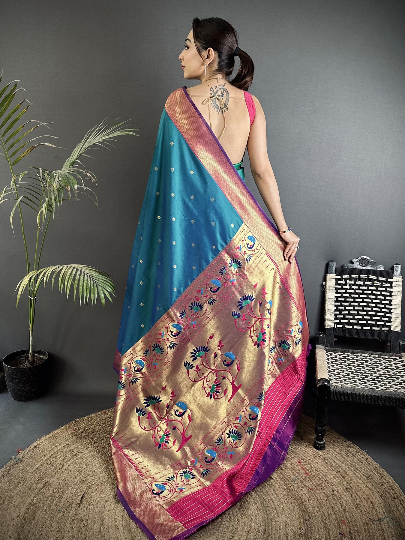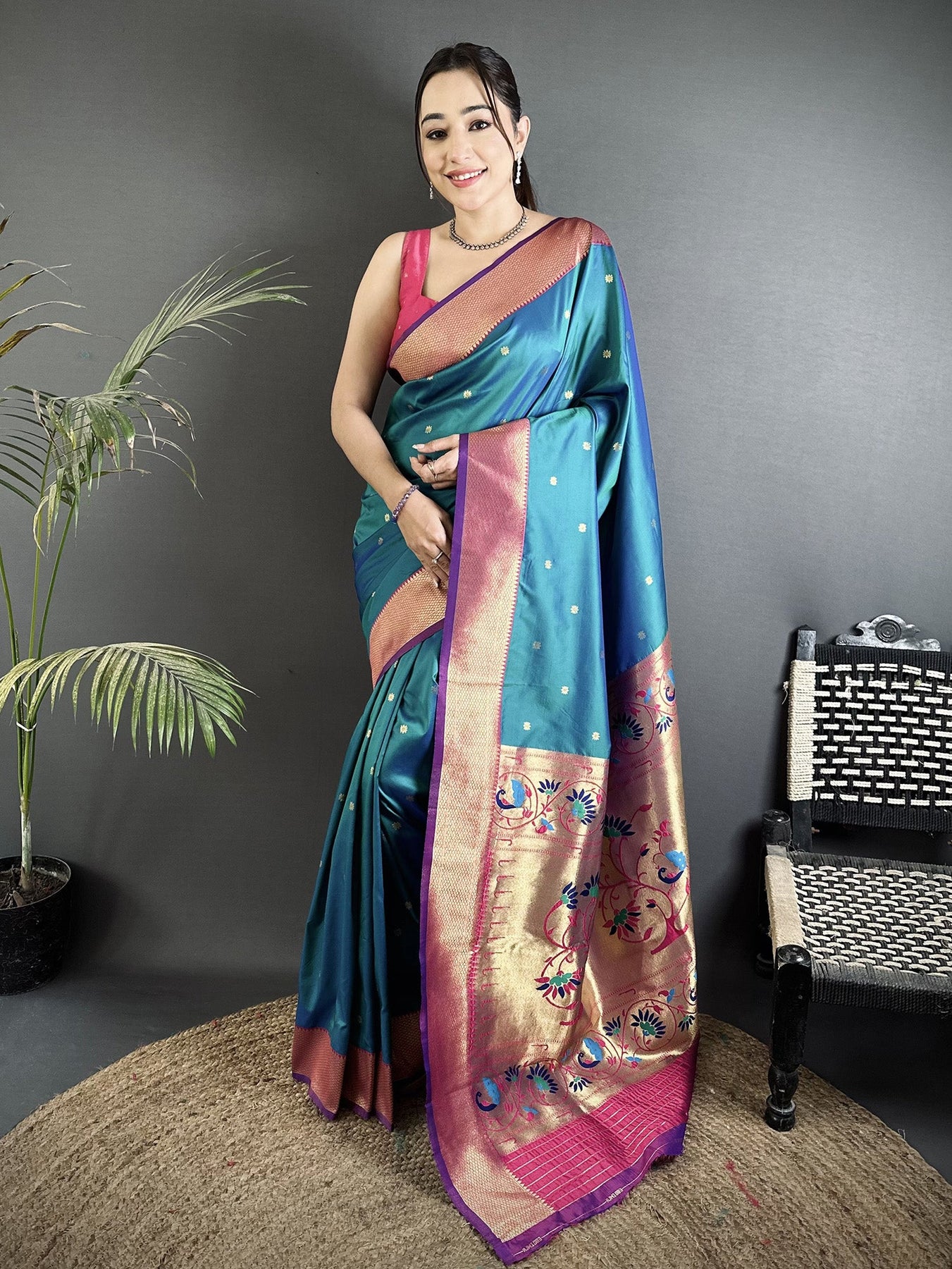 Teal Blue Lichi Silk Peacock Motifs Zari weaving Paithani Saree