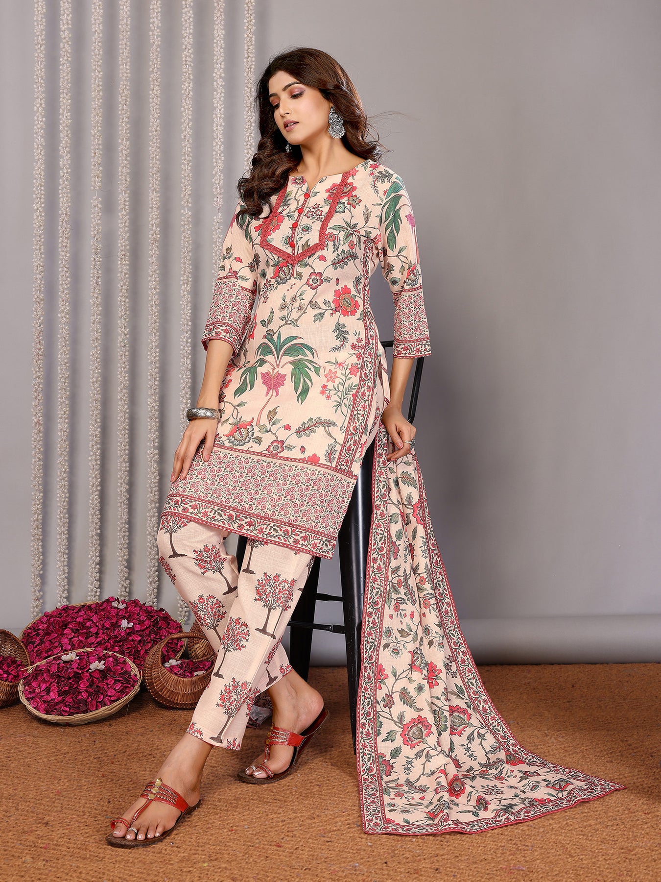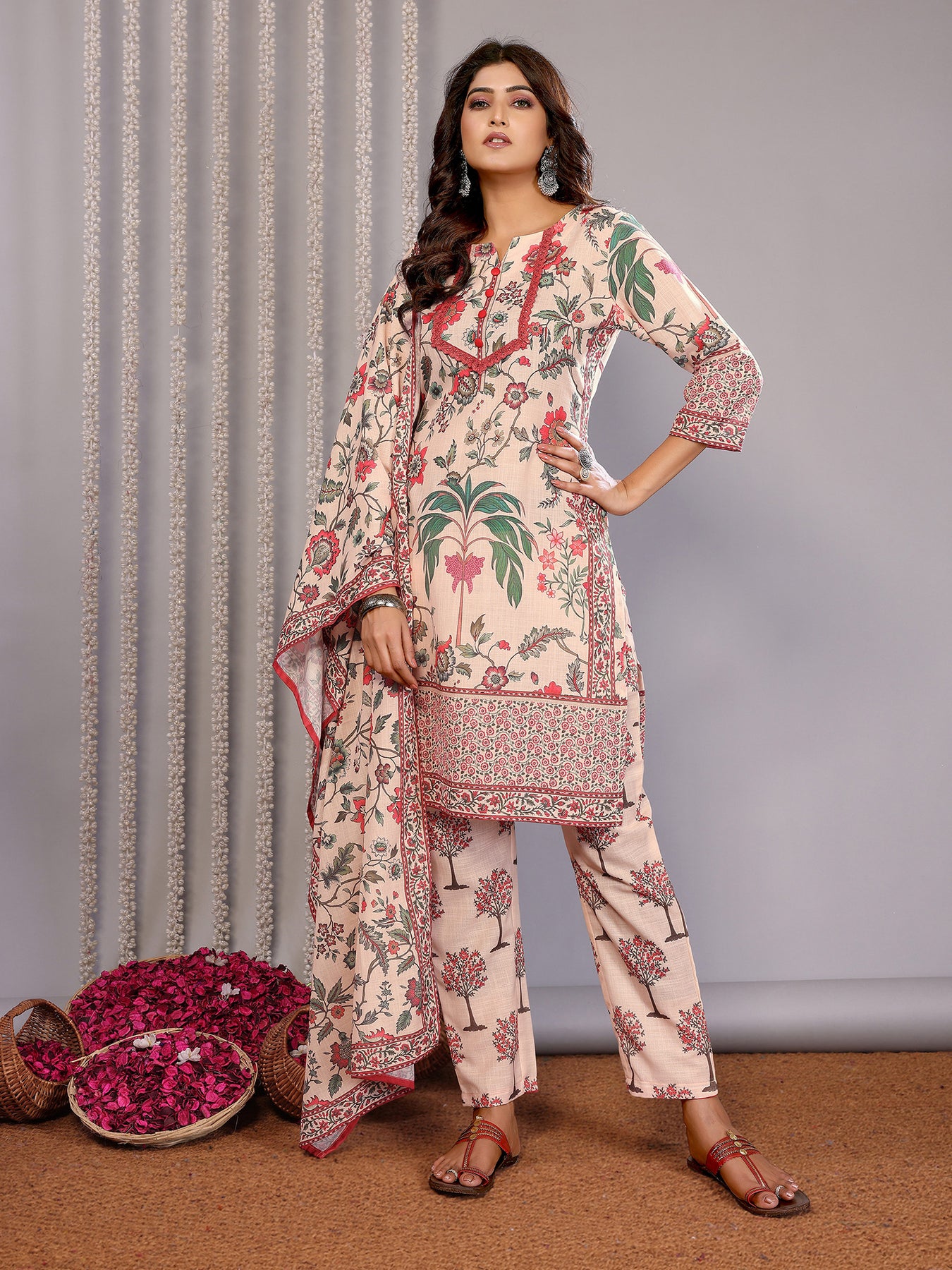 Elevate your everyday ethnic style with this Cream Linen Floral Printed Straight Notch Neck Kurta Set for Women. Crafted from breathable and soft linen fabric, this elegant 3-piece set offers all-day comfort along with timeless charm. The soothing cream base paired with delicate floral prints creates a refreshing and graceful look, perfect for both casual and festive occasions.