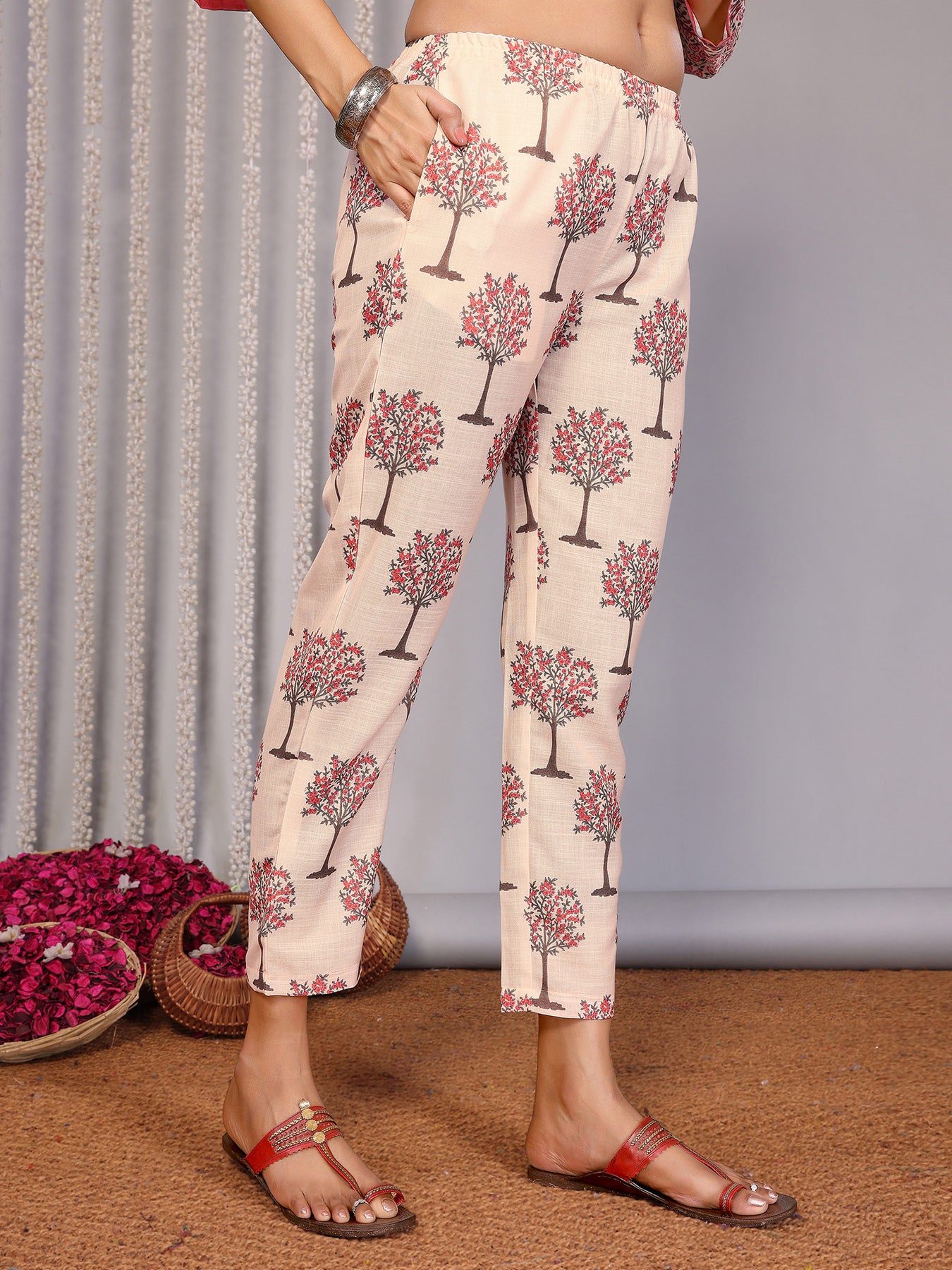 Cream Linen Floral Printed Straight Notch neck Kurta Set