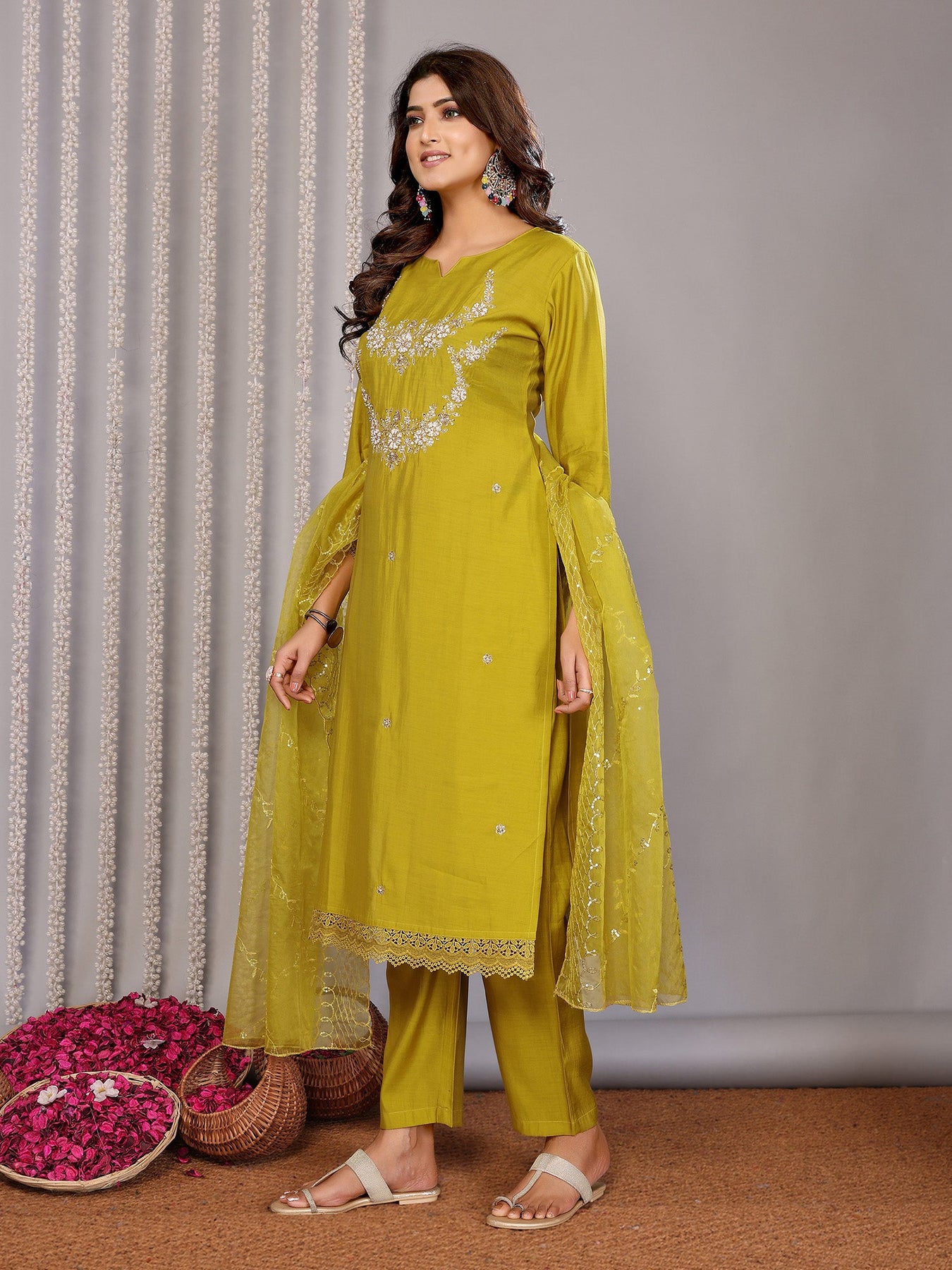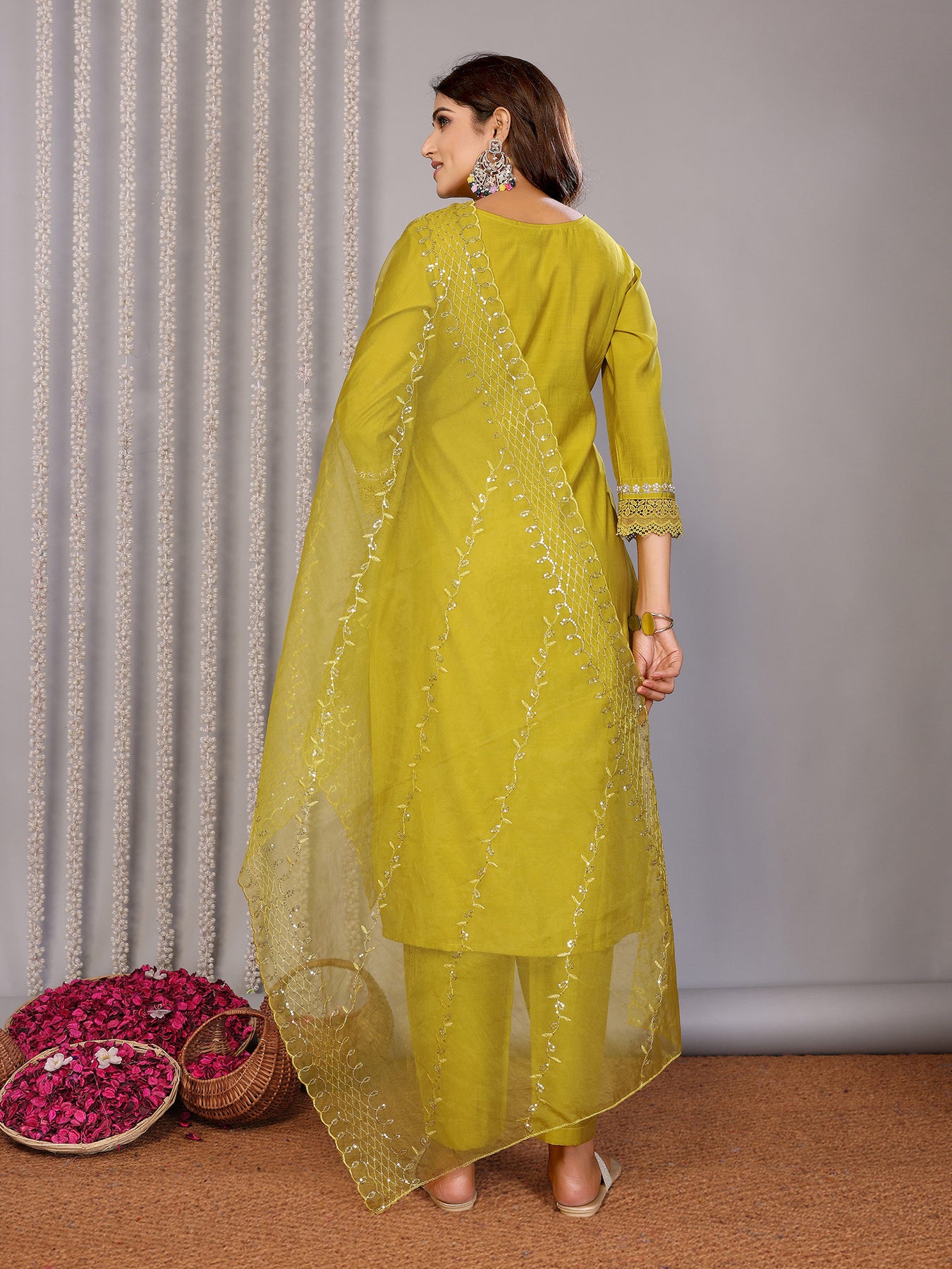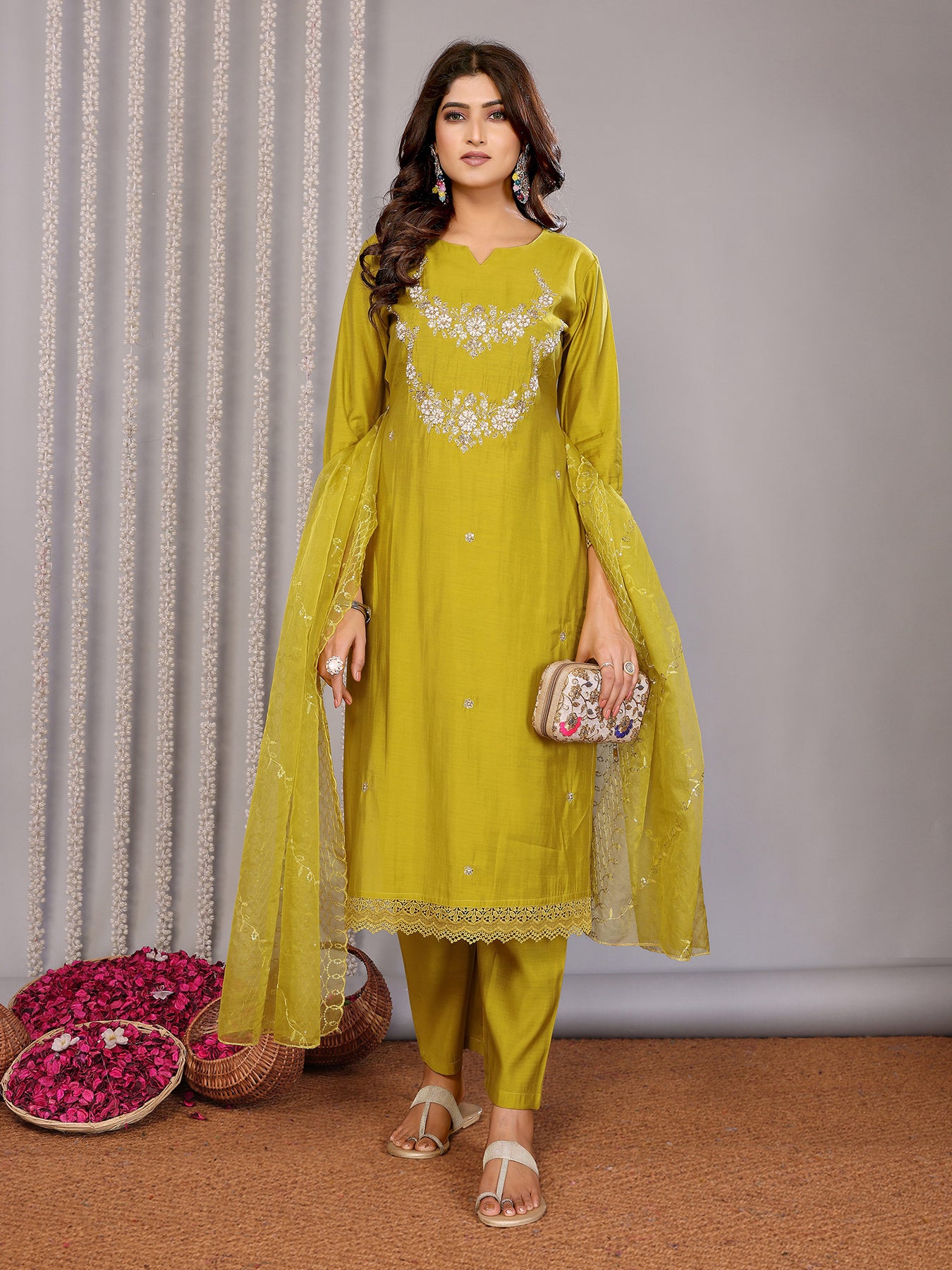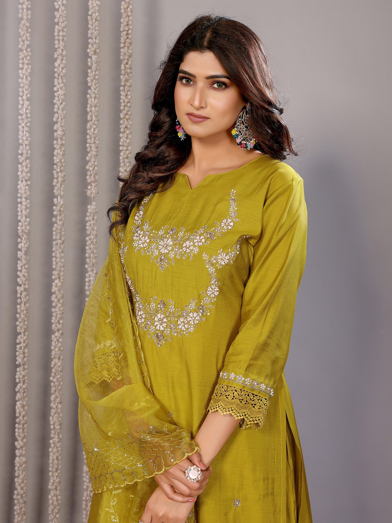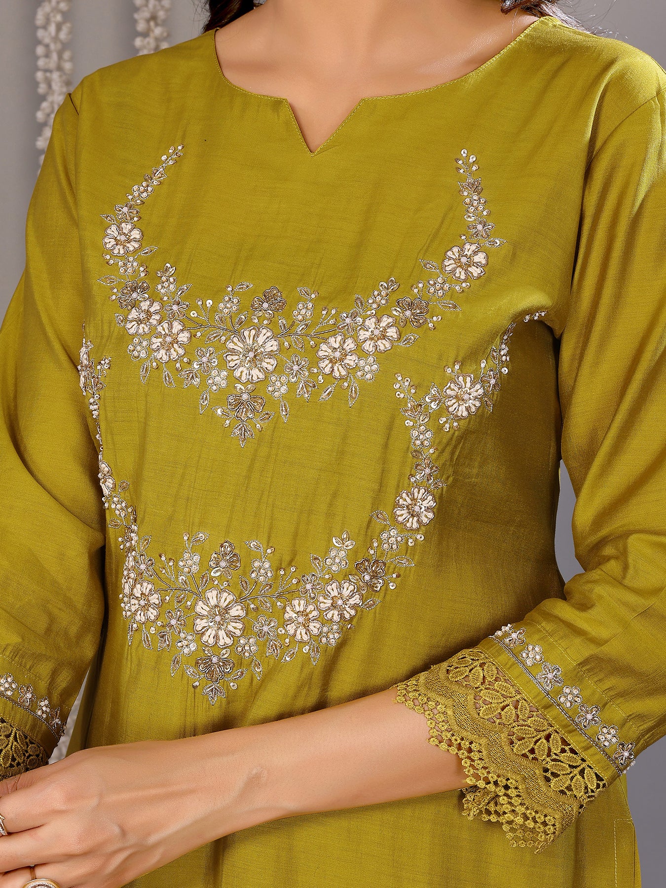 Elora Olive Green Roman Floral Embroidery Straight Notch neck Kurta Set