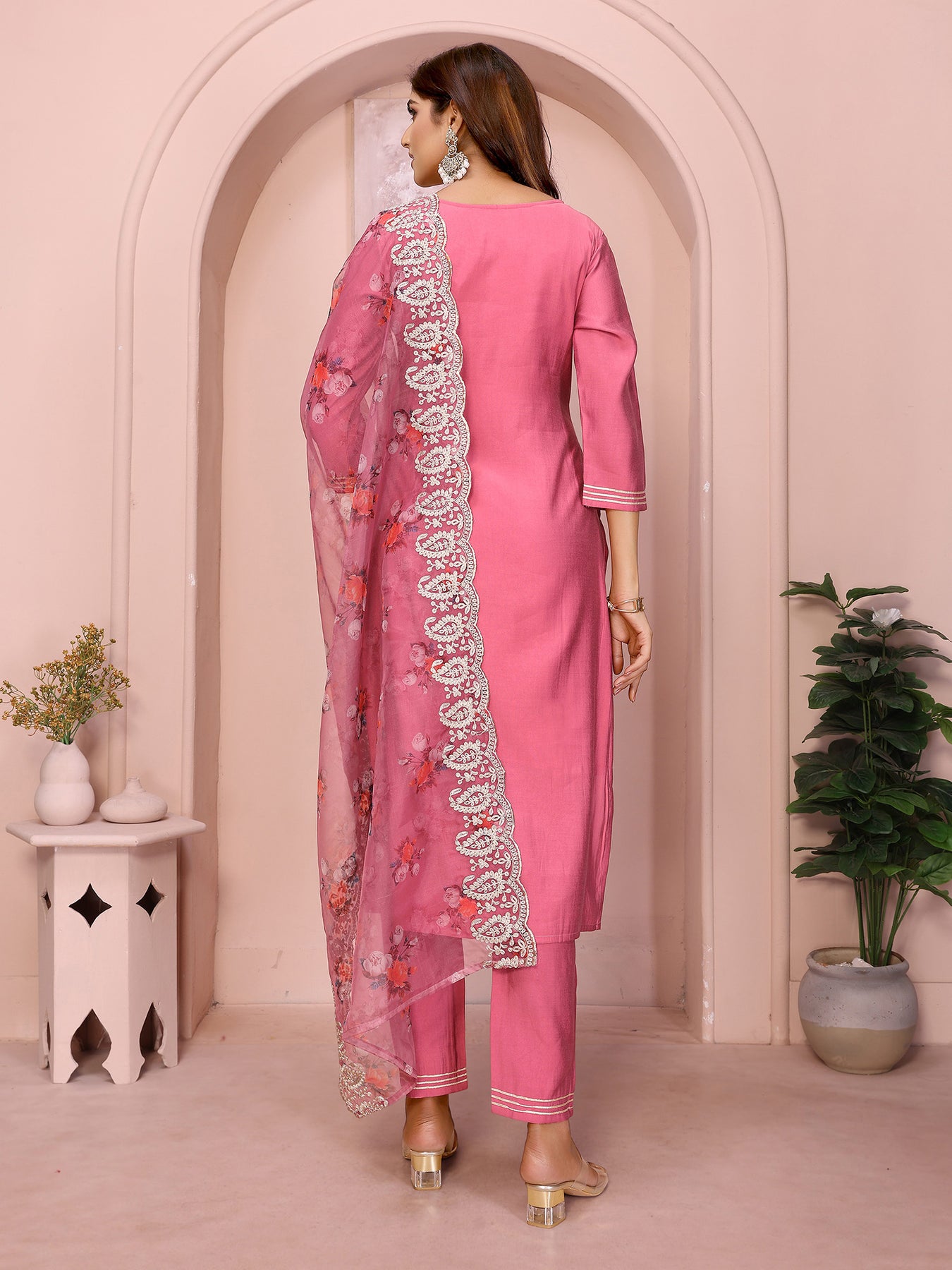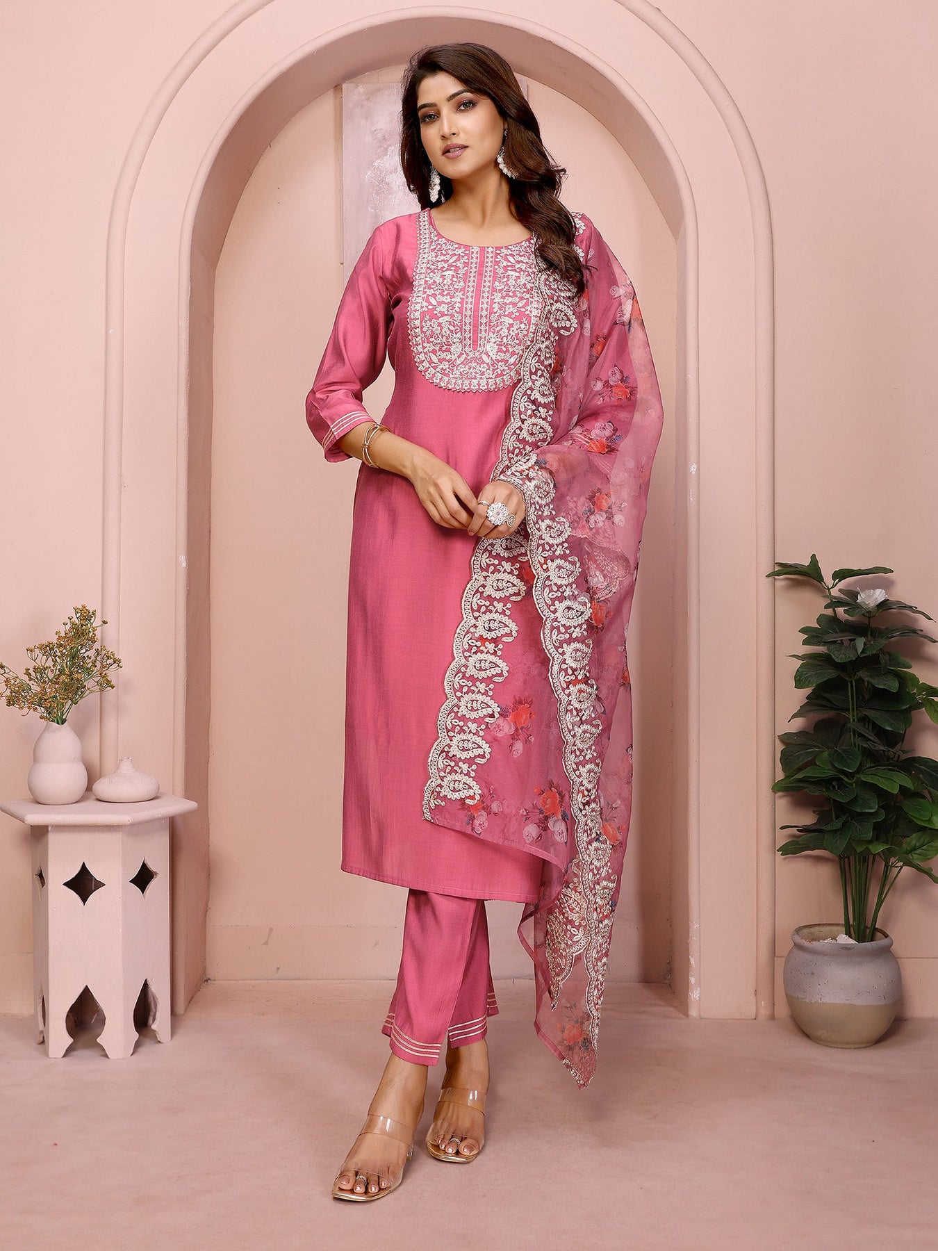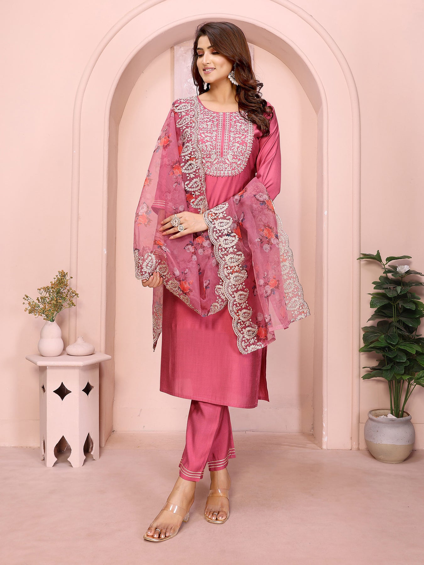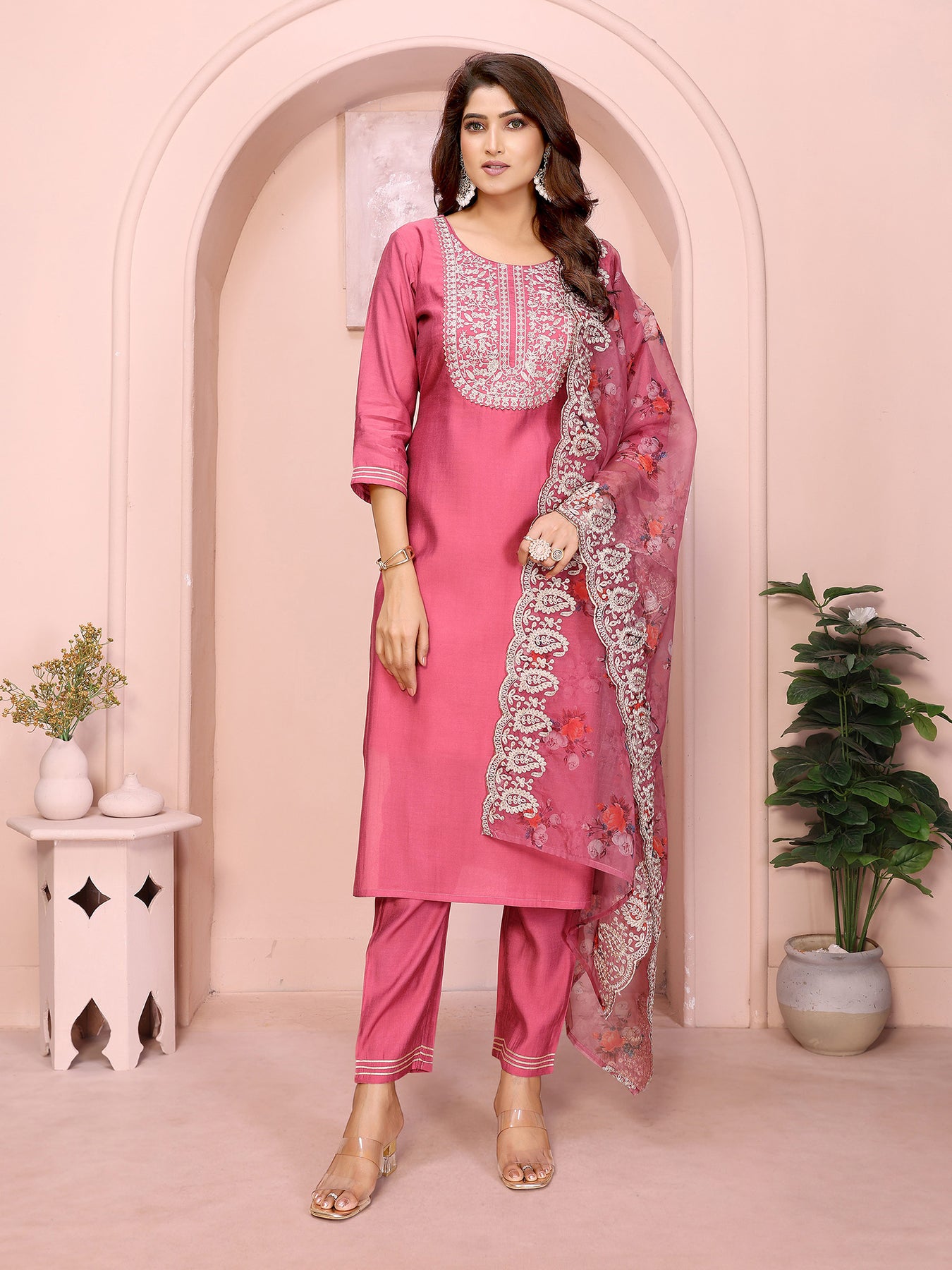 Elora Rose Pink Roman Plain Embroidery Straight Round neck Kurta Set