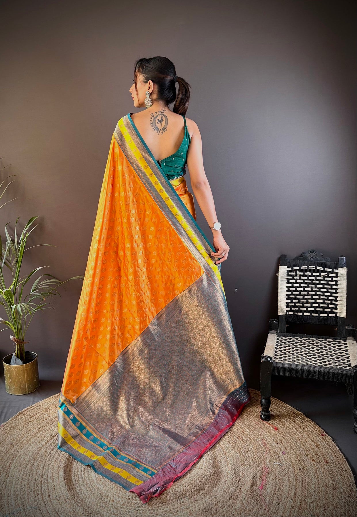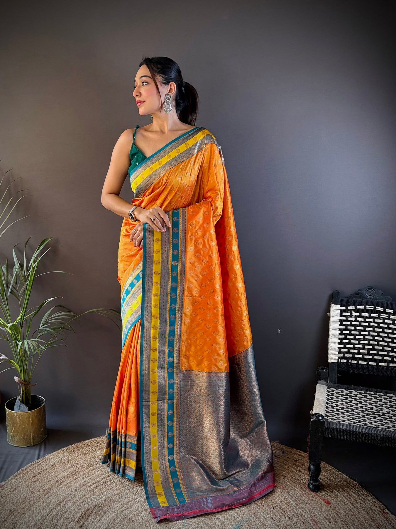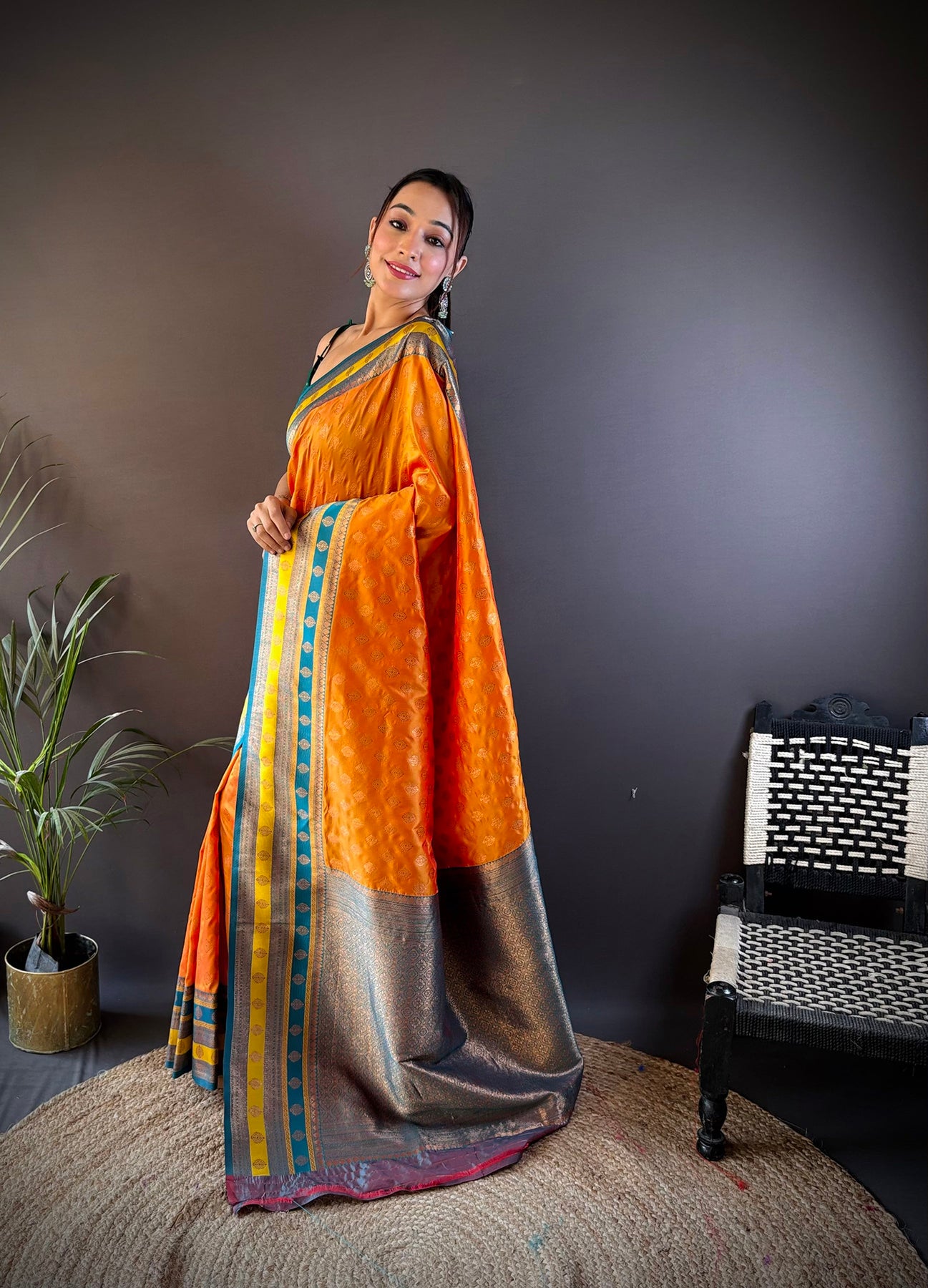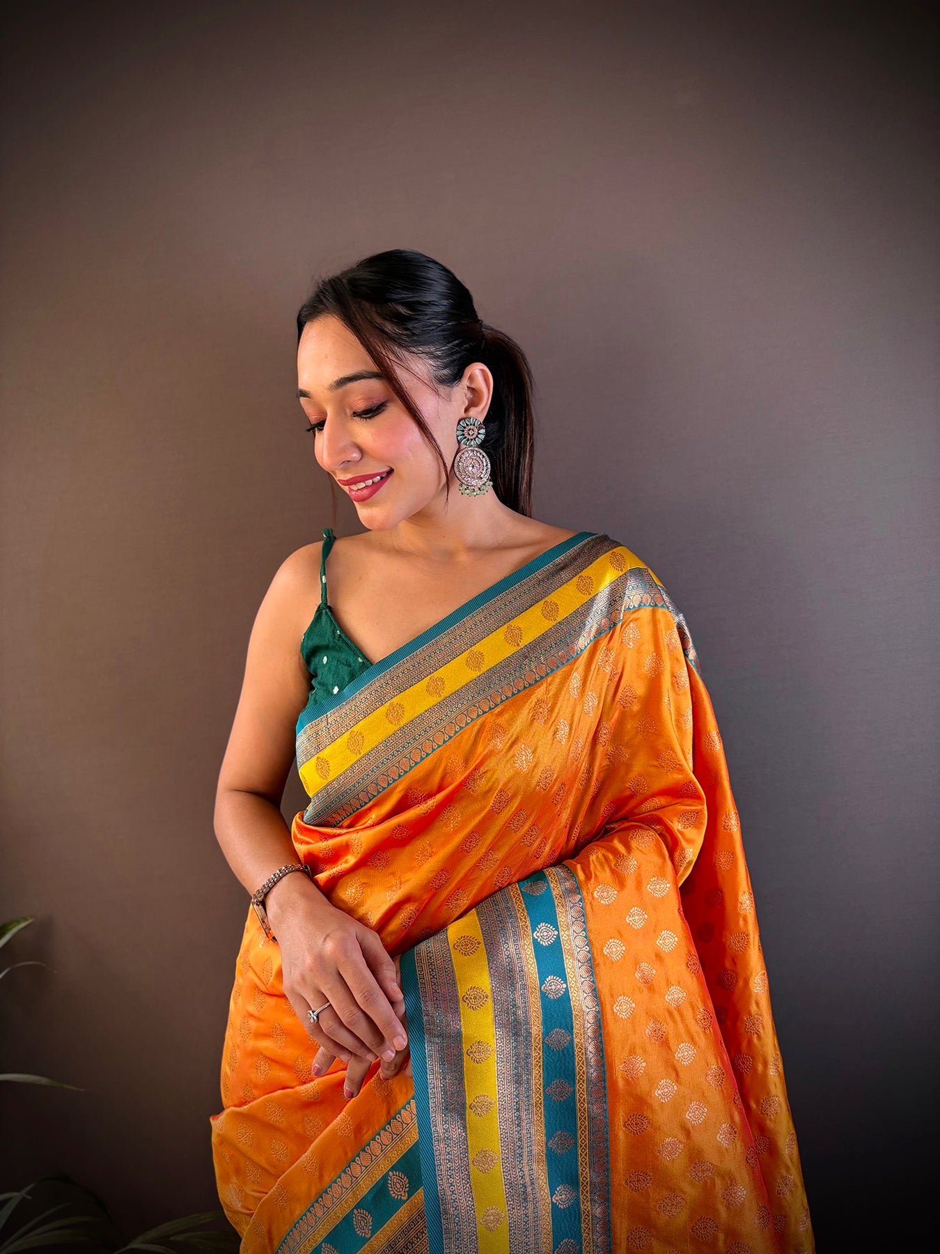 Orange Banarasi Silk Saree: Soft Zari Weave & Butti Spark