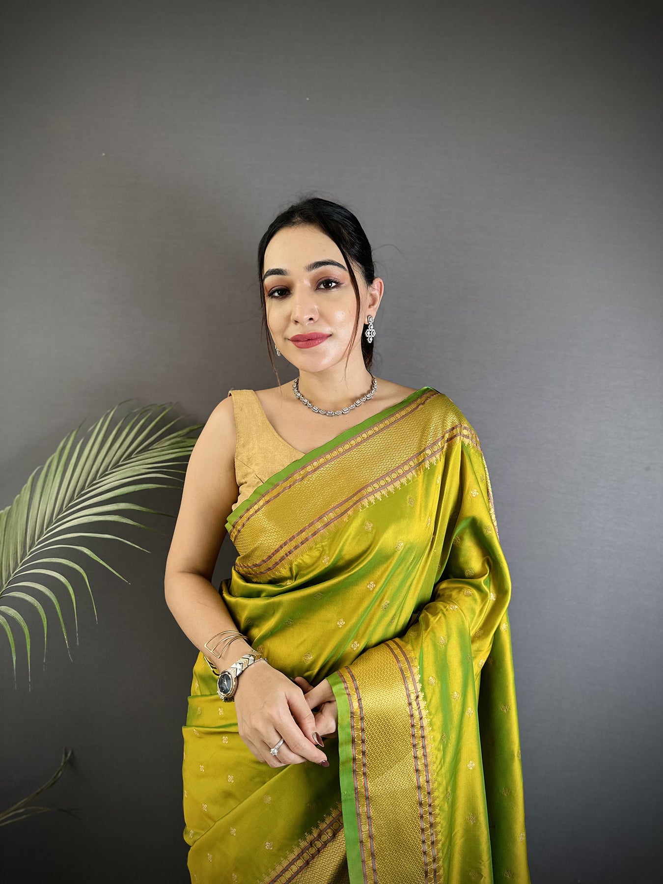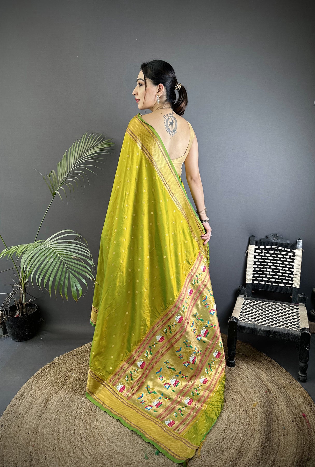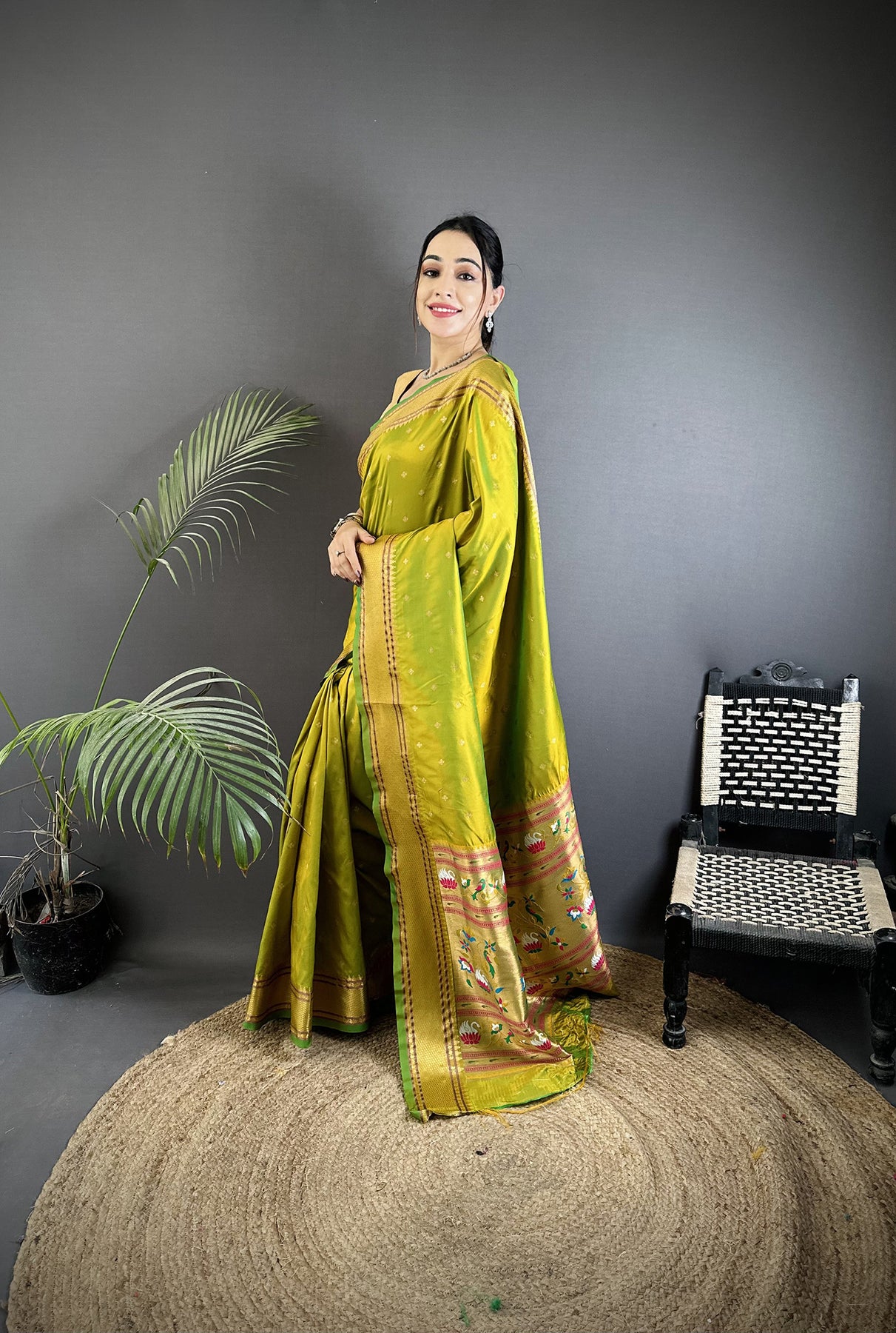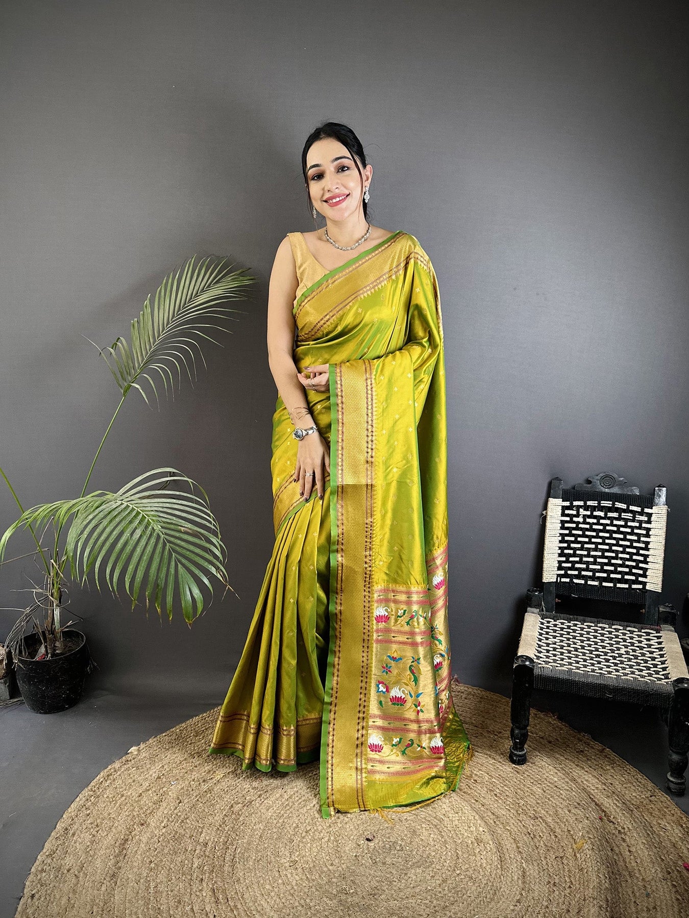 Lime Green Soft Lichi Silk Butti Meenakari Work Paithani Saree