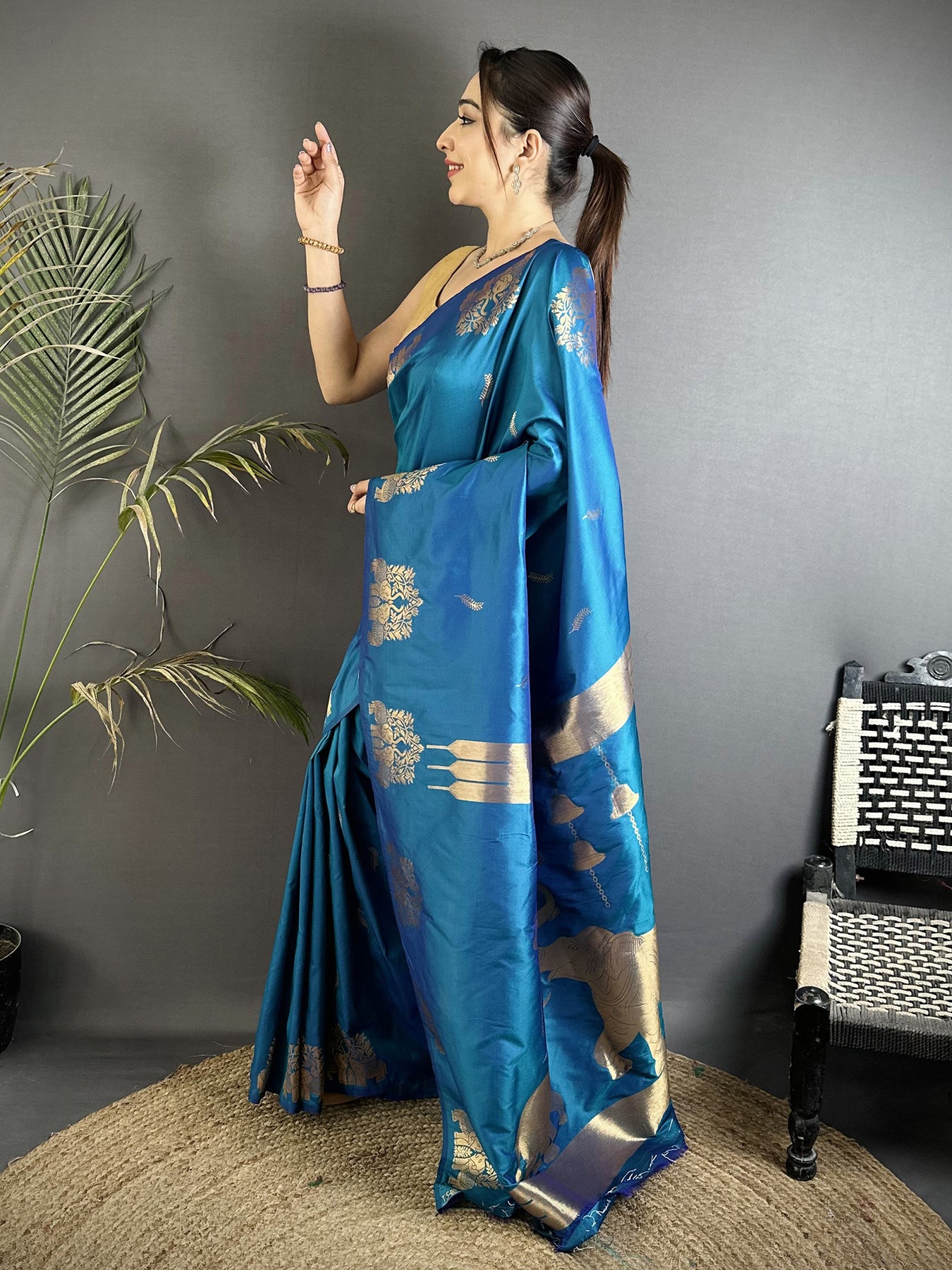 Blue Soft Silk Mofits Zari Weaving Banarasi Saree With Unique Border