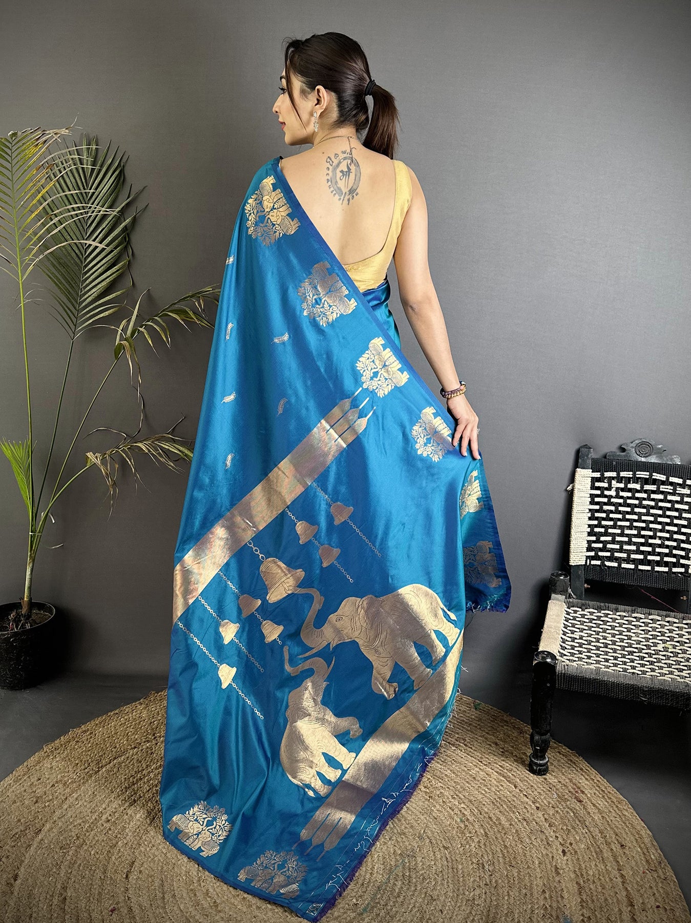 Blue soft silk Banarasi saree featuring intricate motifs and elegant zari weaving, with a unique designer border, ideal for weddings, festive occasions, and traditional Indian ethnic wear.