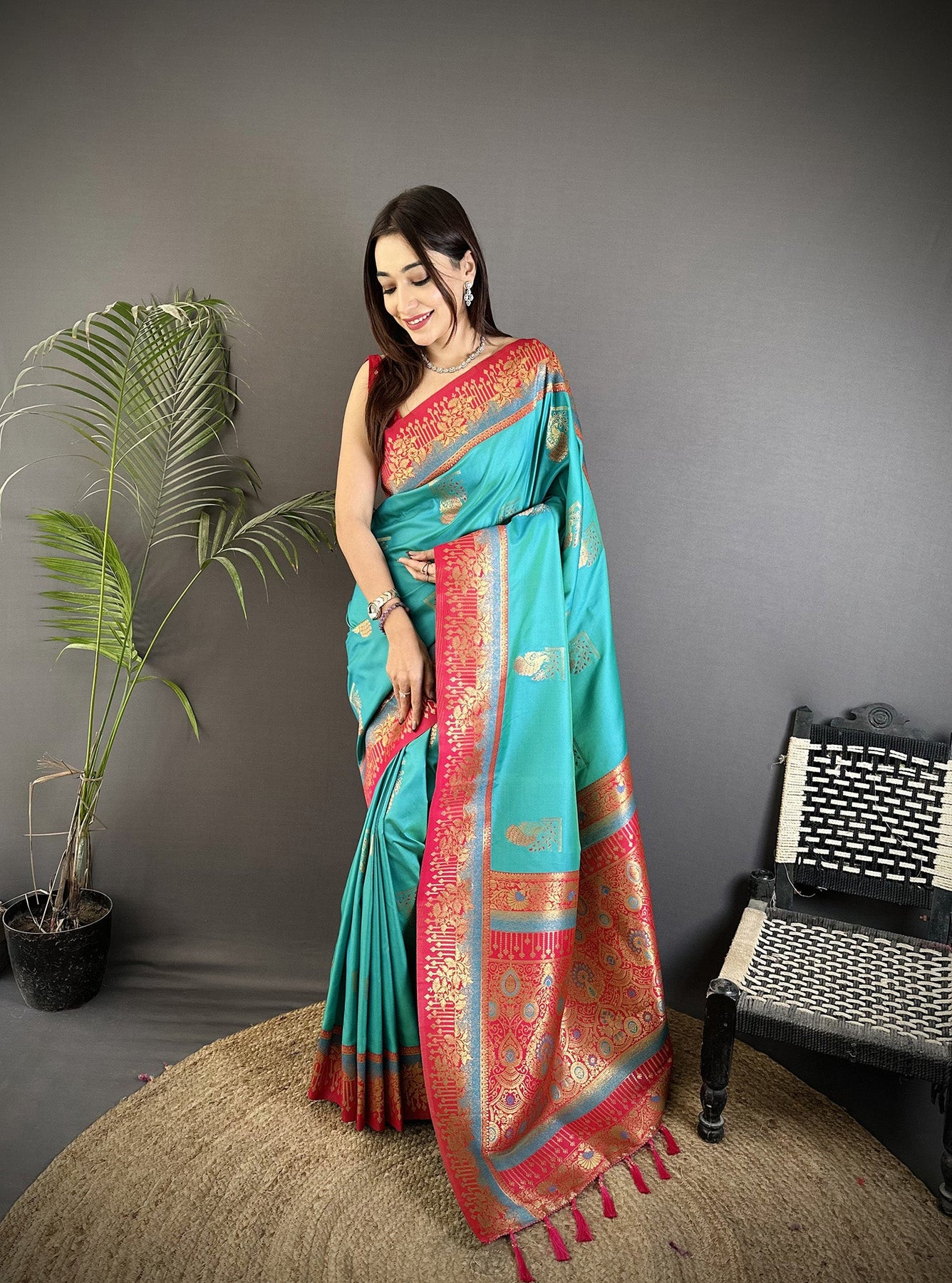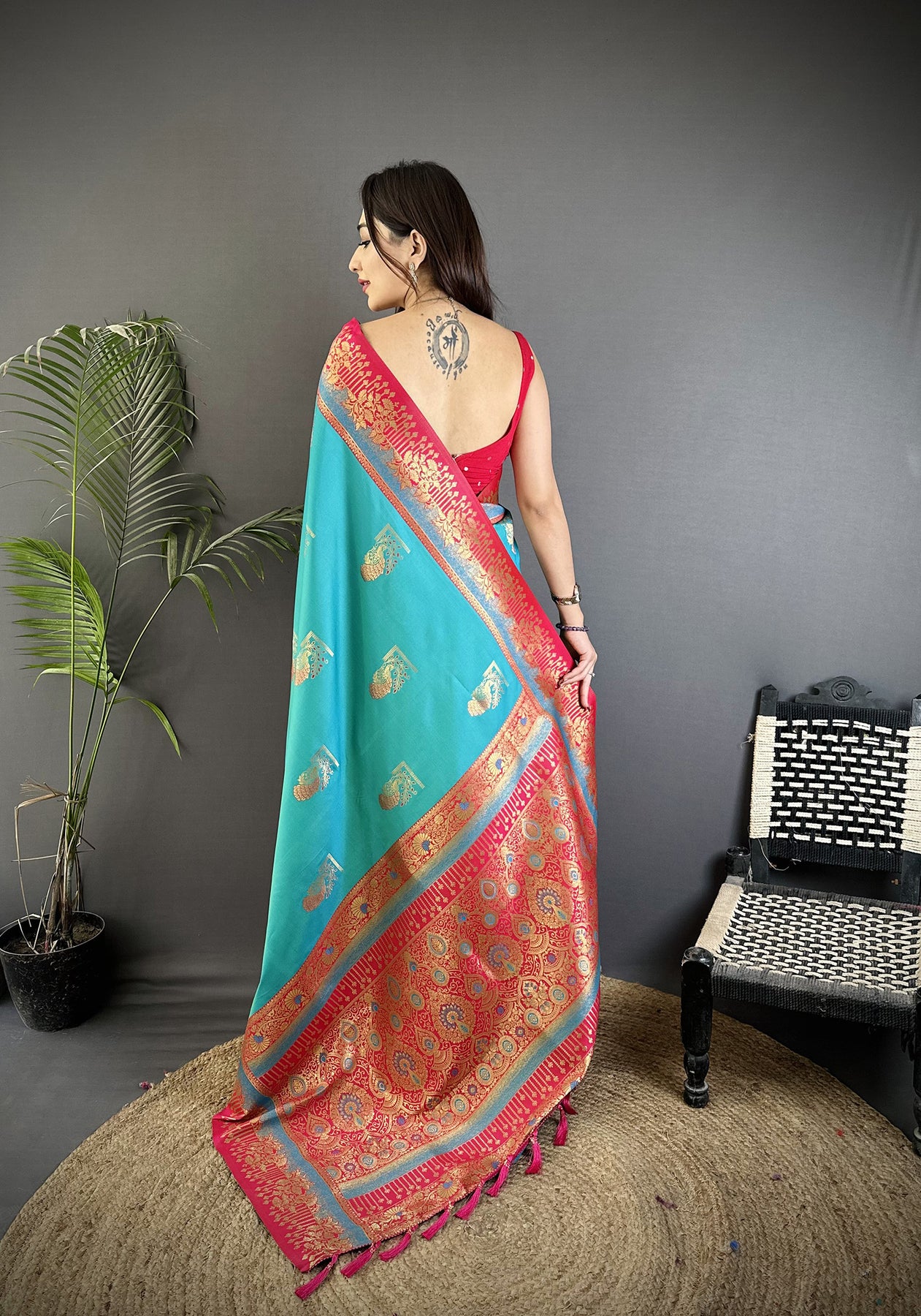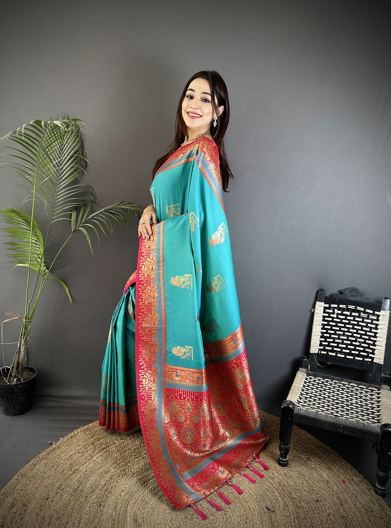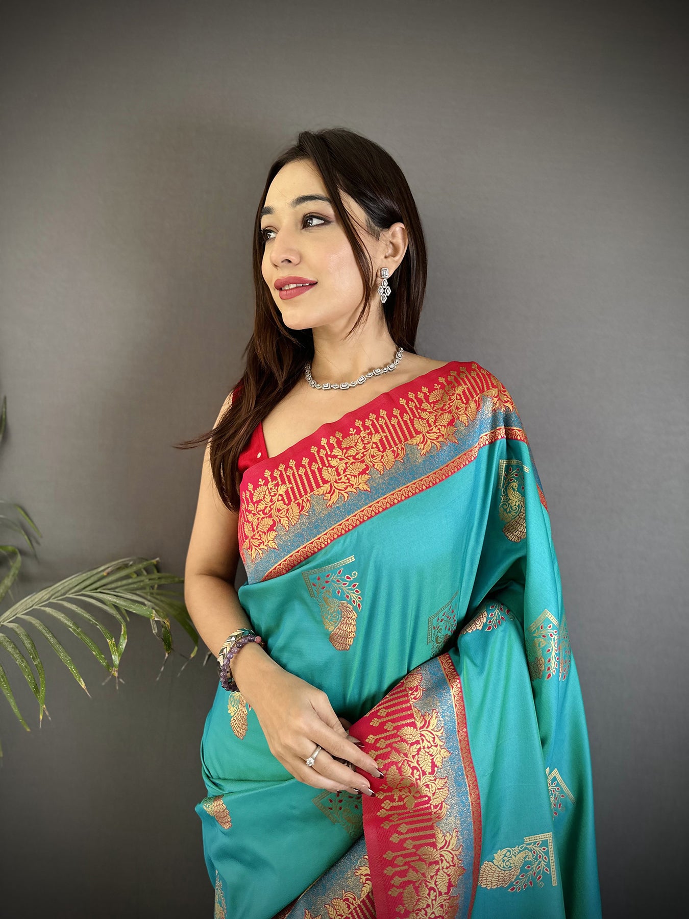 Aqua Green Soft Silk Dual Zari Peacock Butta Worked Banarasi Saree