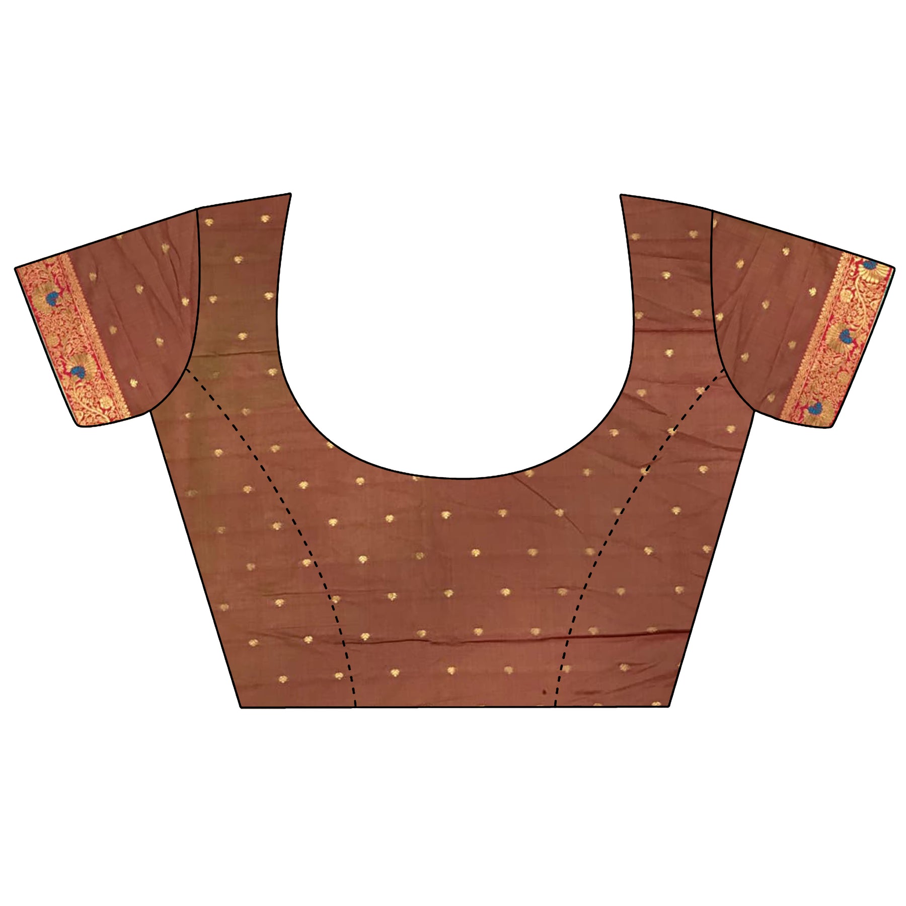 Flaunt your style with this Soft Silk Dual Zari Peacock Butta Worked Banarasi Saree For Women. unique design and beautiful colour Saree. Each piece is elegantly crafted with love and will surely add to your wardrobe. They will surely fetch a lot of second glances as you club it with flashy accessory. Pair this piece with heels or flats for a graceful look.