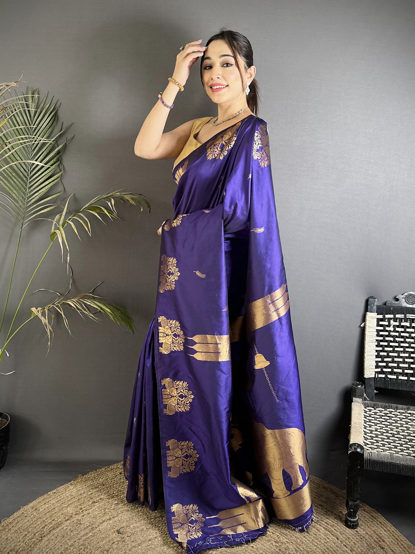 Violet soft silk Banarasi saree with intricate motifs and traditional zari weaving, featuring a unique designer border, perfect for weddings, festive occasions, and elegant Indian ethnic wear.