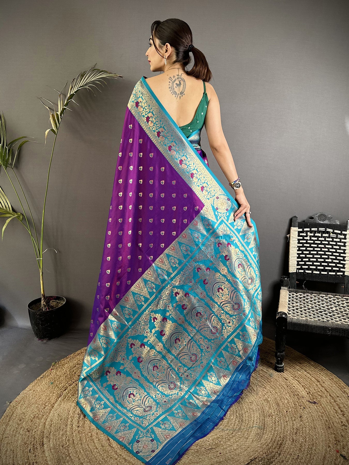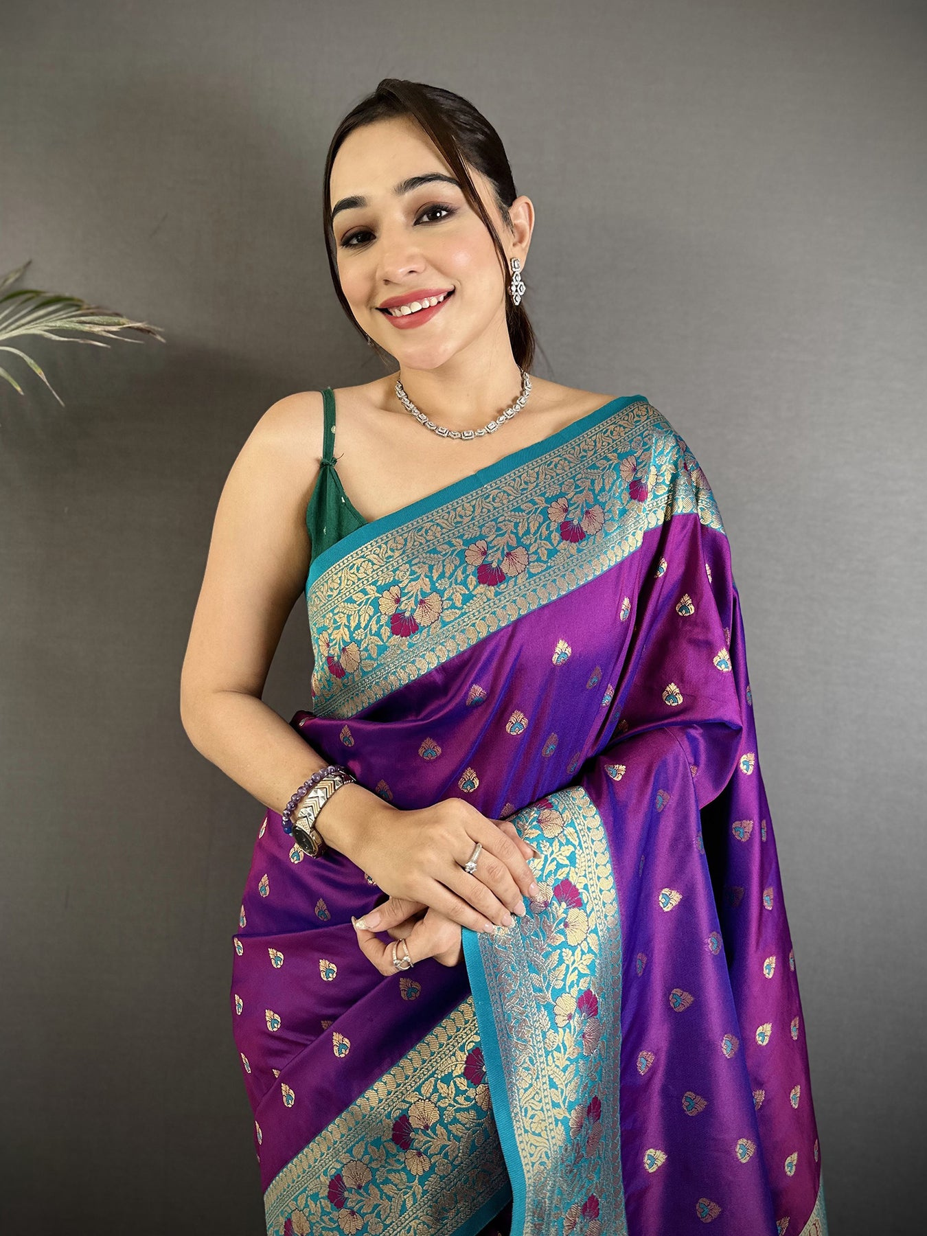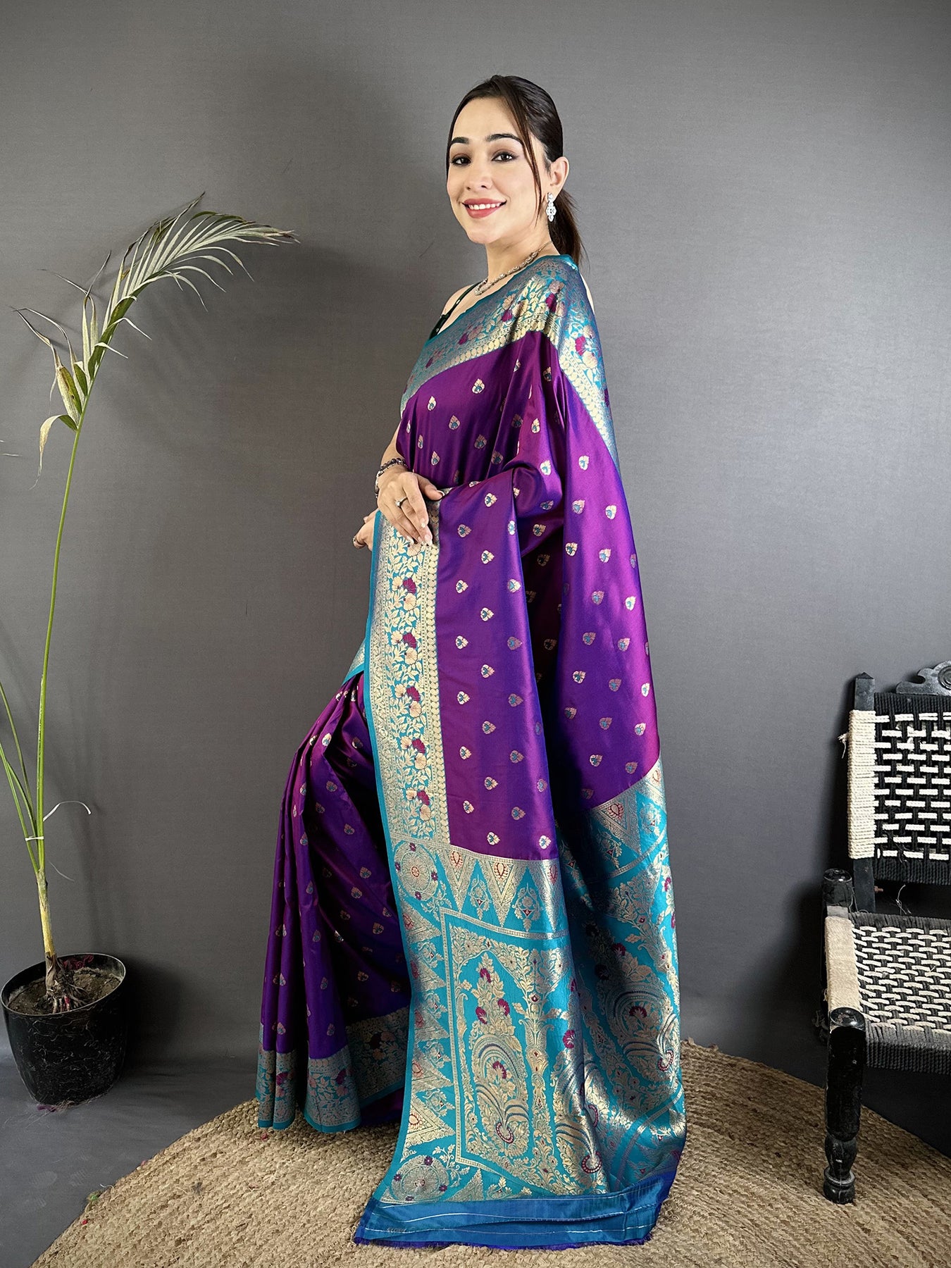 Purple Soft Silk Intricate Motifs Zari Weaving Banarasi Sare With Contrast Weaving Border