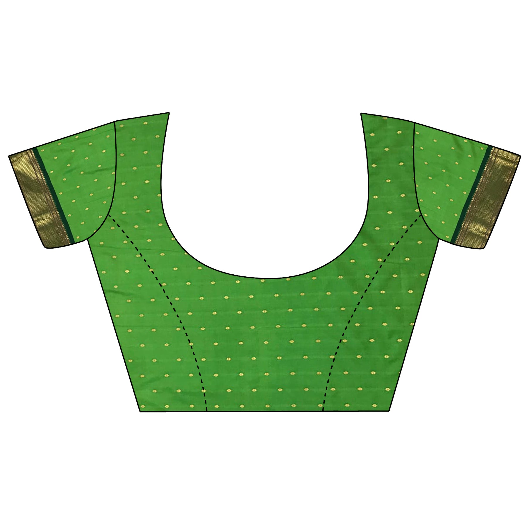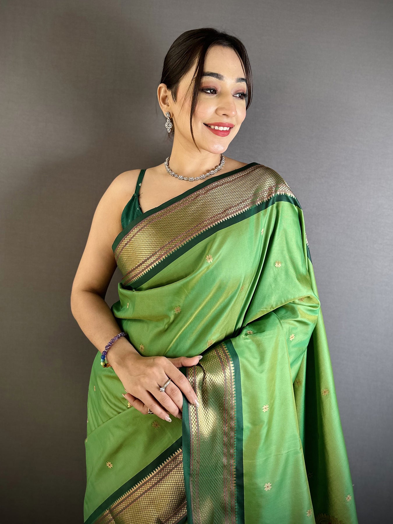 The rich green hue highlights traditional Paithani craftsmanship, enhanced with delicate zari patterns. Ideal for cultural events, receptions, and celebrations, it adds royal charm and sophisticated beauty to your wardrobe.