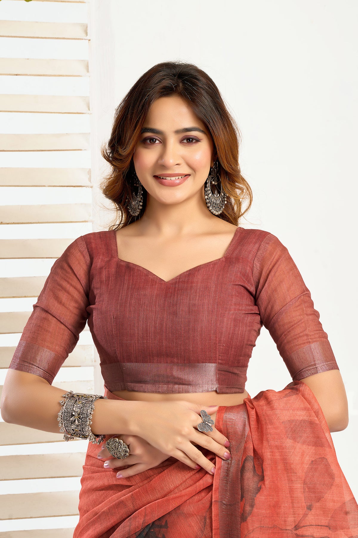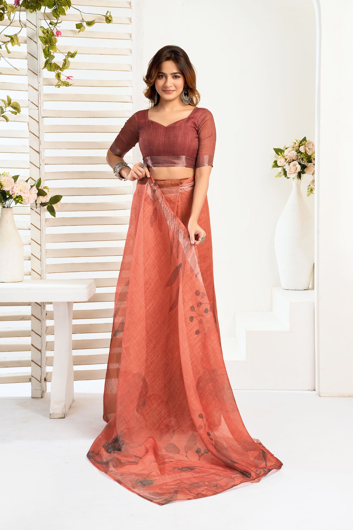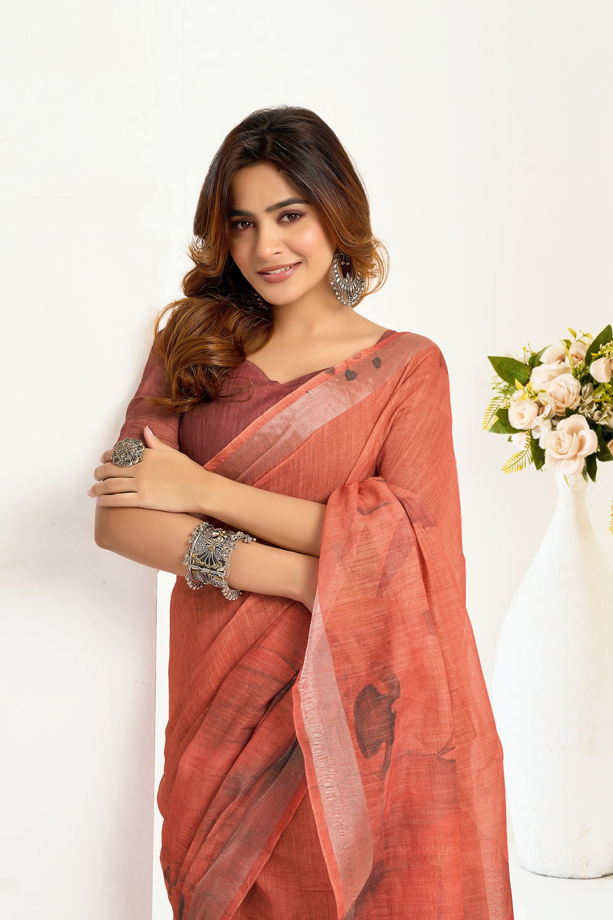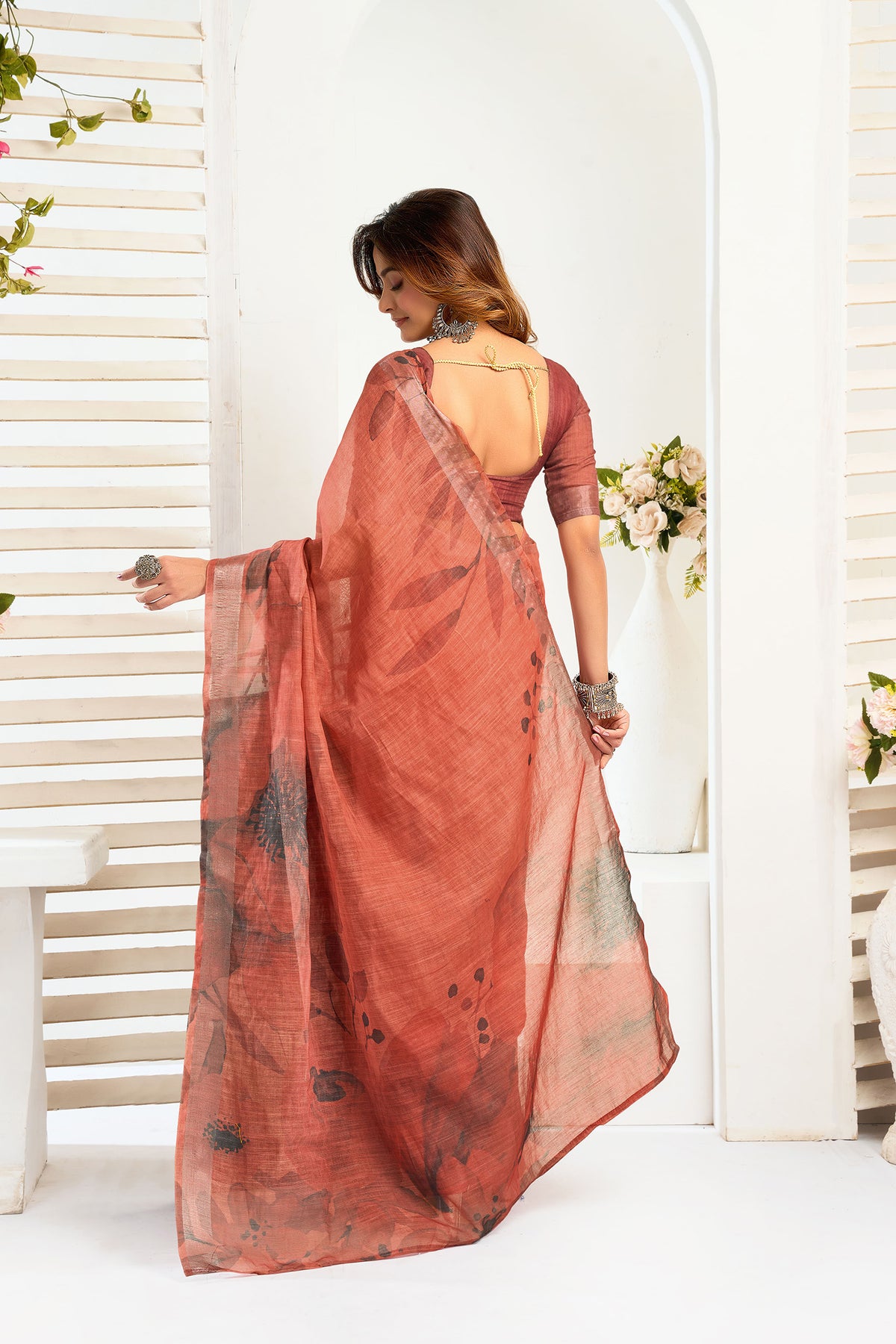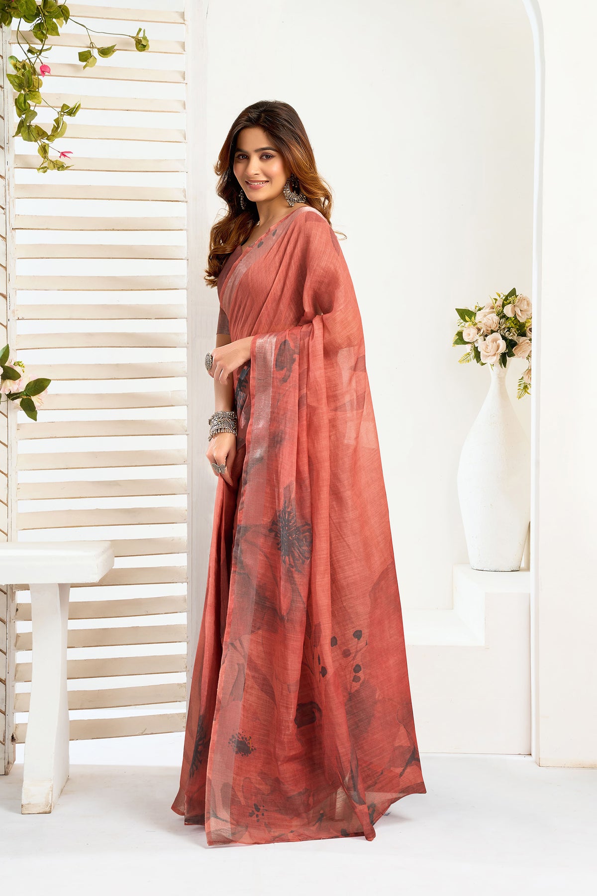 Flaunt your style with this Linen Floral Printed Ready To Wear Saree For Women. unique design and beautiful colour Saree. Each piece is elegantly crafted with love and will surely add to your wardrobe. They will surely fetch a lot of second glances as you club it with flashy accessory. Pair this piece with heels or flats for a graceful look.
