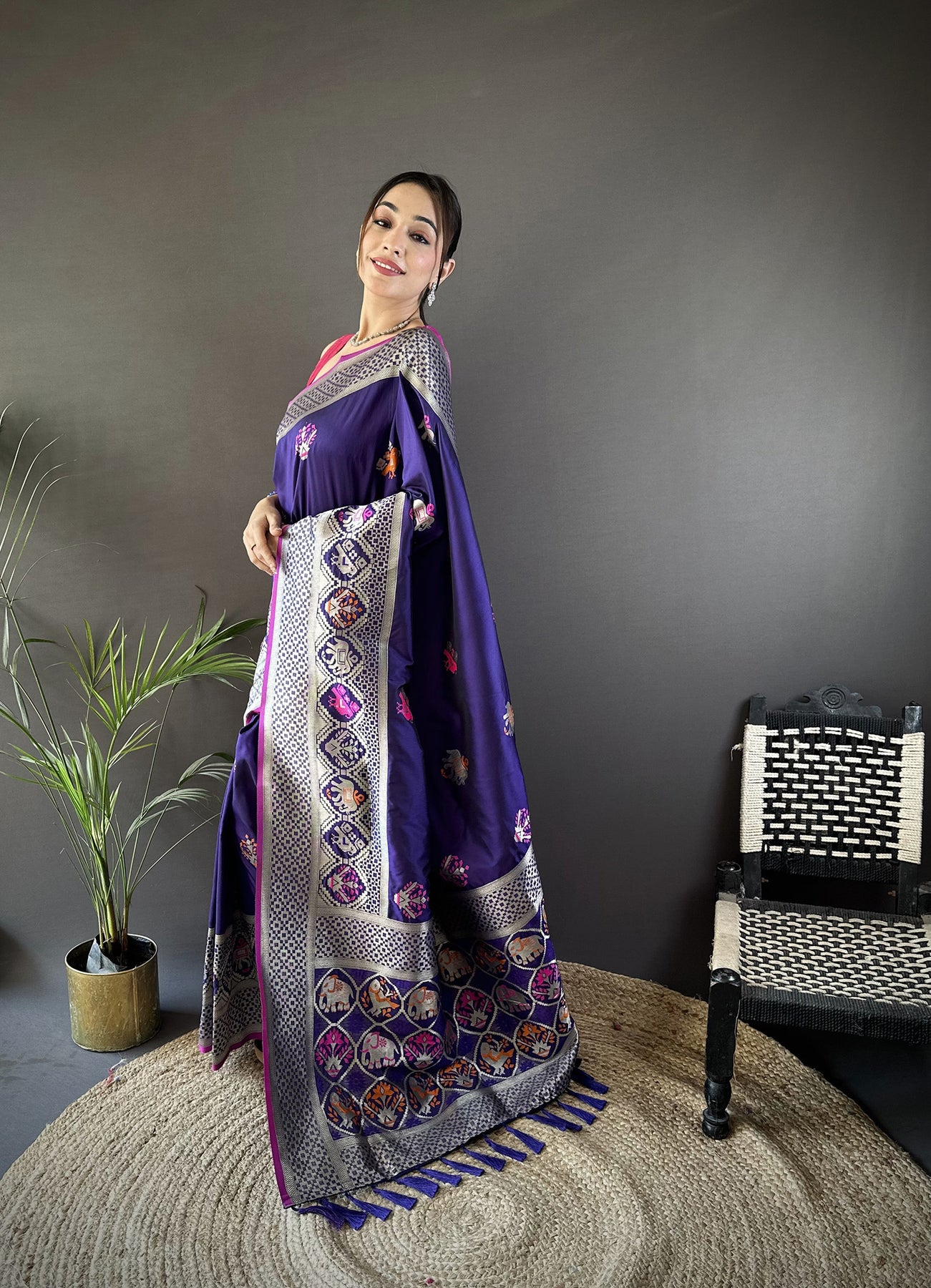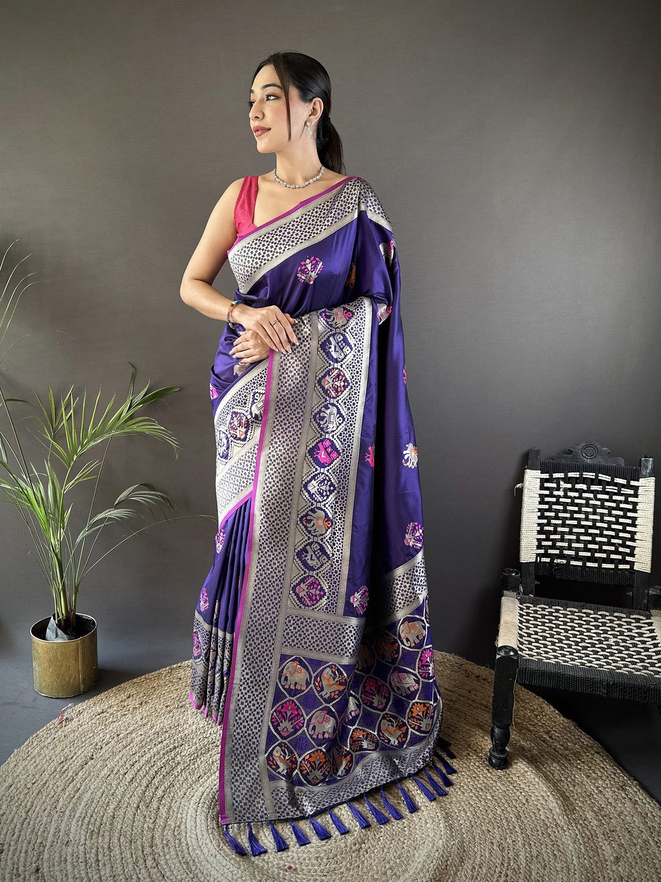 Get this Soft Lichi Silk Elephant & Floral Motifs Minakari Work Banarasi Saree Online at Elora Fashion – The best online store for Tussar silk saree, banarasi silk saree, kanjivaram silk saree, paithani silk saree, bandhani saree, patola saree, linen saree and organza saree.