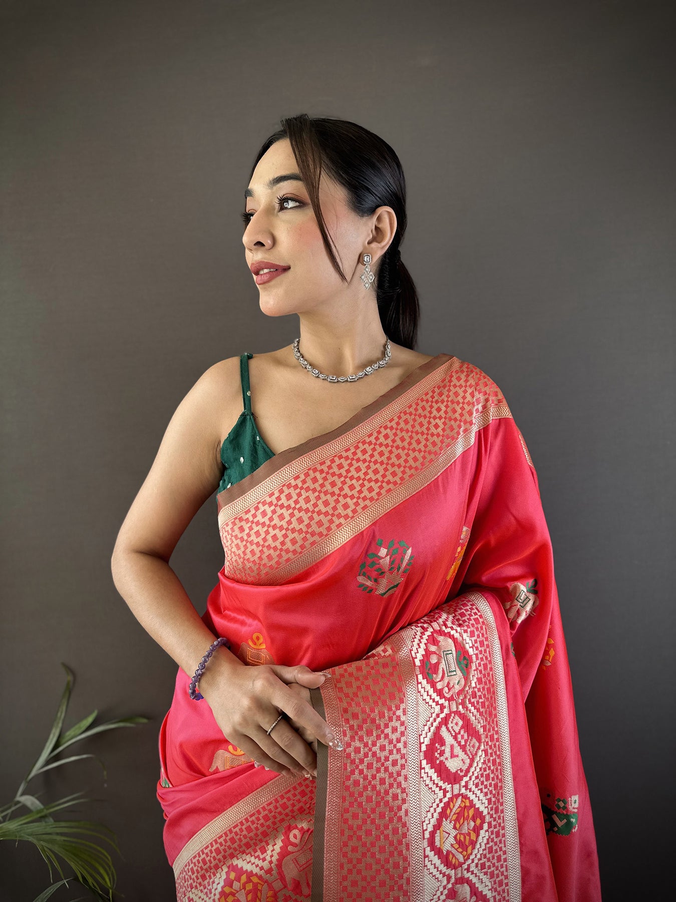 Peach Soft Lichi Silk Elephant & Floral Motifs Minakari Work Banarasi Saree