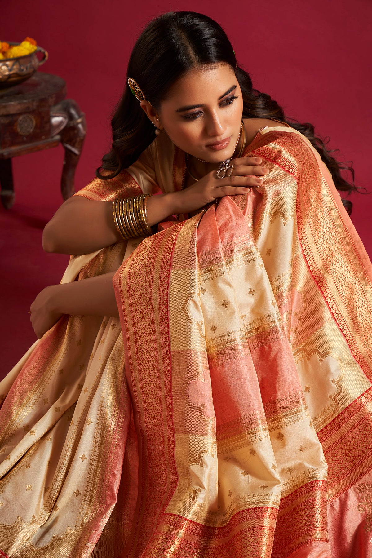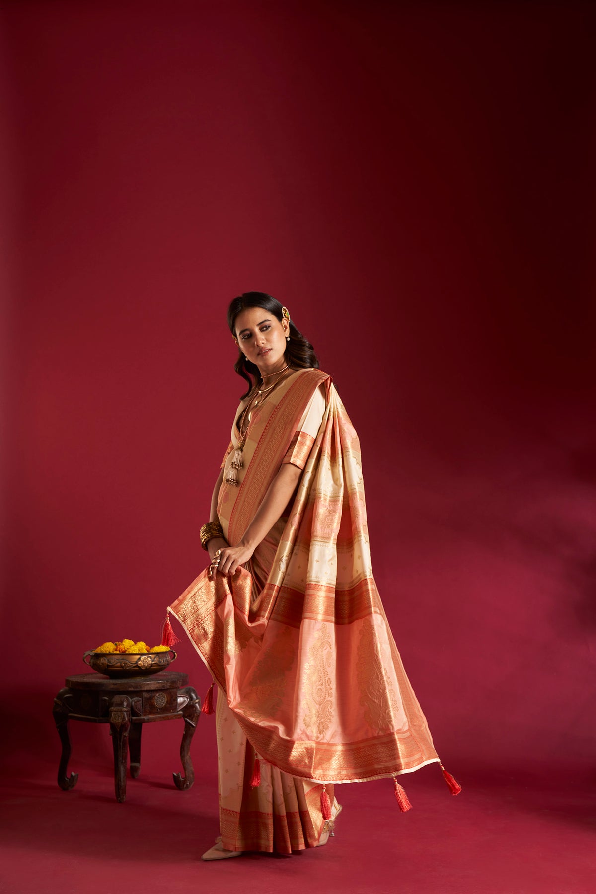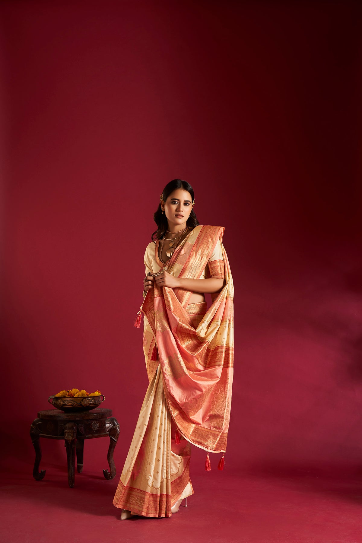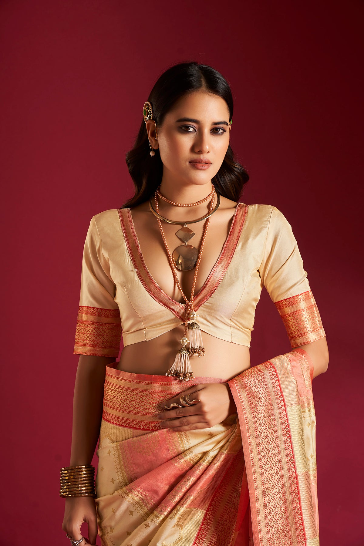 Elora Soft Banarasi Weaving Silk Saree in cream and pink featuring elegant Banarasi weaving, rich silk texture, traditional Indian design, perfect for wedding wear, festive occasions, parties, and cultural celebrations for women