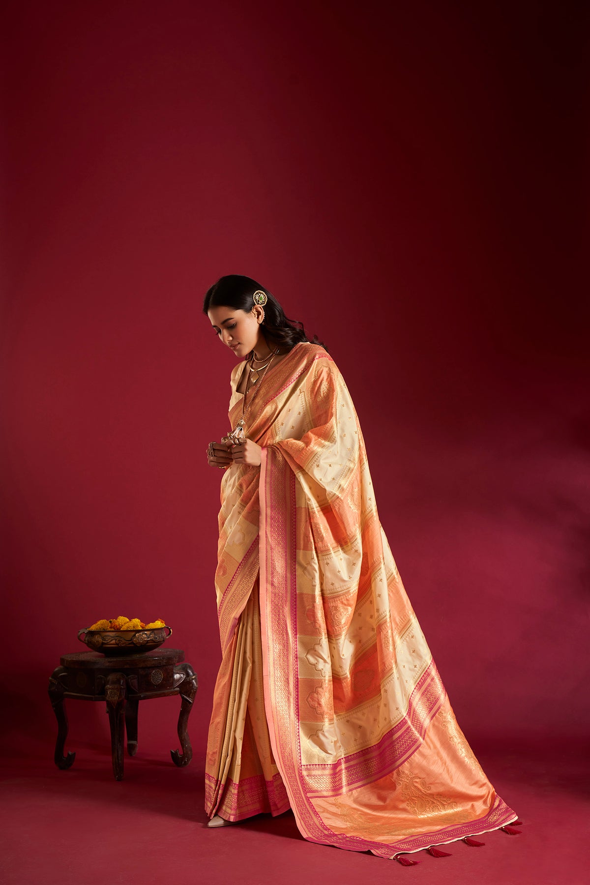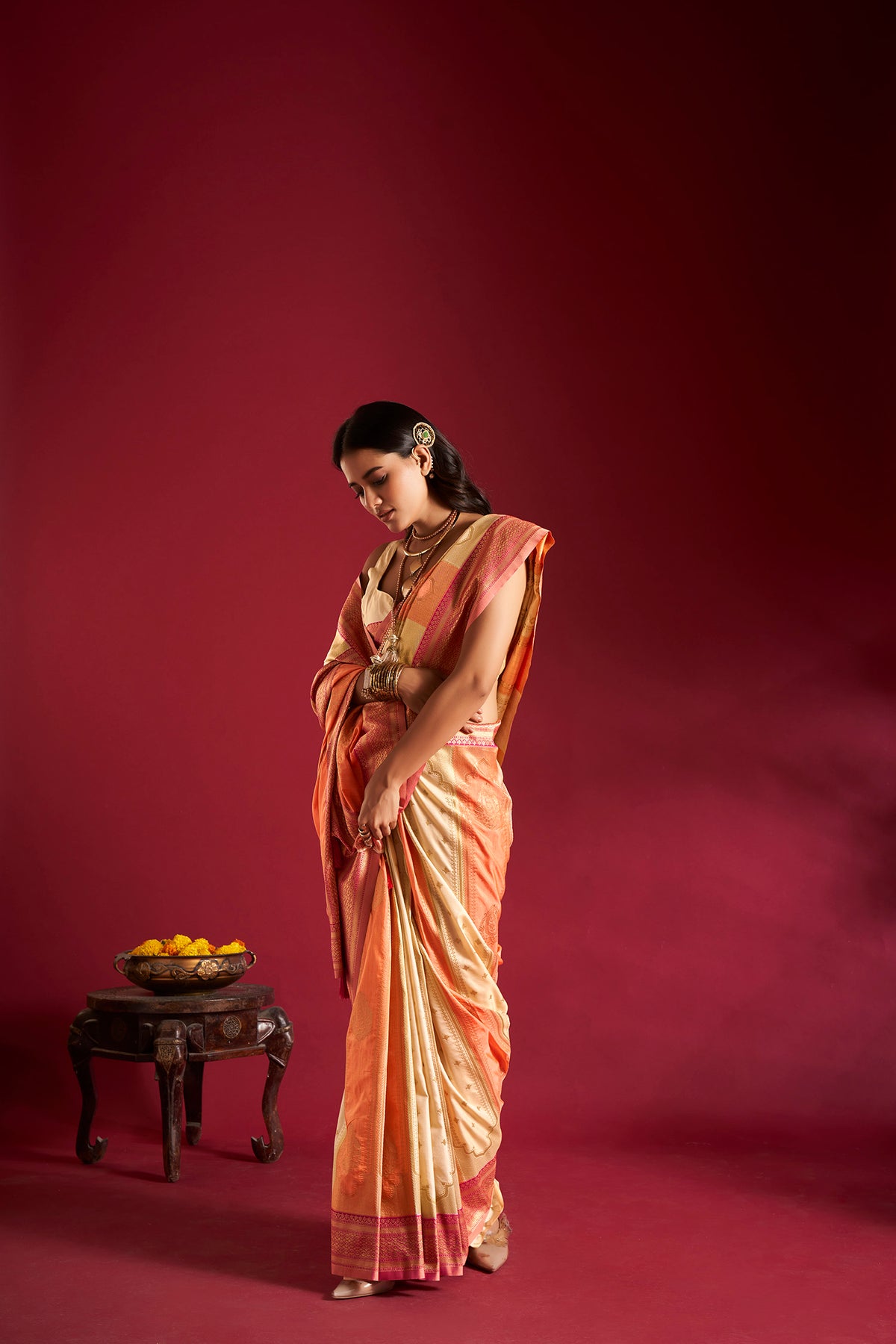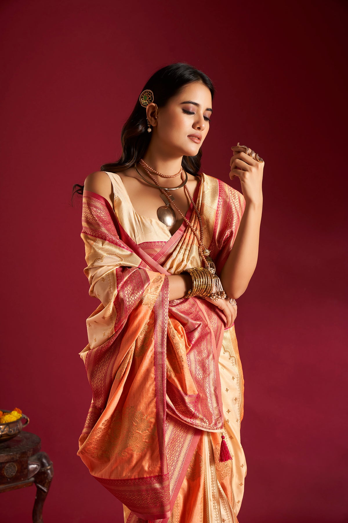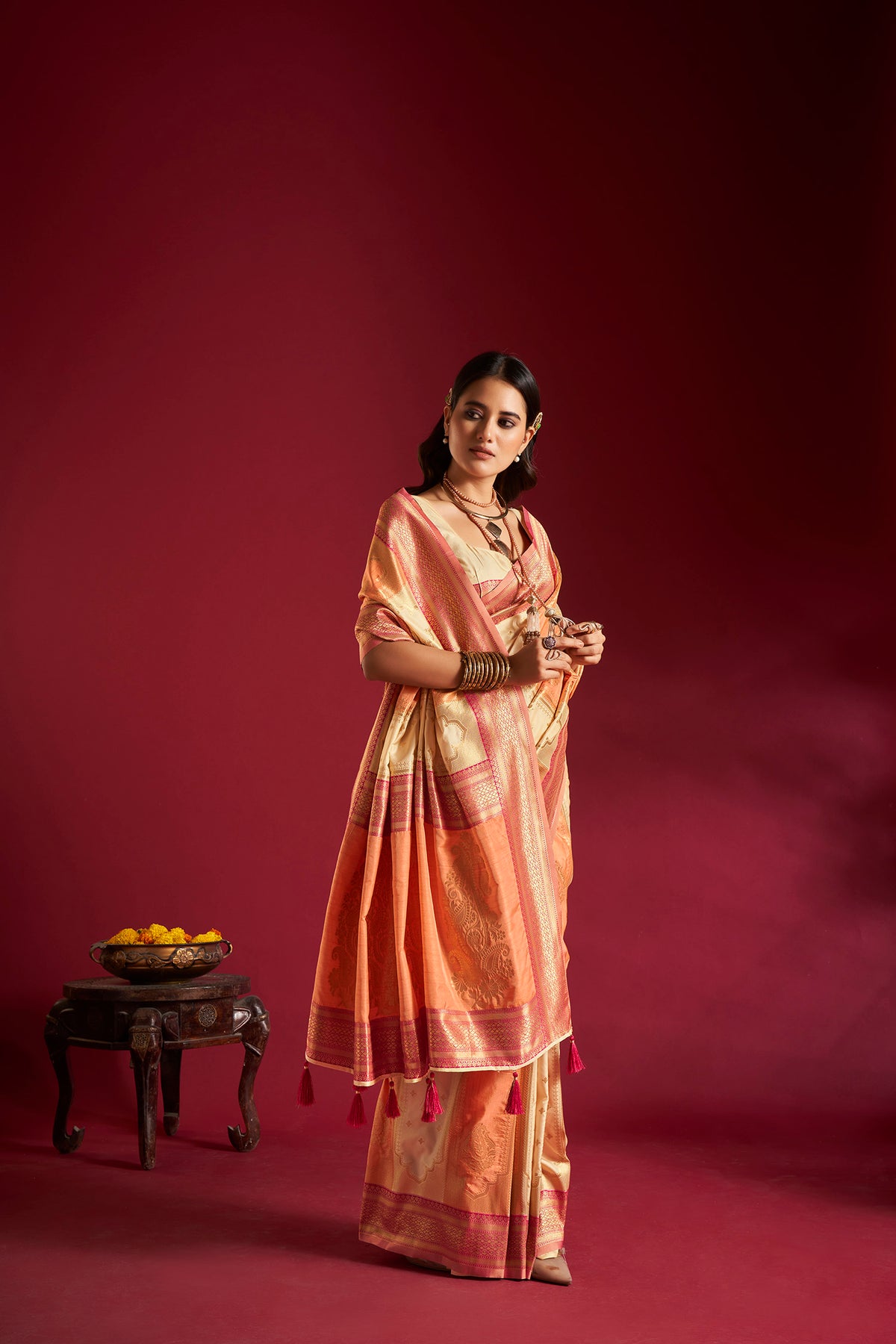 Cream & Orange Soft Banarasi Weaving Silk Saree