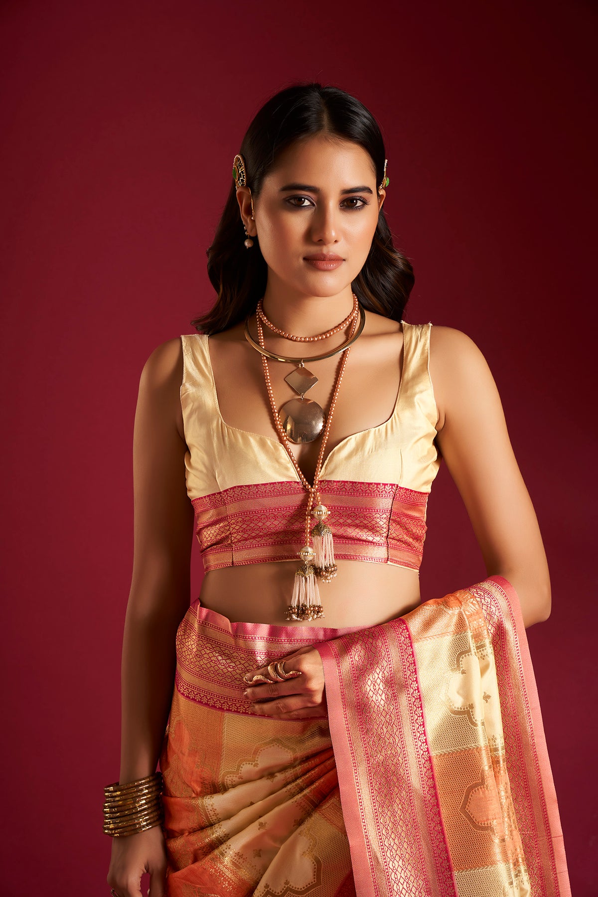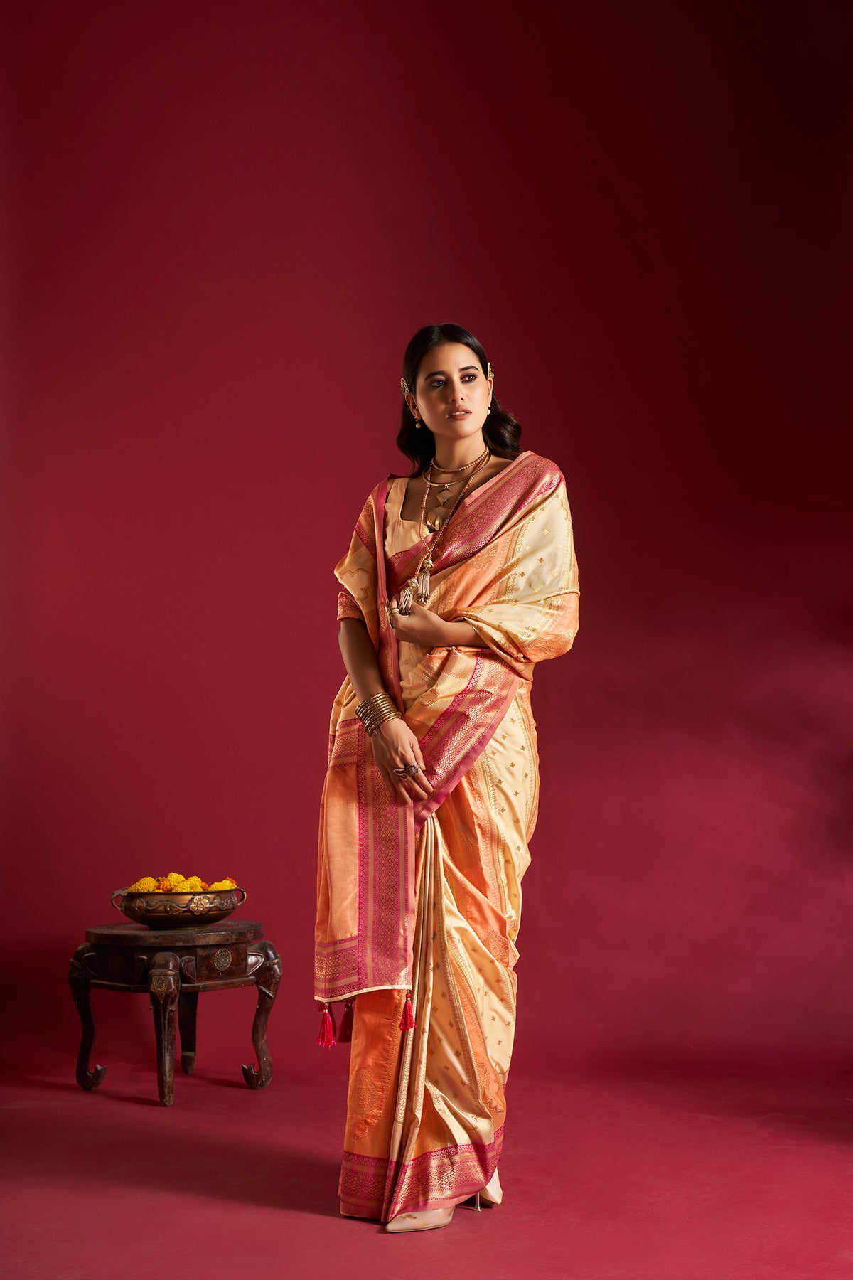 Elora Soft Banarasi Weaving Silk Saree in cream and orange brings timeless Indian elegance to your wardrobe. Crafted with soft silk, it offers a rich Banarasi weave, smooth drape, and graceful shine for all occasions.