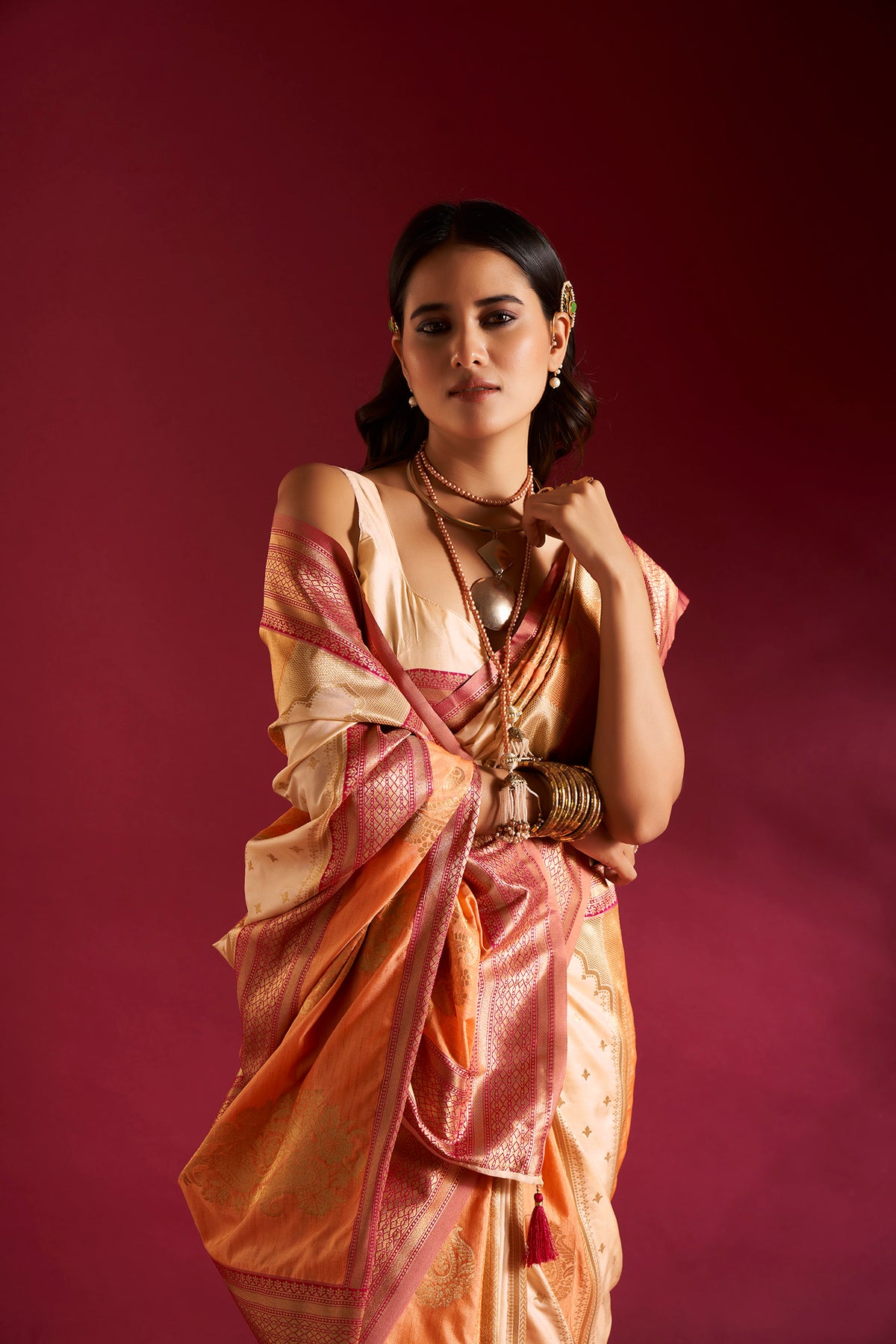 This cream and orange Banarasi silk saree blends traditional charm with modern comfort. The soft texture feels light on the skin, while detailed weaving adds luxury, making it ideal for weddings, festivals, and family celebrations.