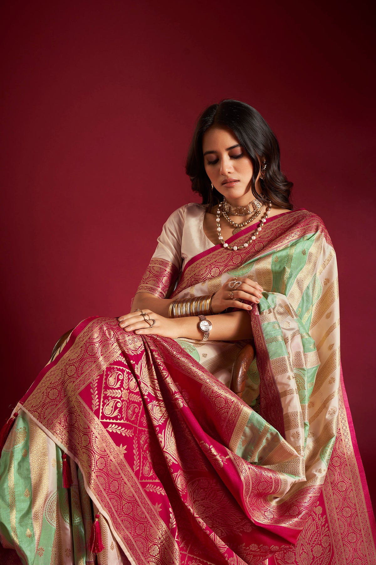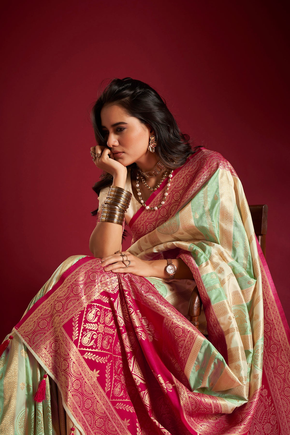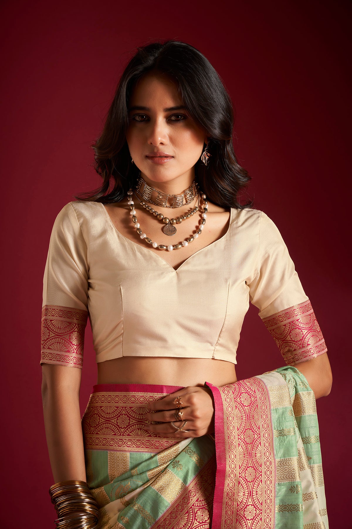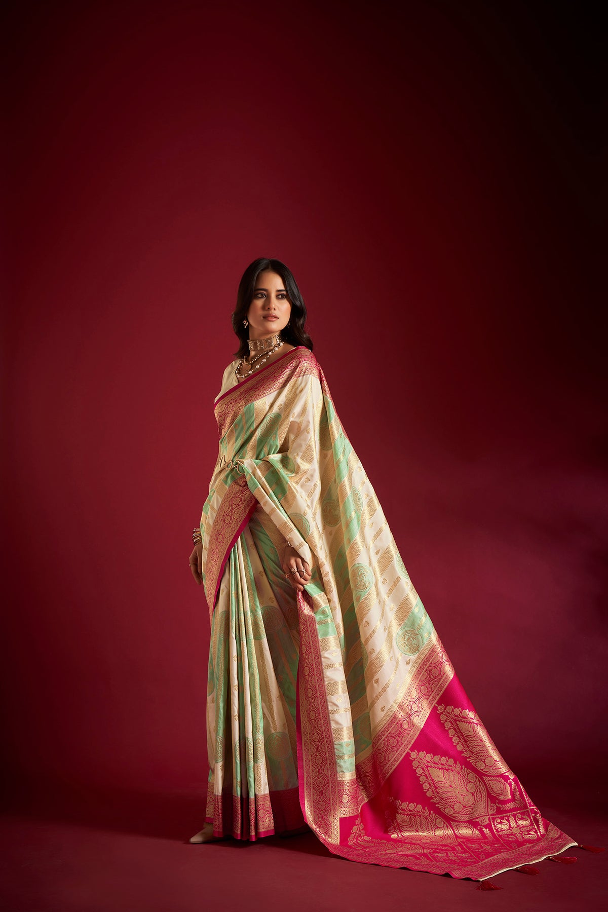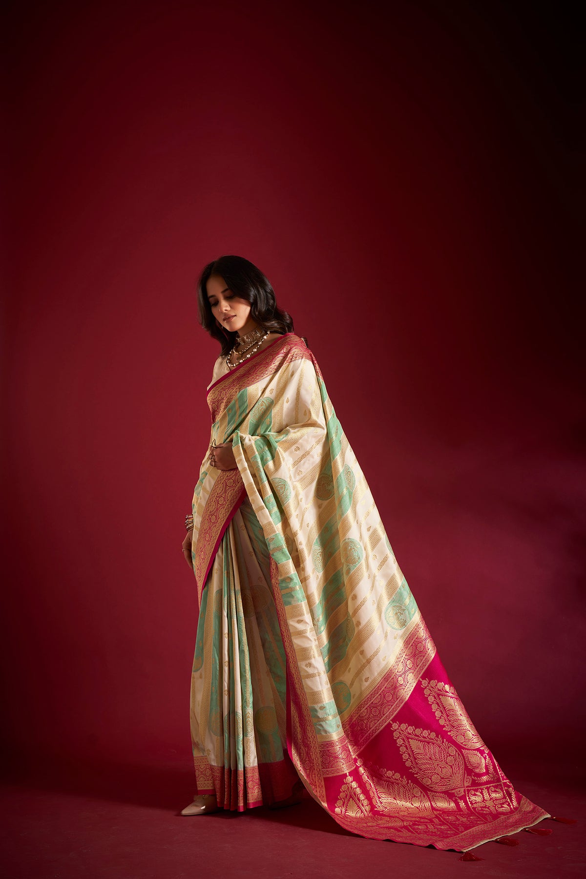 Cream & Sea Green Soft Silk Banarasi Weaving Saree