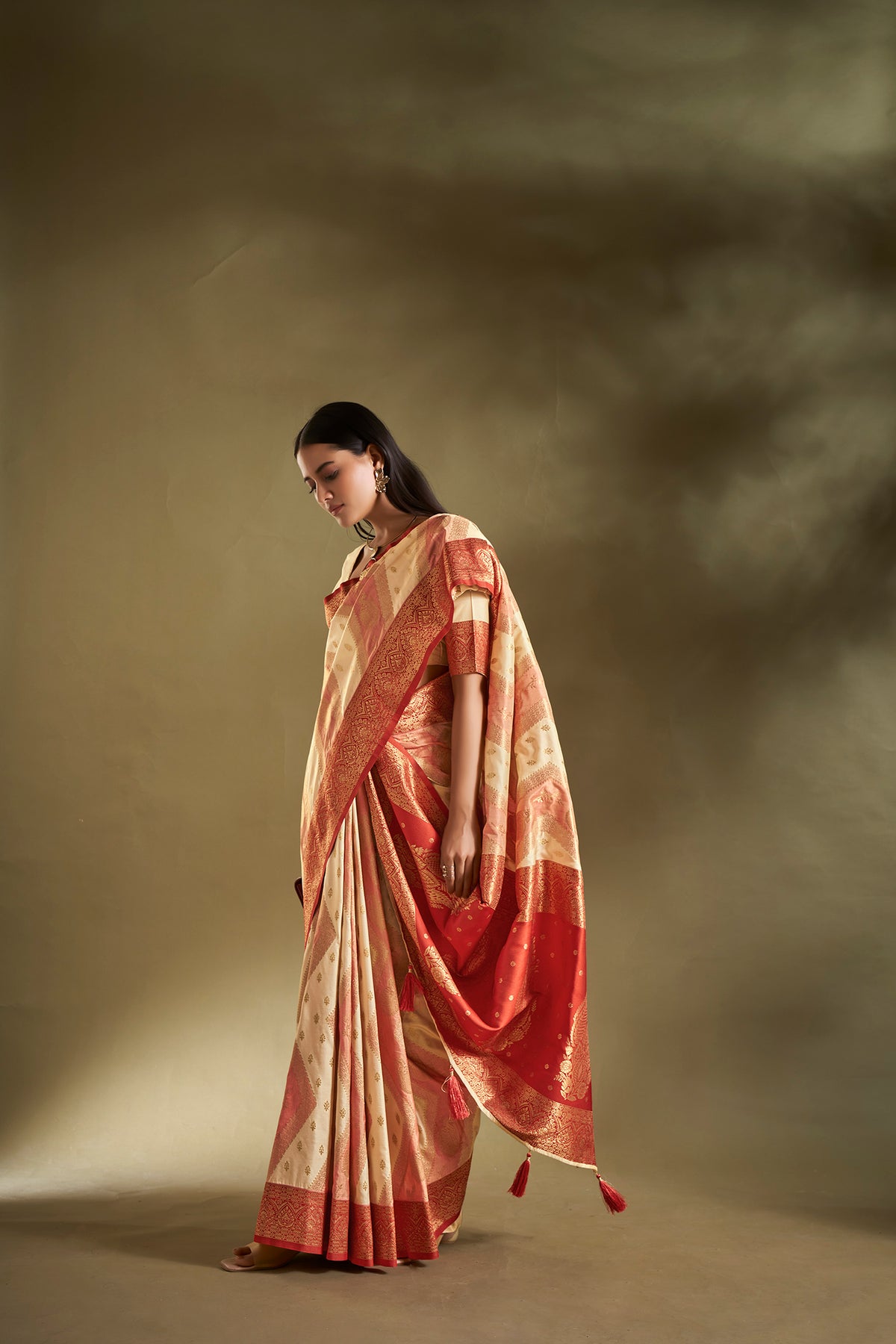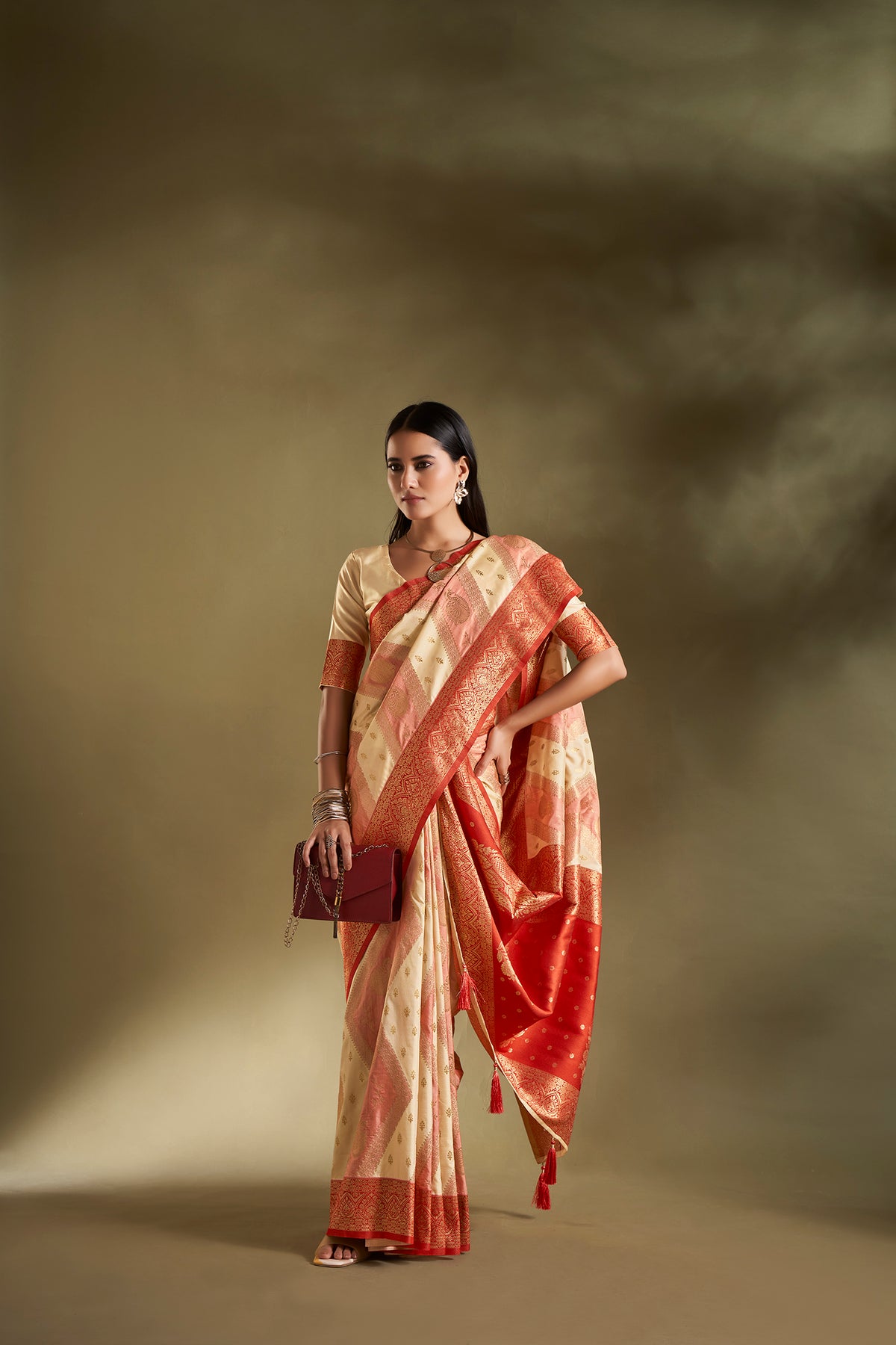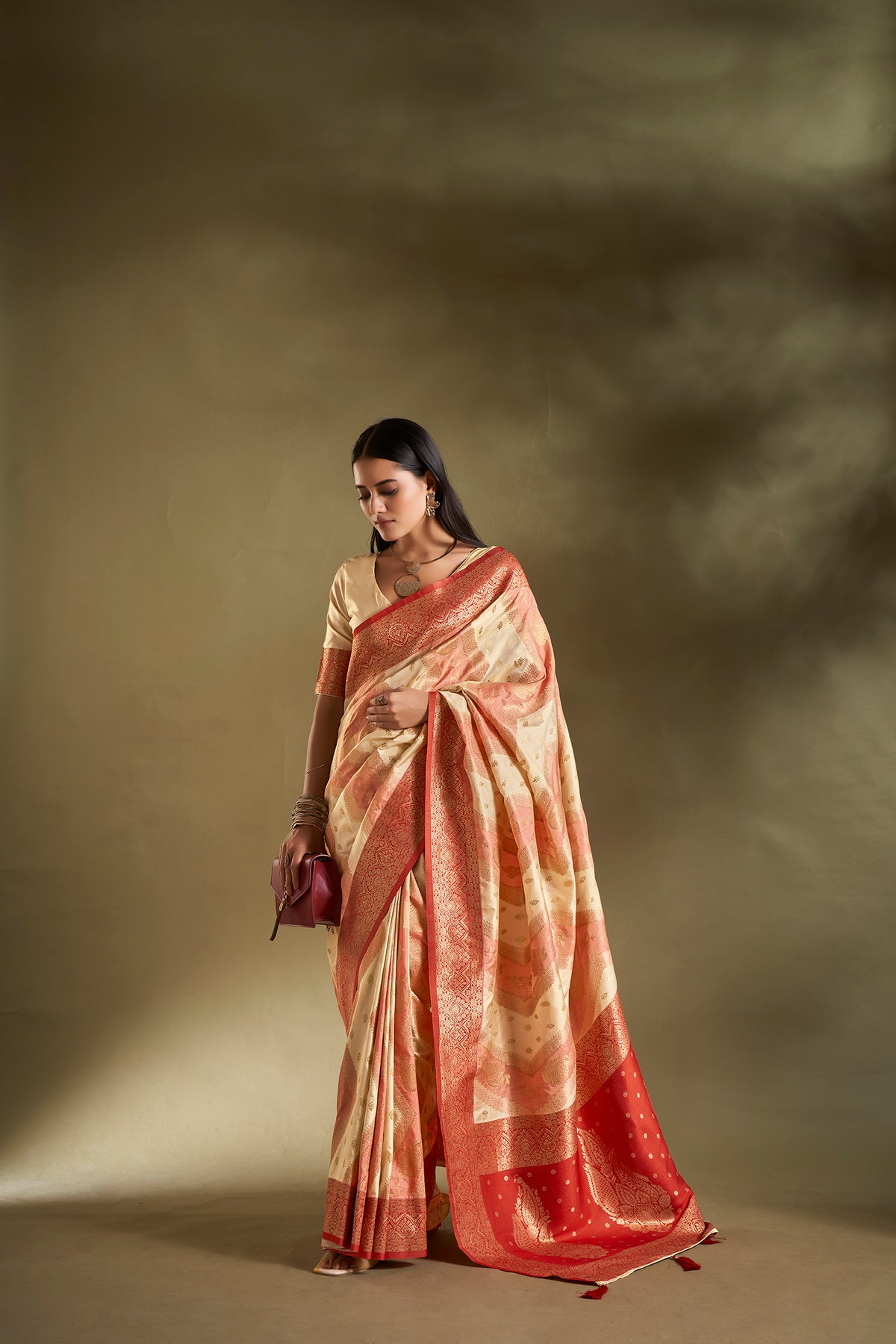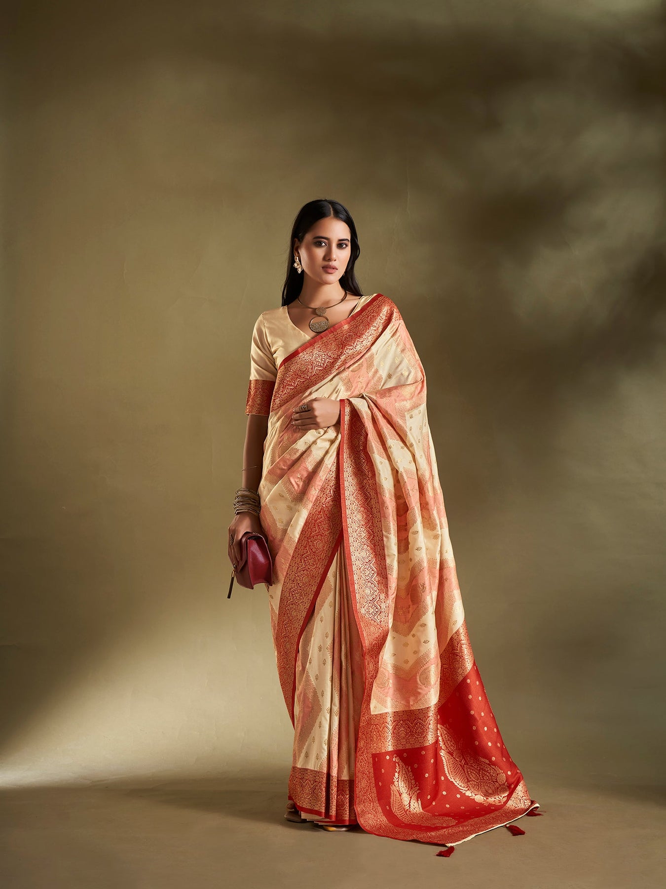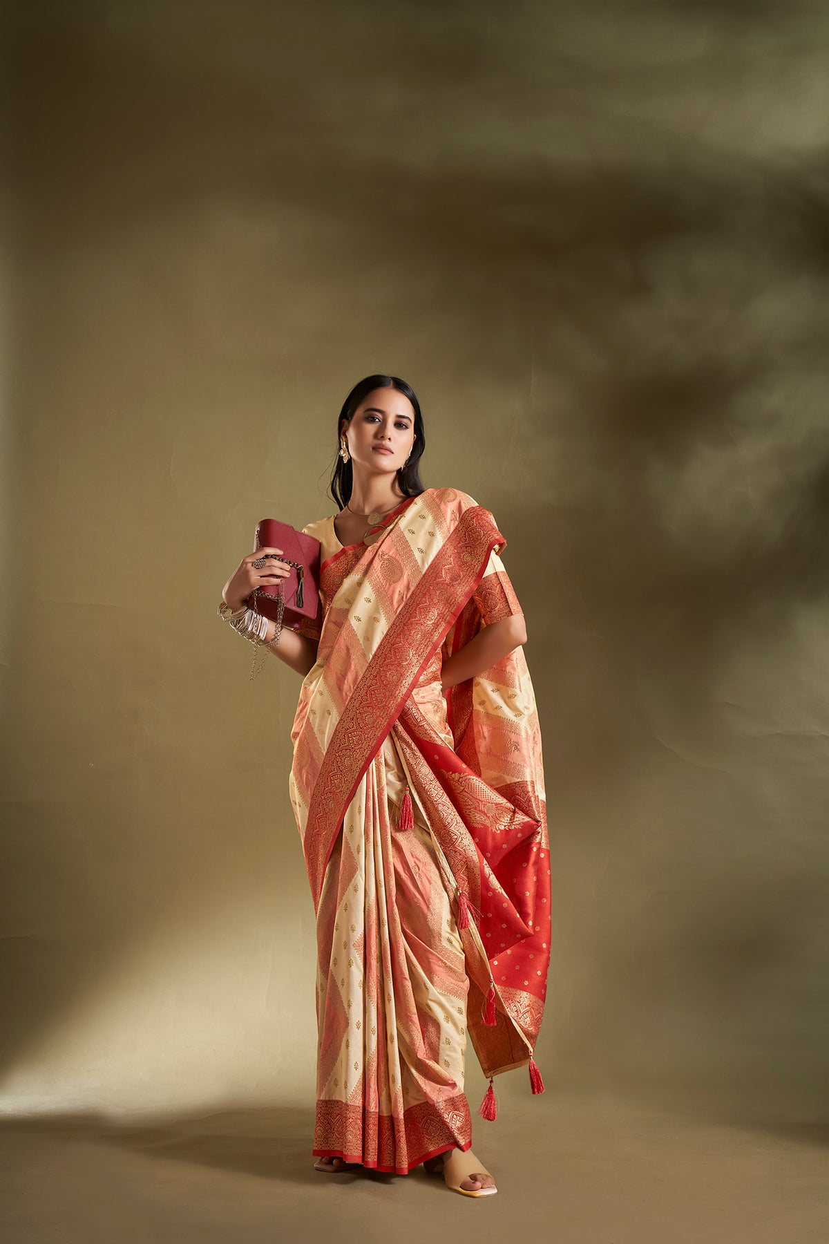 Cream & Pink Soft Silk Woven Designed Banarasi Saree