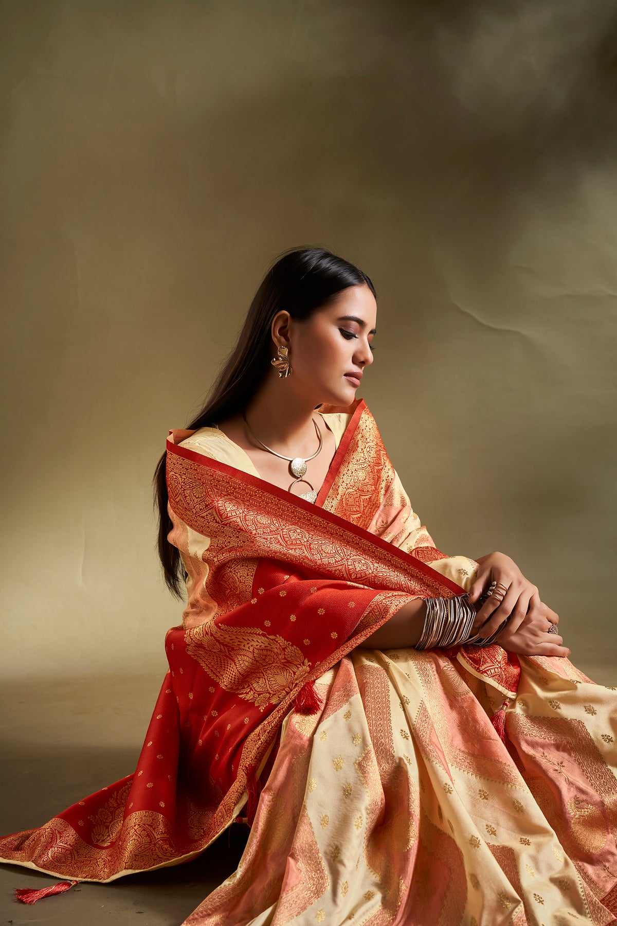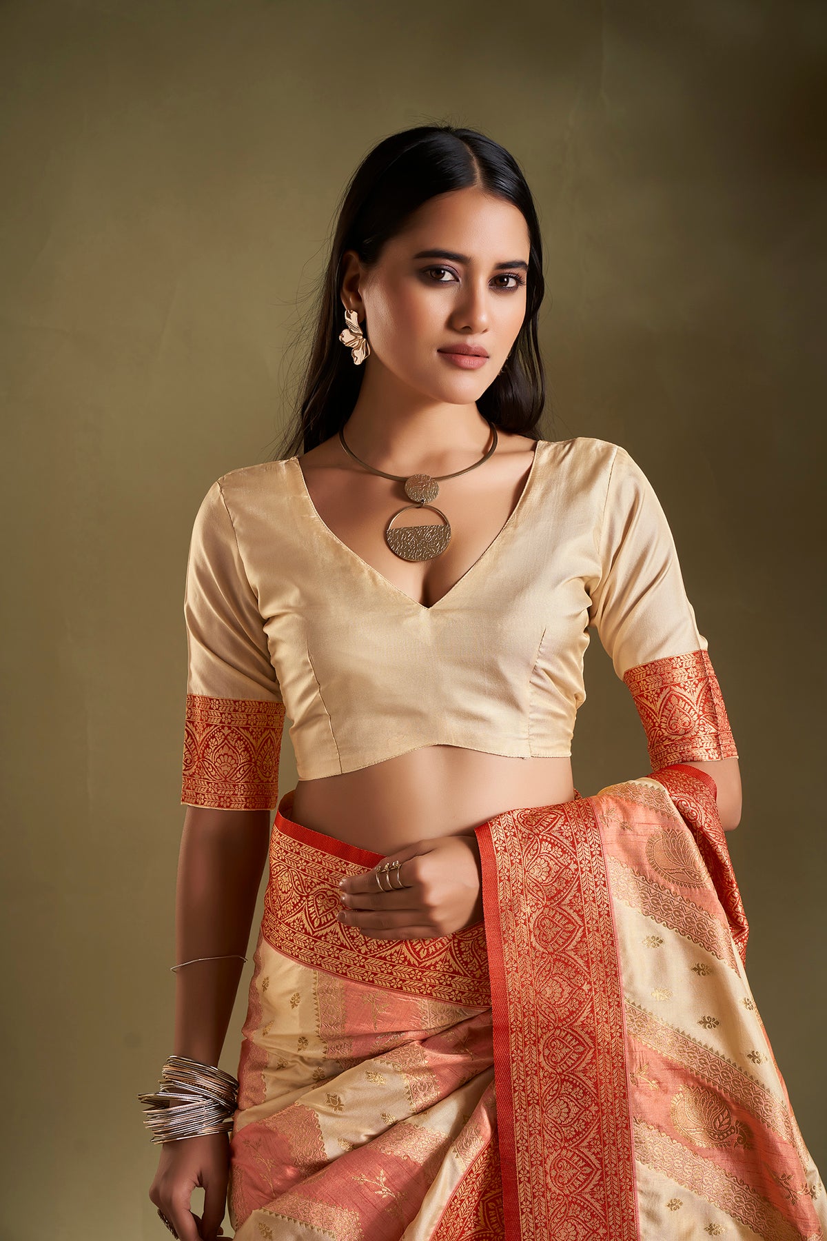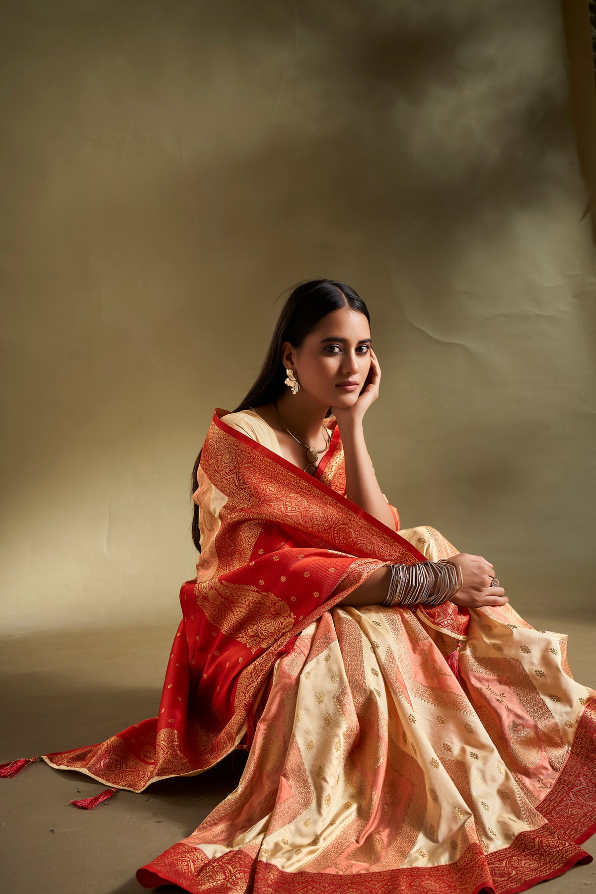 Experience the timeless charm of our Elora Soft Silk Woven Designed Banarasi Saree. This stunning cream and pink drape features intricate patterns that offer a regal look for any festive occasion.
