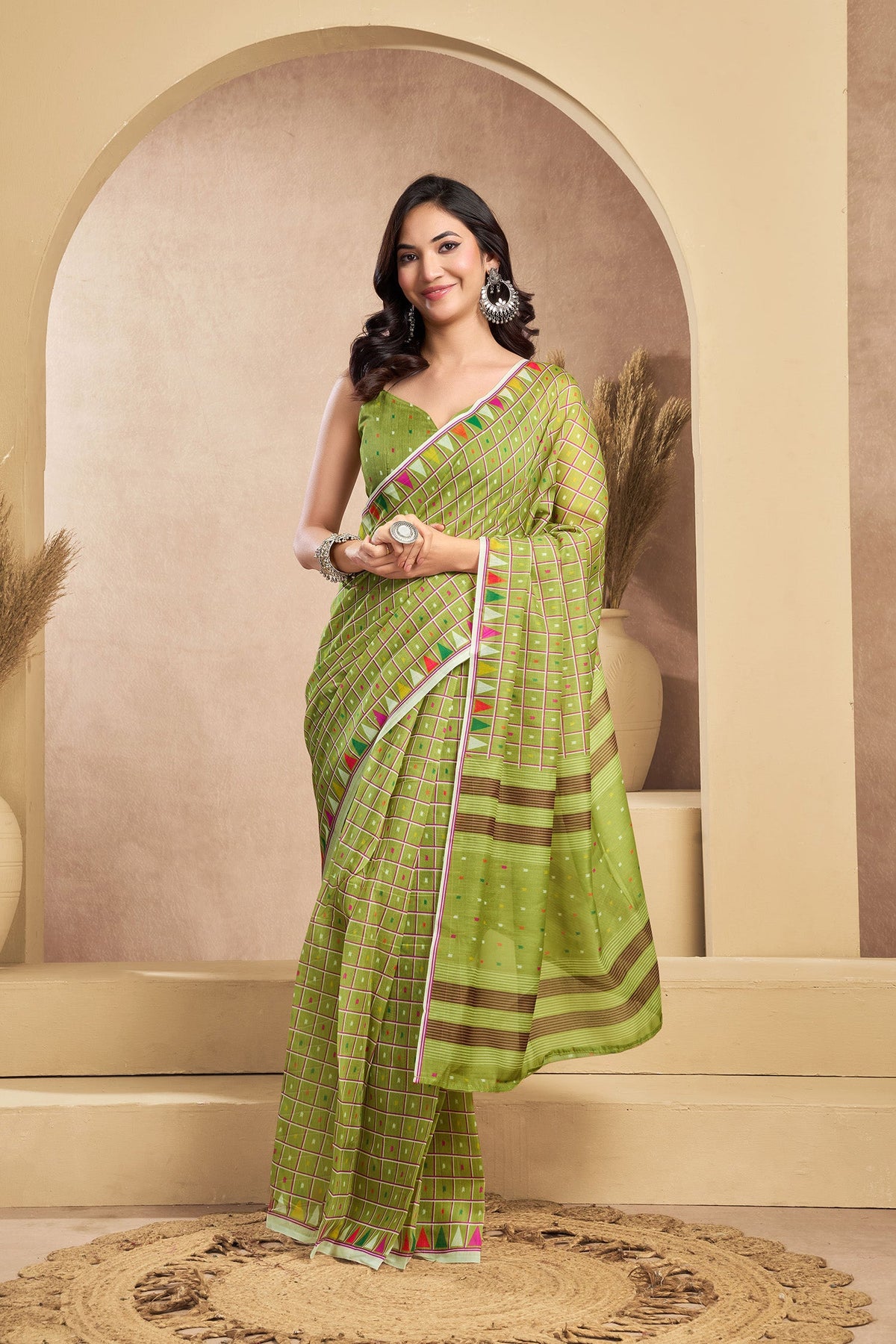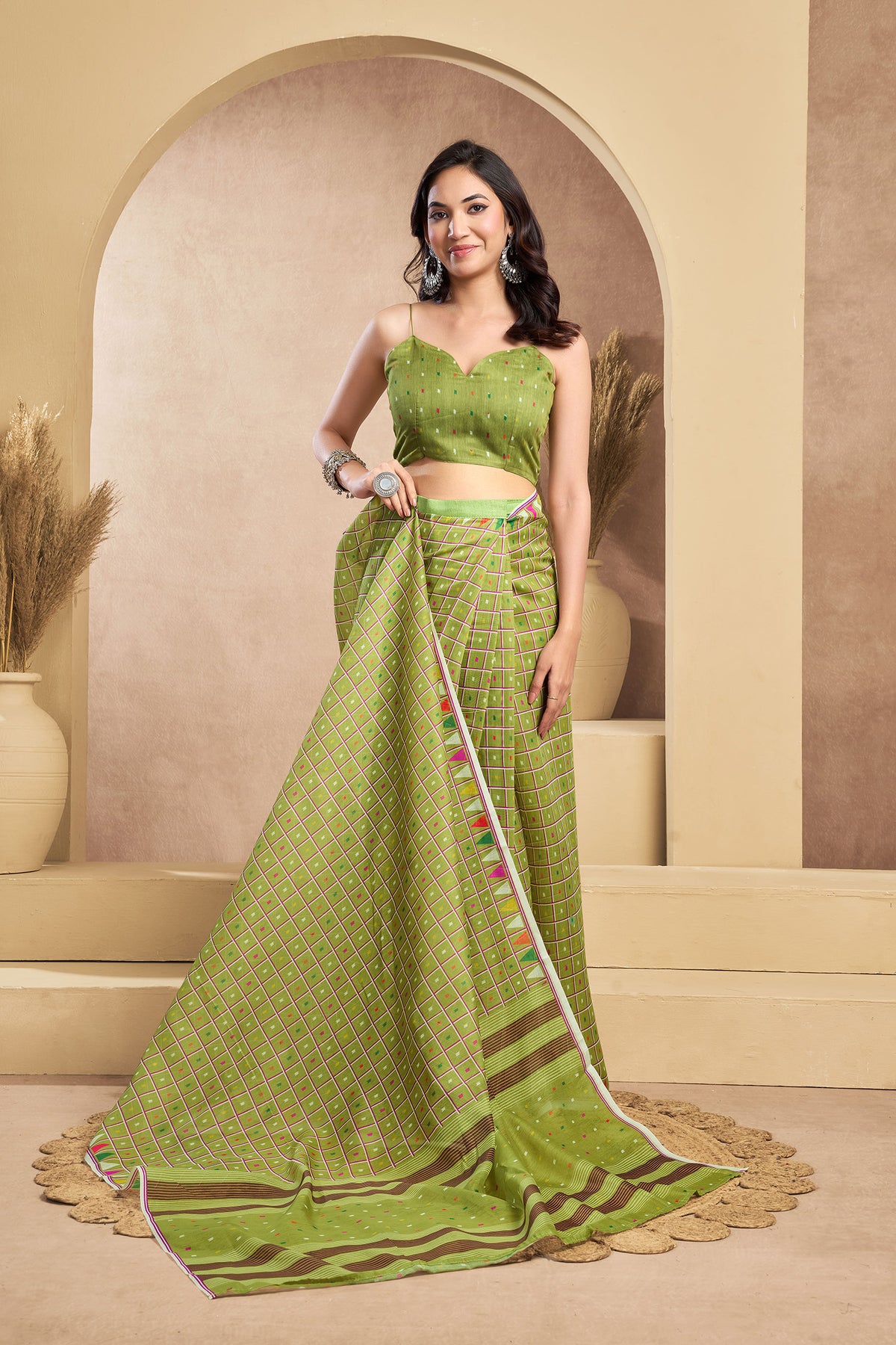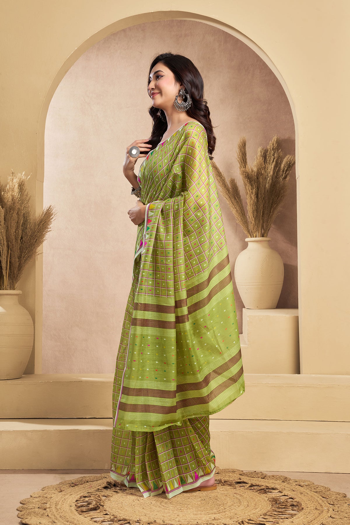 Flaunt your style with this Linen Mini Checks Printed Ready To Wear Saree For Women. unique design and beautiful colour Saree. Each piece is elegantly crafted with love and will surely add to your wardrobe. They will surely fetch a lot of second glances as you club it with flashy accessory. Pair this piece with heels or flats for a graceful look.