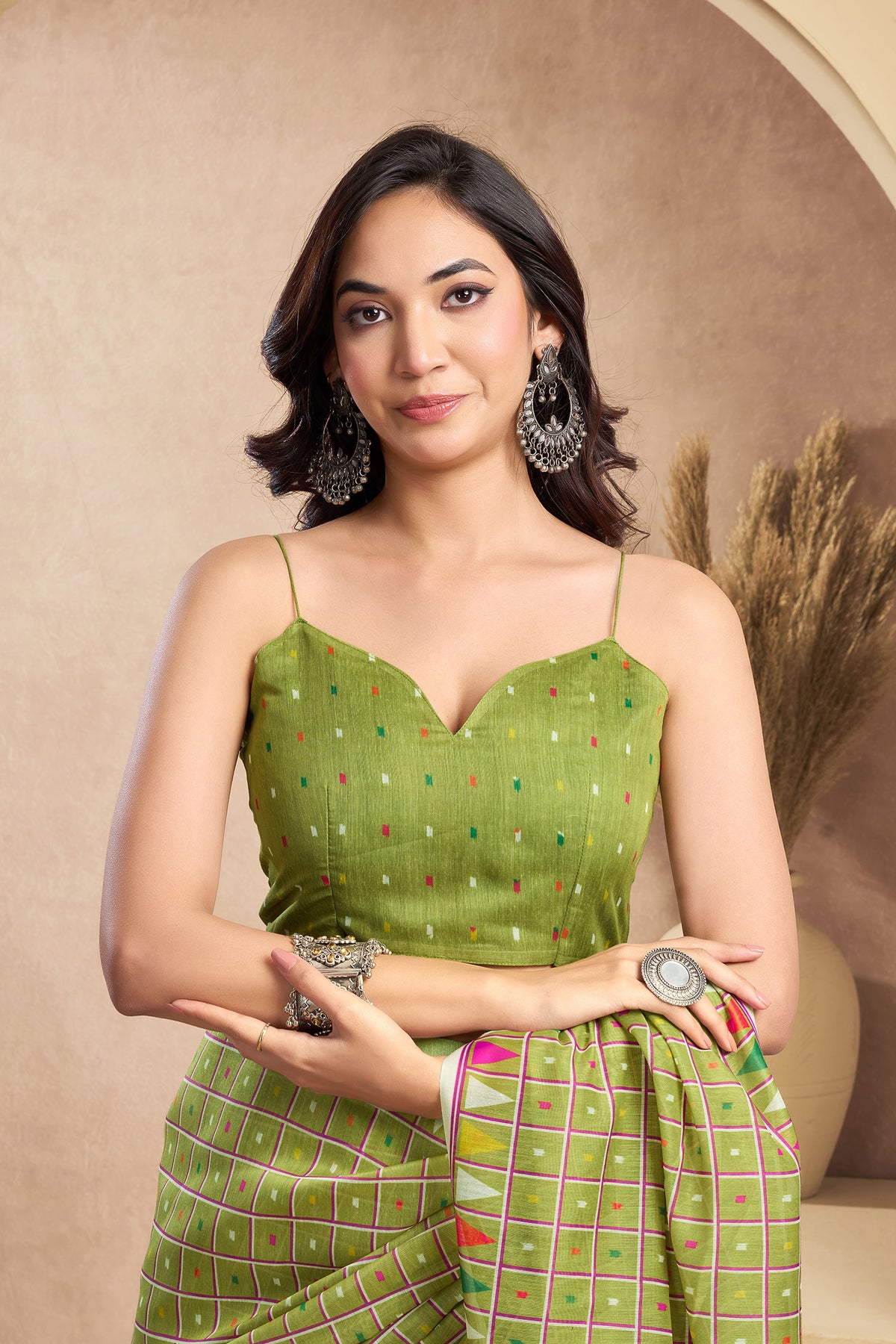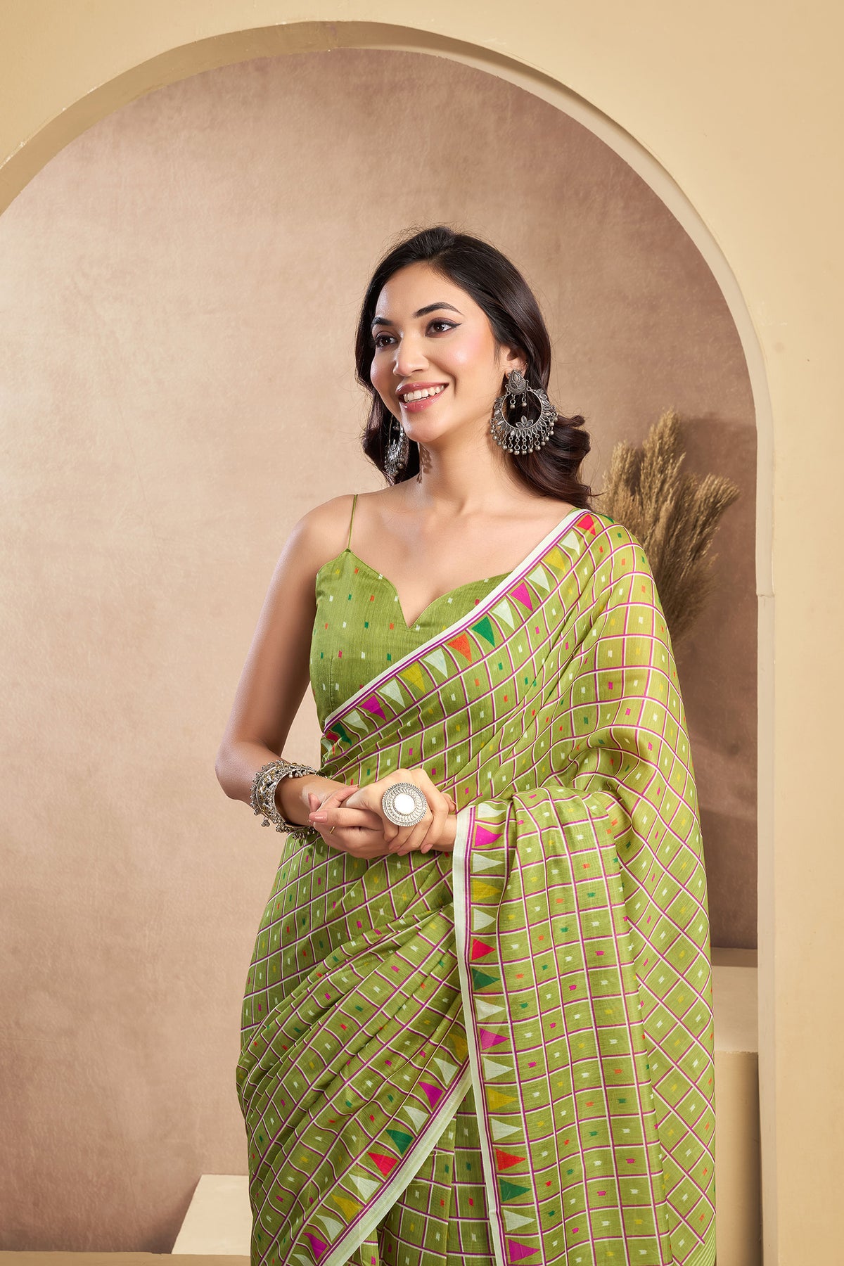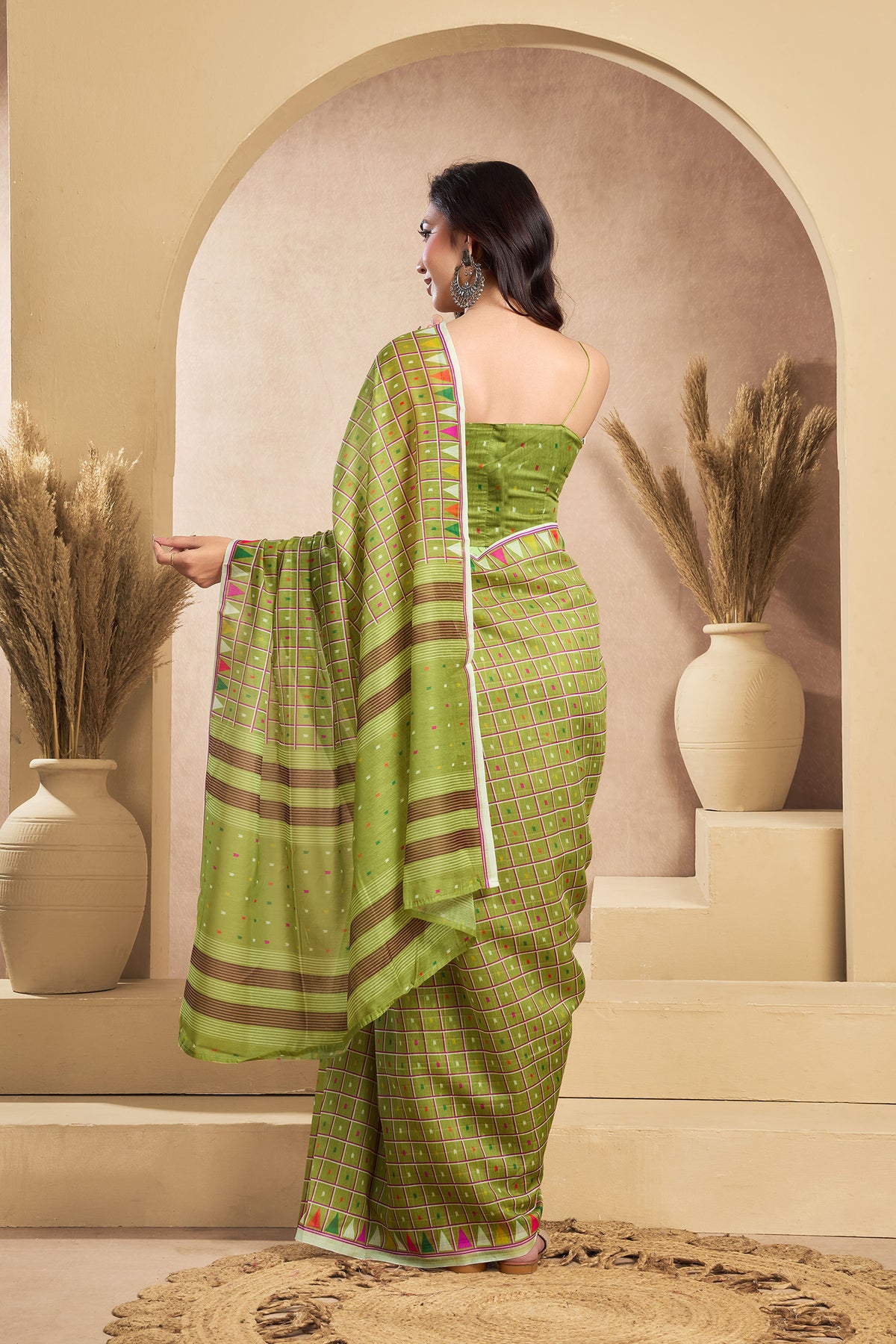 Flaunt your style with this Linen Mini Checks Printed Ready To Wear Saree For Women. unique design and beautiful colour Saree. Each piece is elegantly crafted with love and will surely add to your wardrobe. They will surely fetch a lot of second glances as you club it with flashy accessory. Pair this piece with heels or flats for a graceful look.