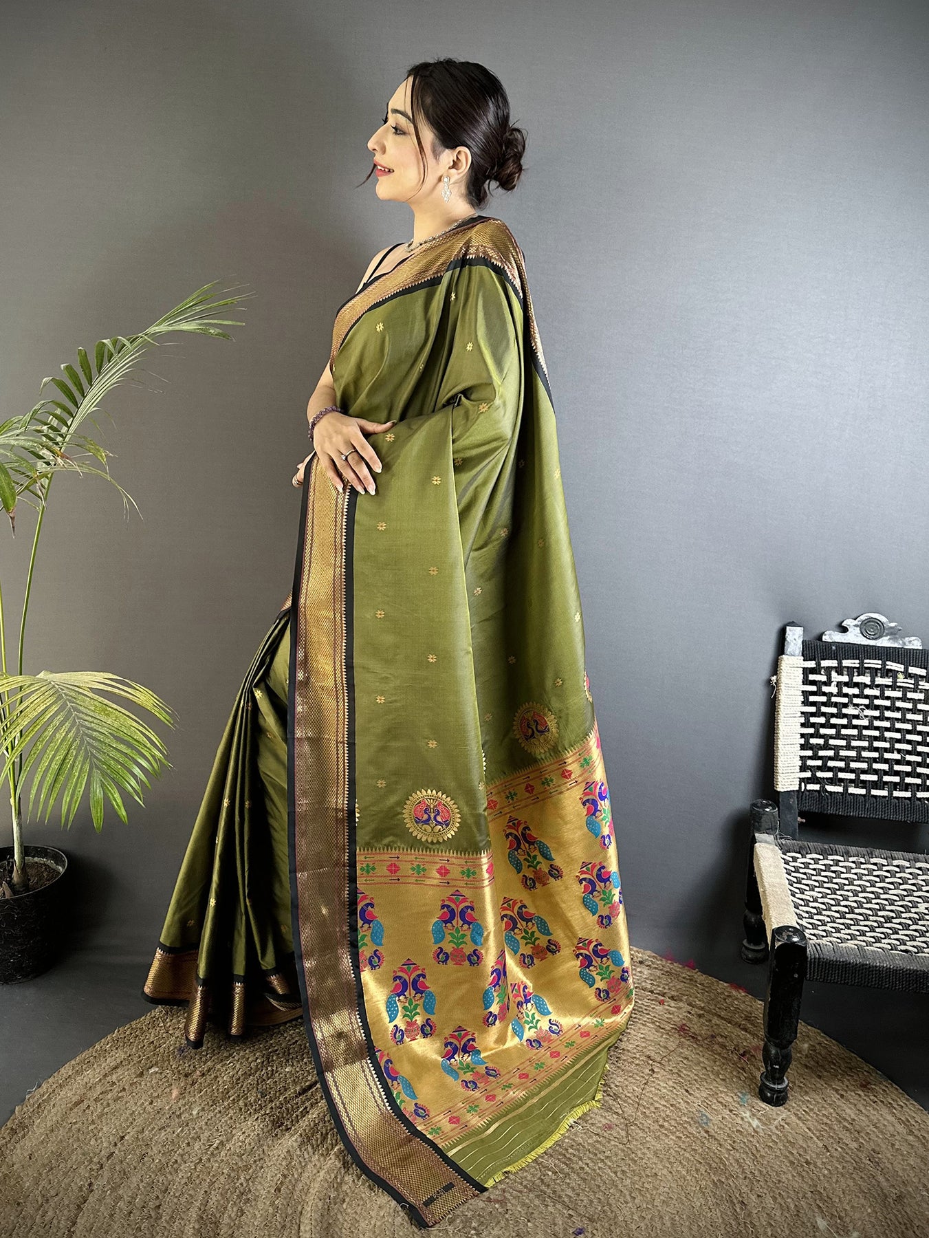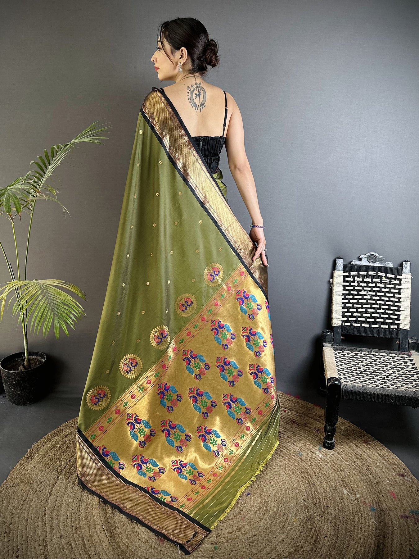 Mehandi Green Lichi Silk Peacock Ethnic Motifs Zari Woven Paithani Saree