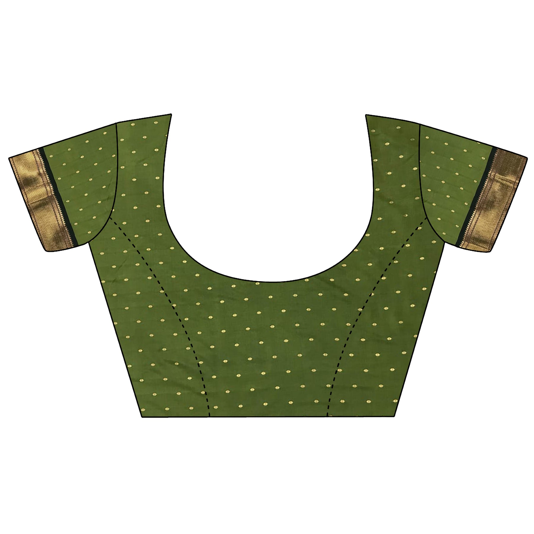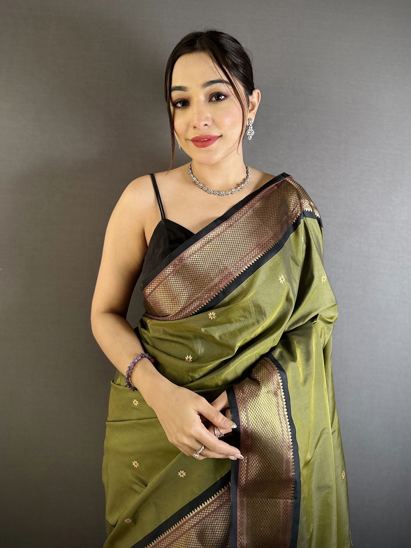 The rich Mehandi green hue highlights classic Paithani craftsmanship, enhanced by delicate zari details. Perfect for cultural events, receptions, and festive celebrations, it adds royal charm and timeless beauty.