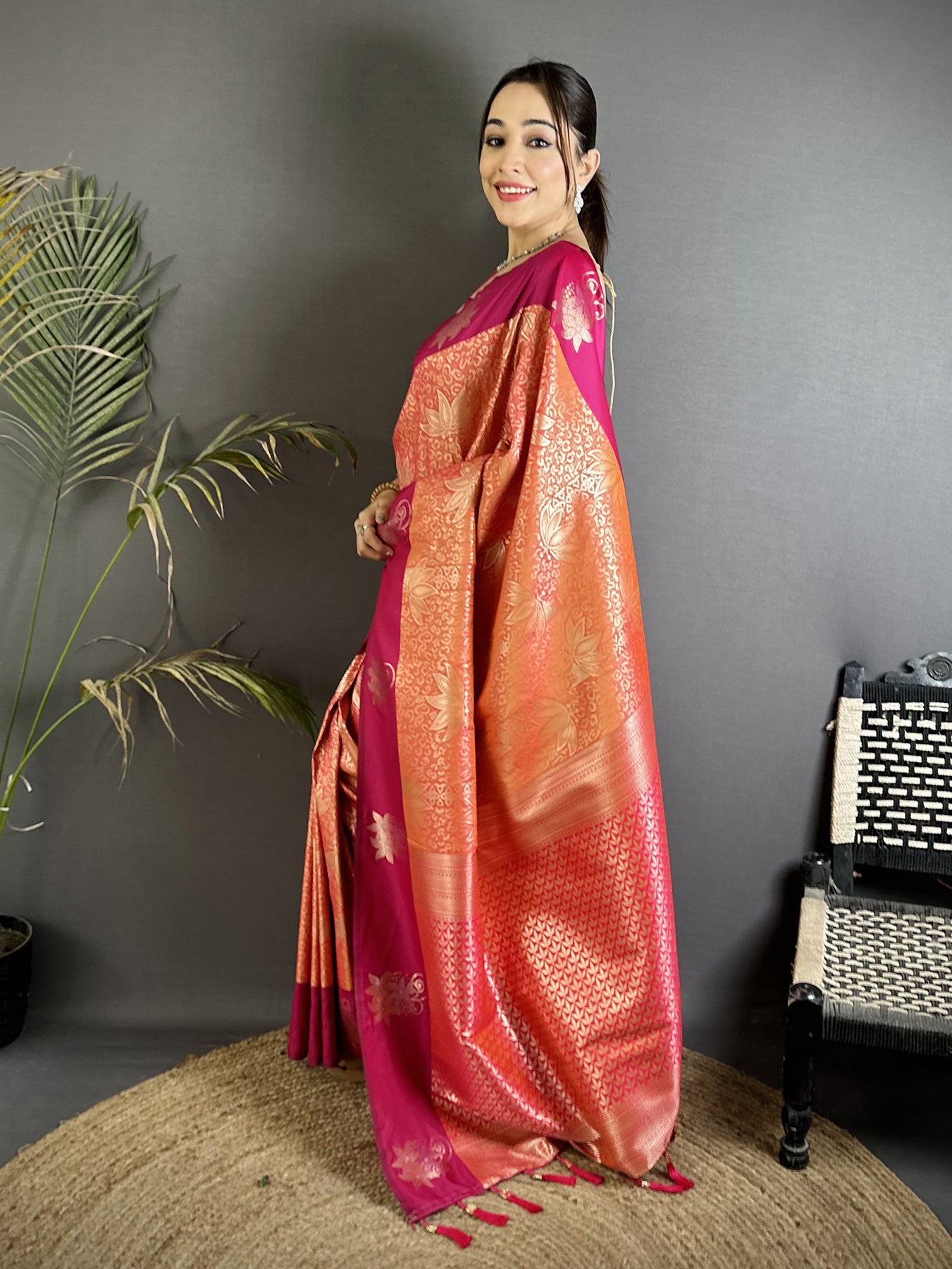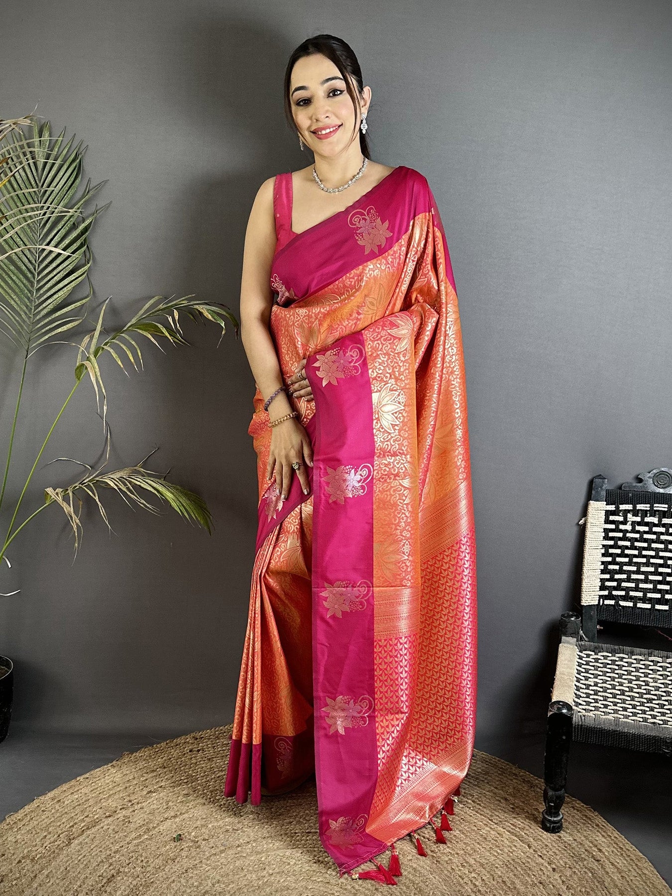 Flaunt your style with this Soft Silk Intricate Rose Gold Zari Weaving Dharamvaram Saree For Women. unique design and beautiful colour Saree. Each piece is elegantly crafted with love and will surely add to your wardrobe. They will surely fetch a lot of second glances as you club it with flashy accessory. Pair this piece with heels or flats for a graceful look.