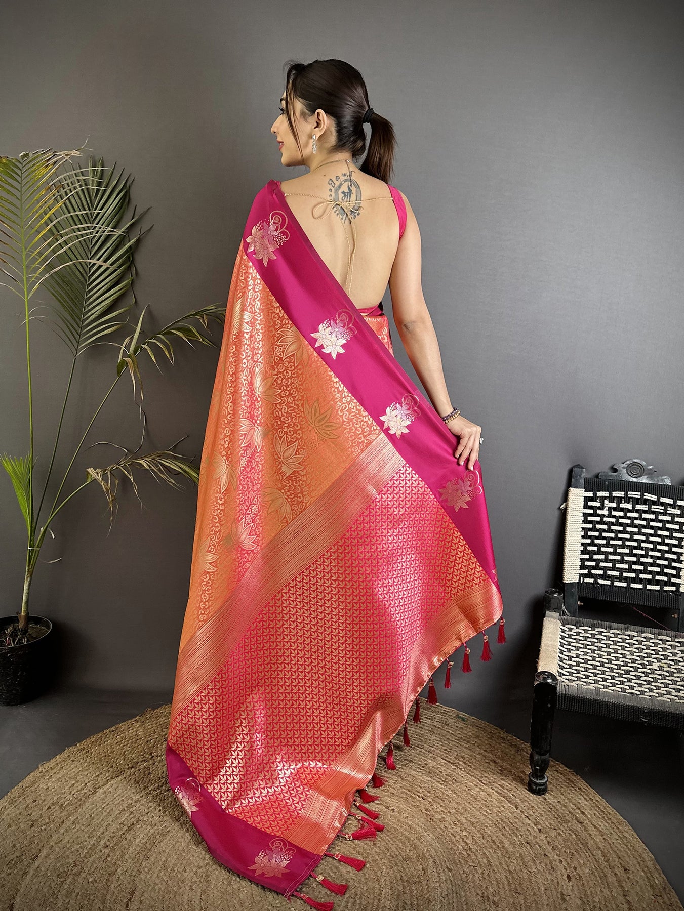 Orange Soft Silk Intricate Rose Gold Zari Weaving Dharamvaram Saree