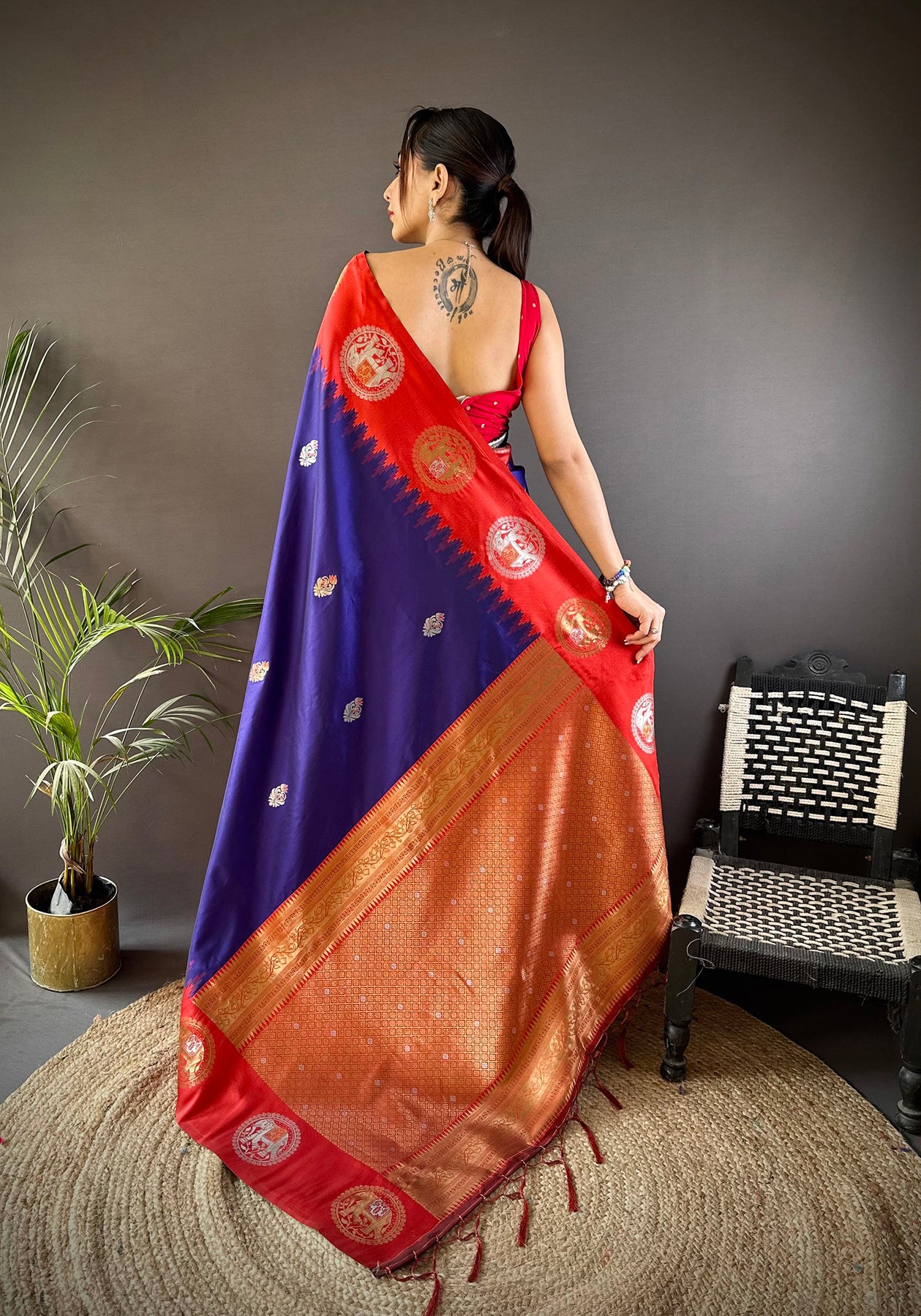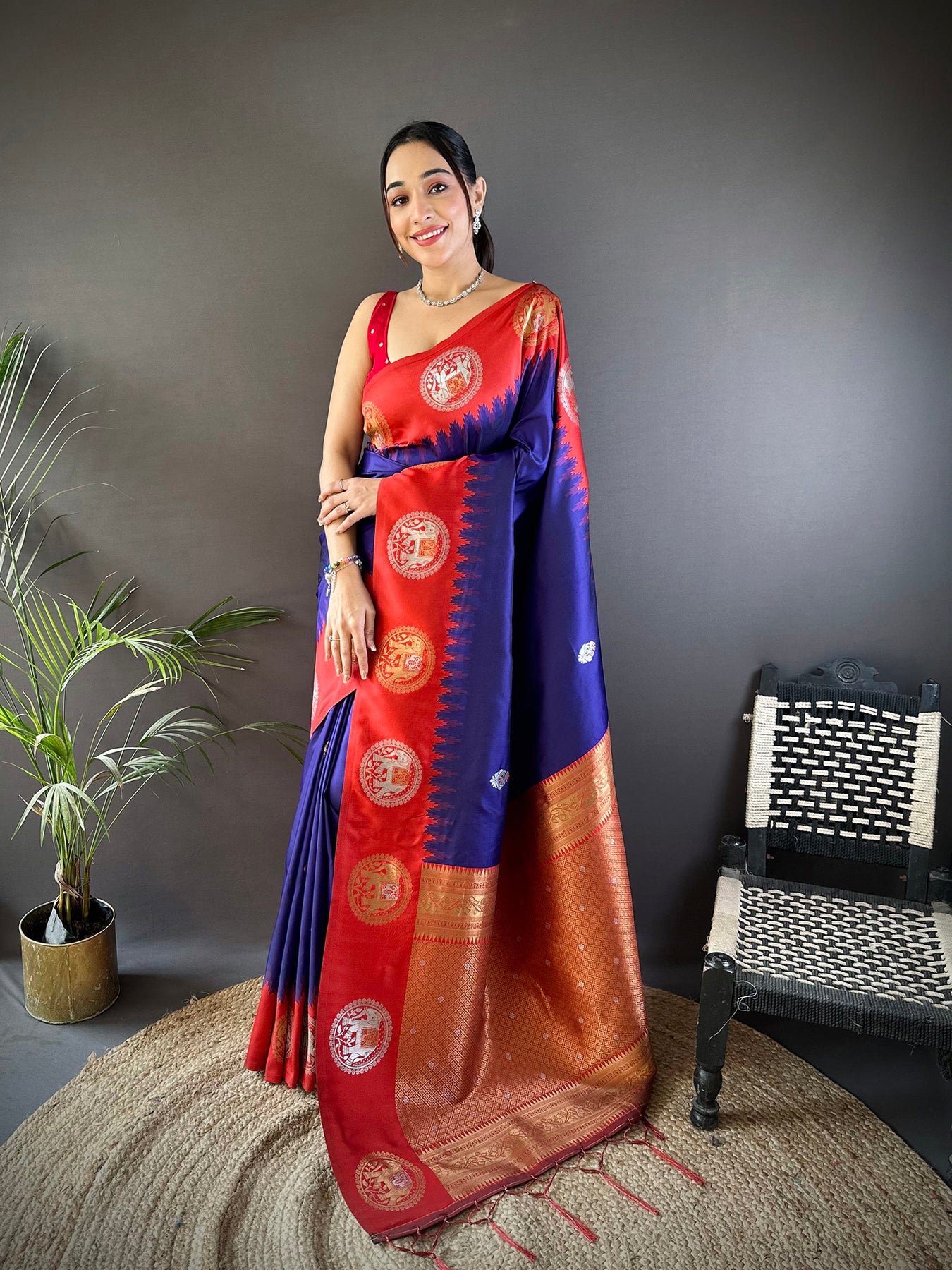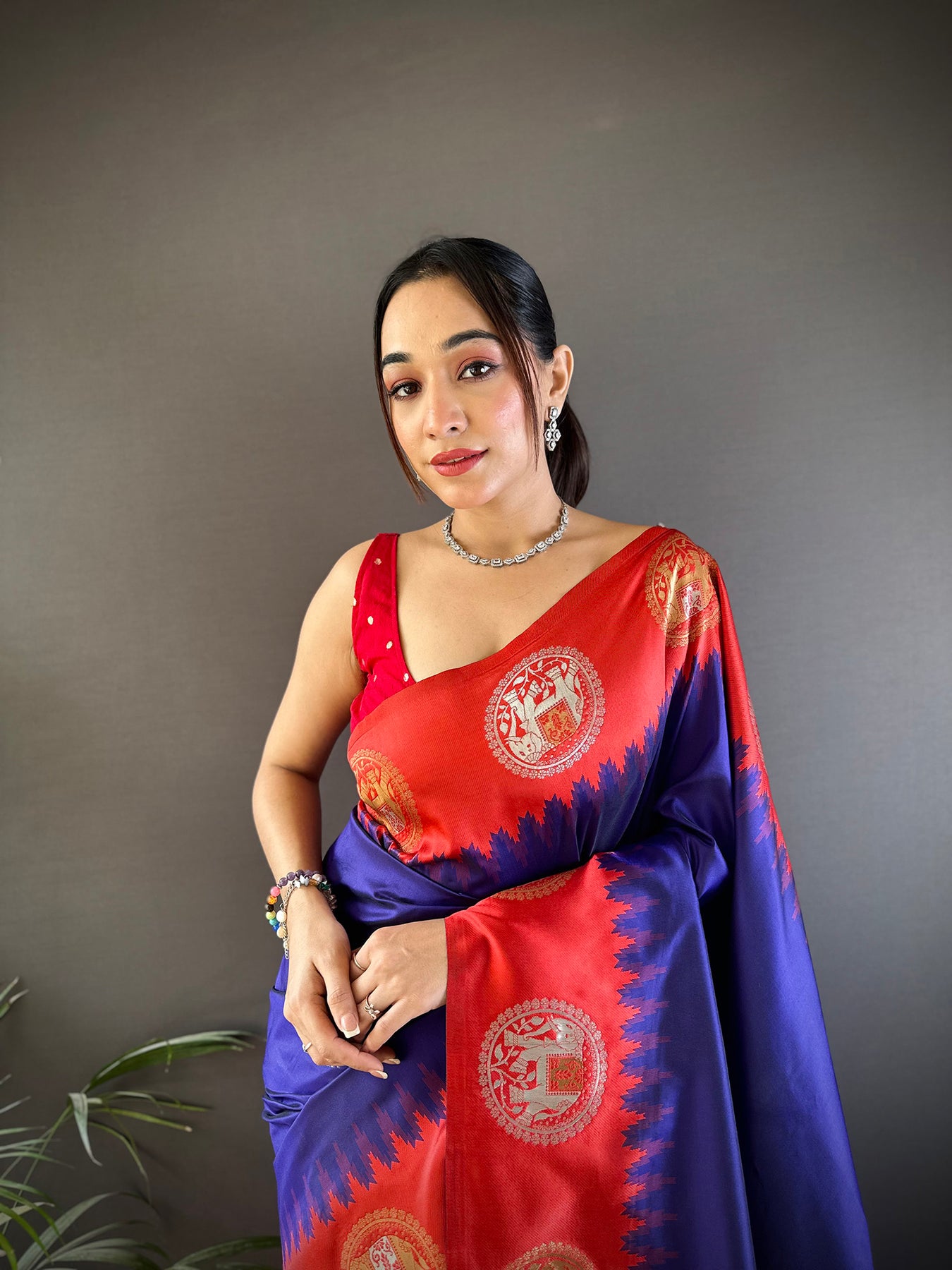 The rich royal blue color highlights delicate zari patterns, giving a regal and sophisticated look. Soft silk drapes gracefully, ensuring comfort while making a bold yet graceful style statement for any event.