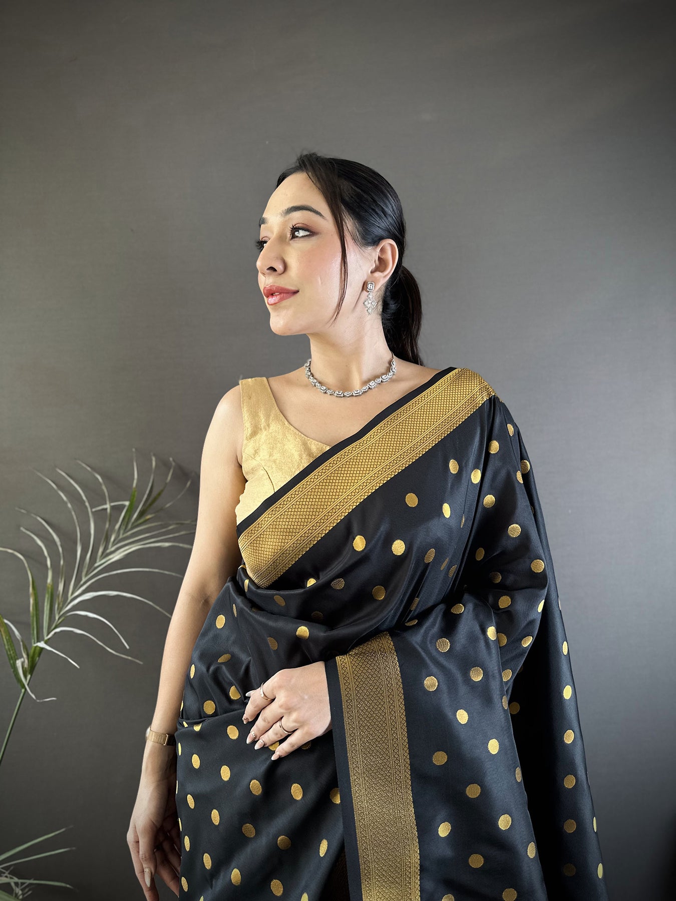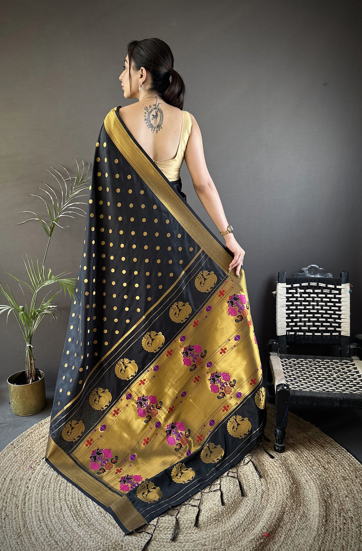 Black Lichi Silk Peacock & Floral Motis Zari Weaving Paithani Saree
