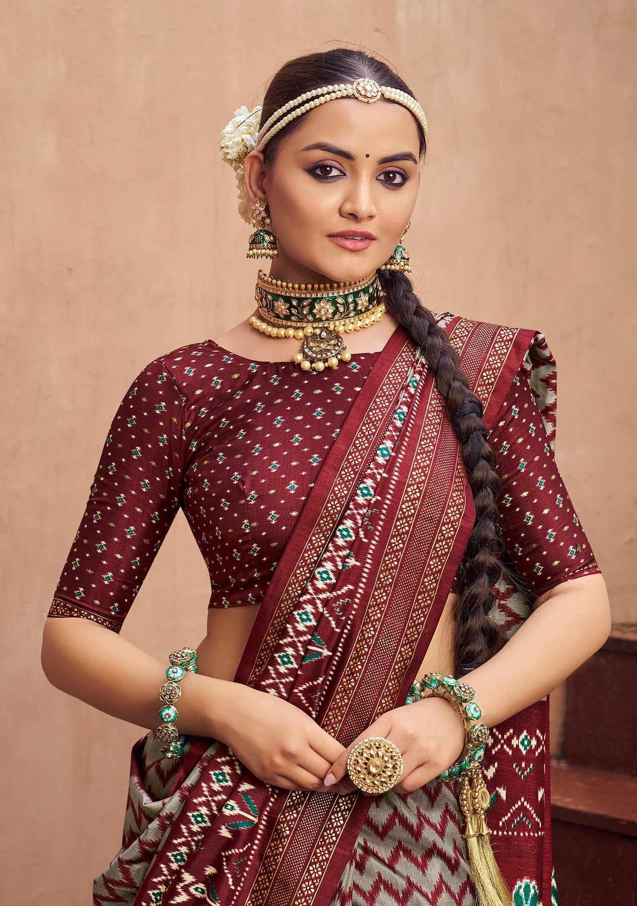 Experience elegance with this Grey Soft Silk Ikkat Printed Patola Saree. Its smooth silk fabric drapes beautifully, offering comfort and style for festive occasions, weddings, and casual wear alike.