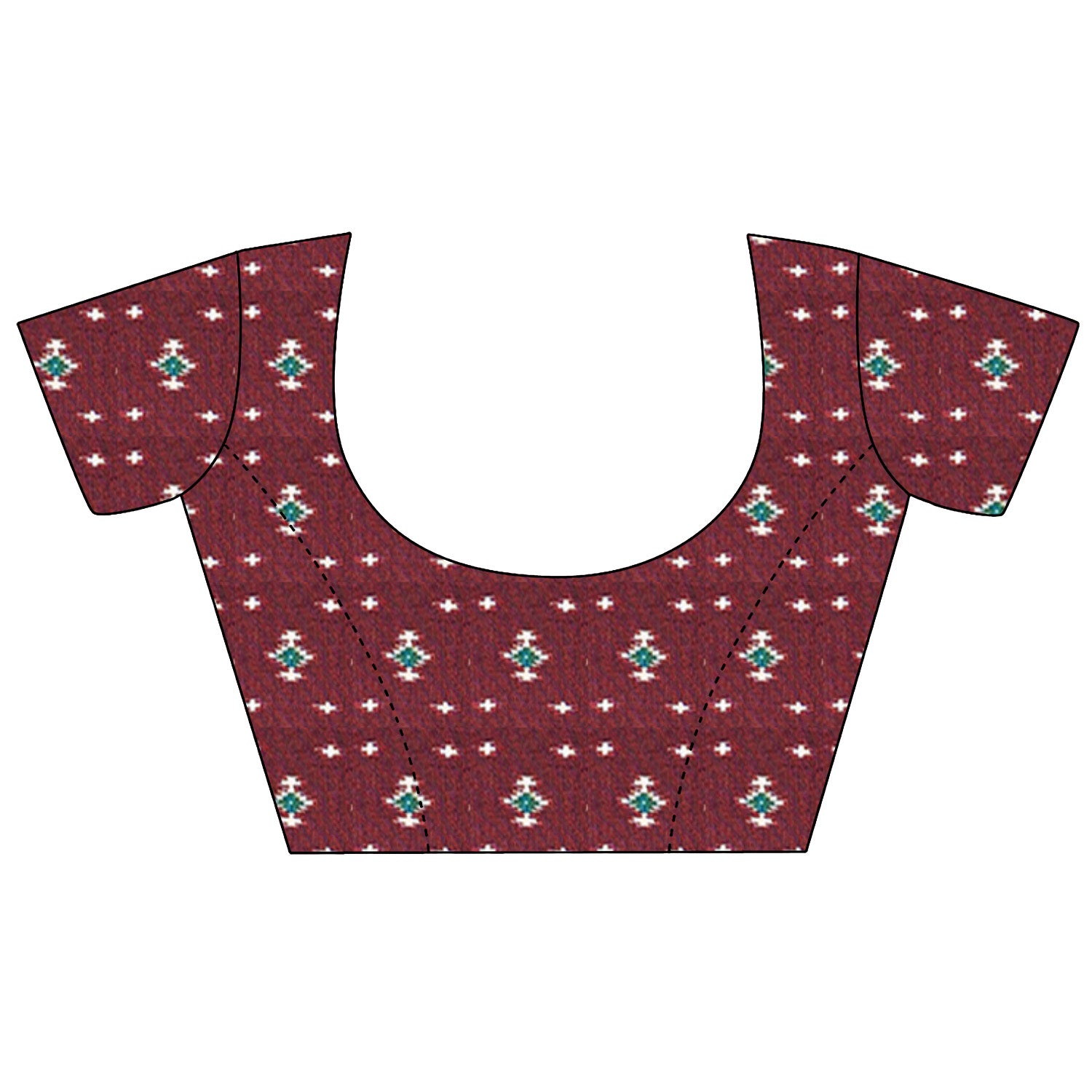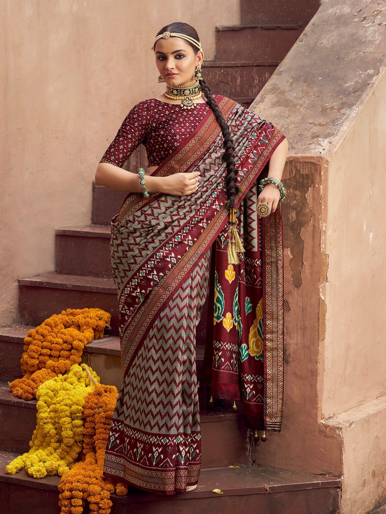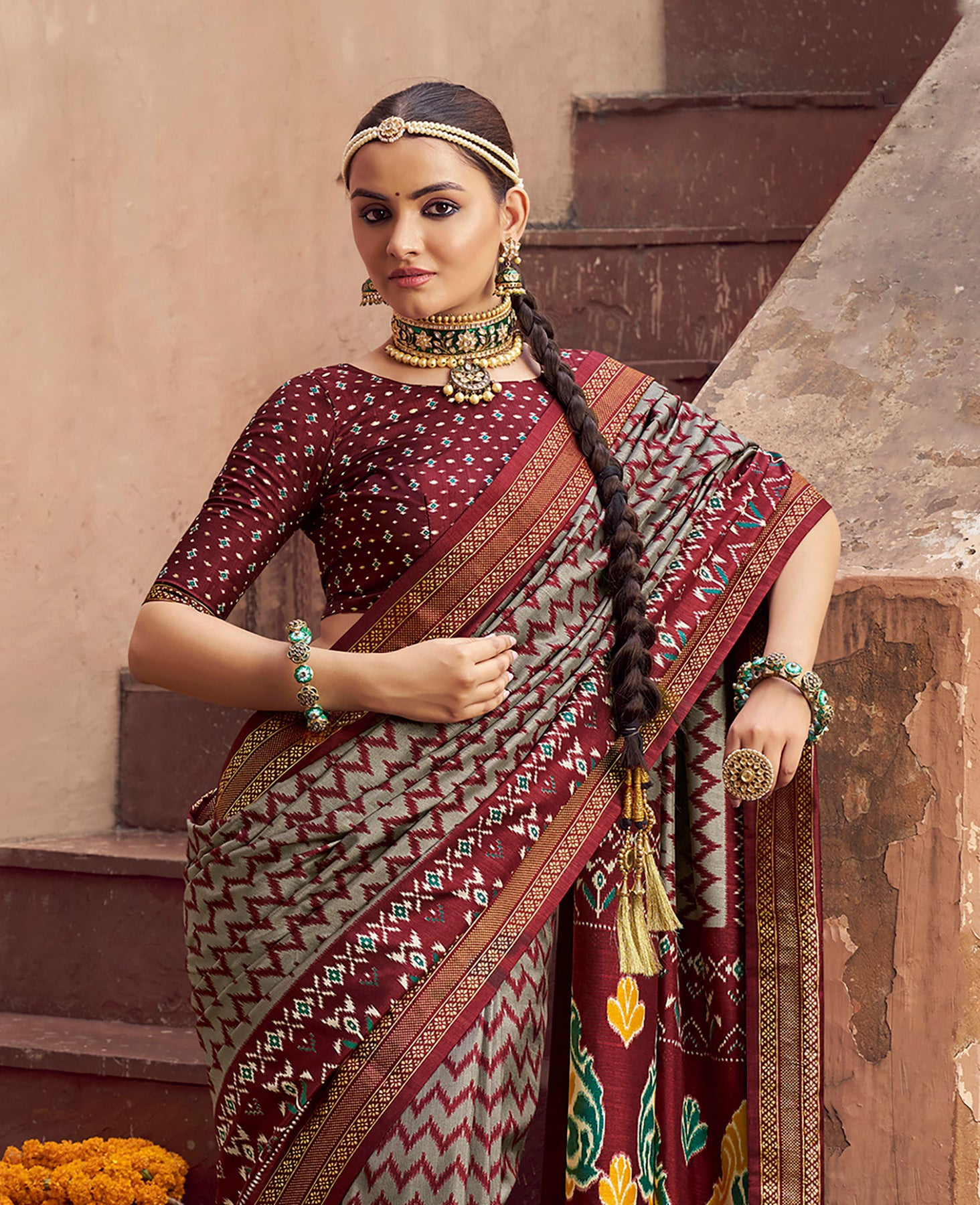 The intricate Ikkat patterns on this Patola saree create a timeless charm. Each design is digitally printed with precision, making it a perfect blend of traditional artistry and modern fashion trends.