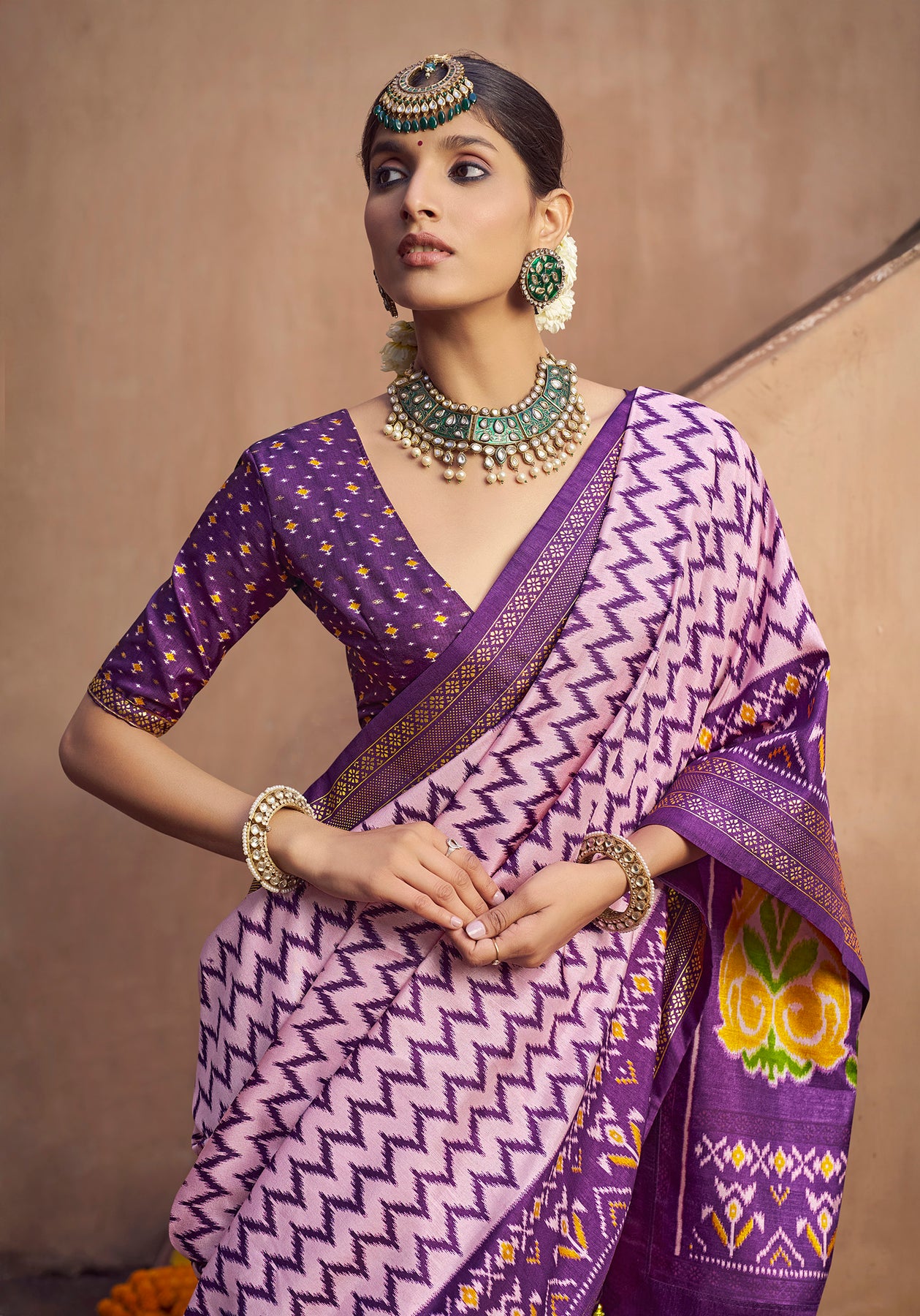 The delicate Ikkat patterns on this Patola saree are digitally printed with precision. The lavender shade adds a fresh, feminine charm, combining traditional art with contemporary fashion trends.
