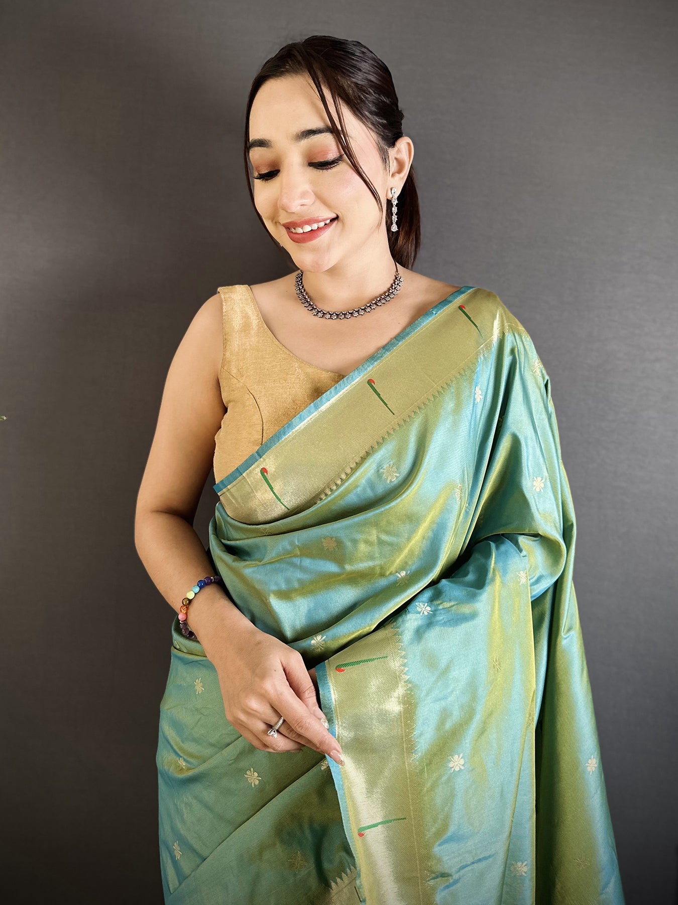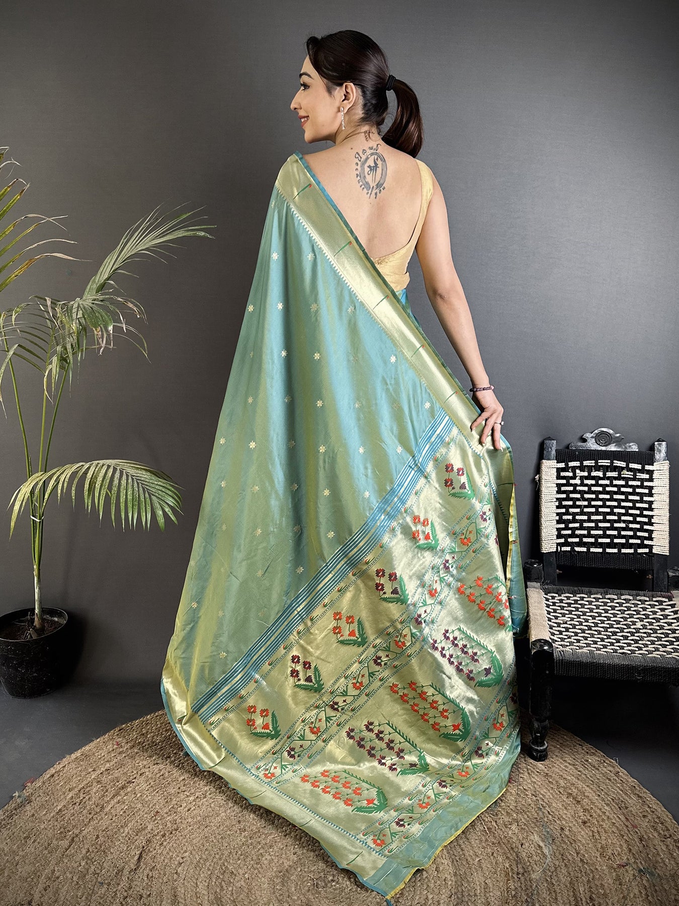 Light Green Lichi Silk Floral Ikkat Motifs Zari weaving Paithani Saree