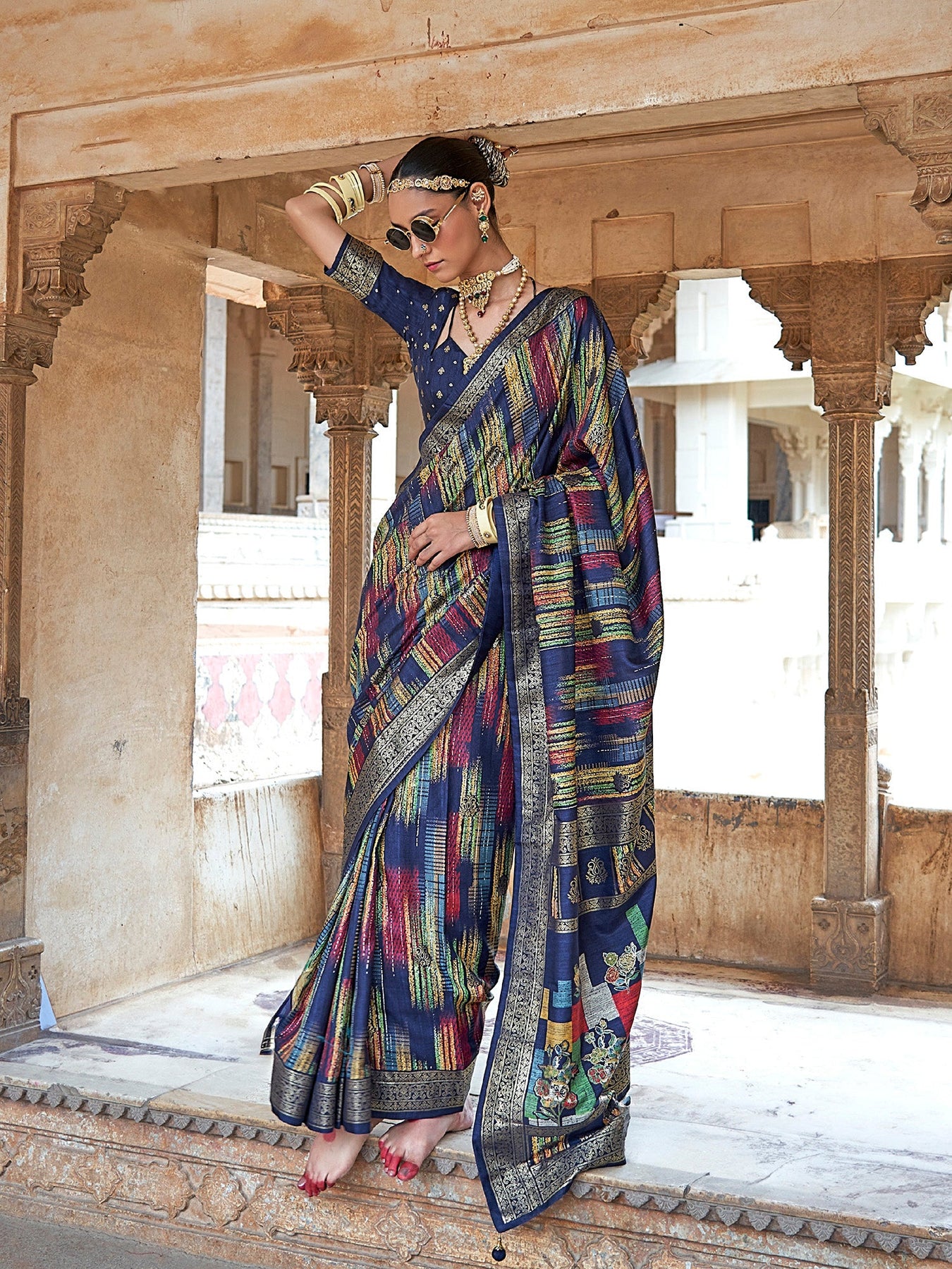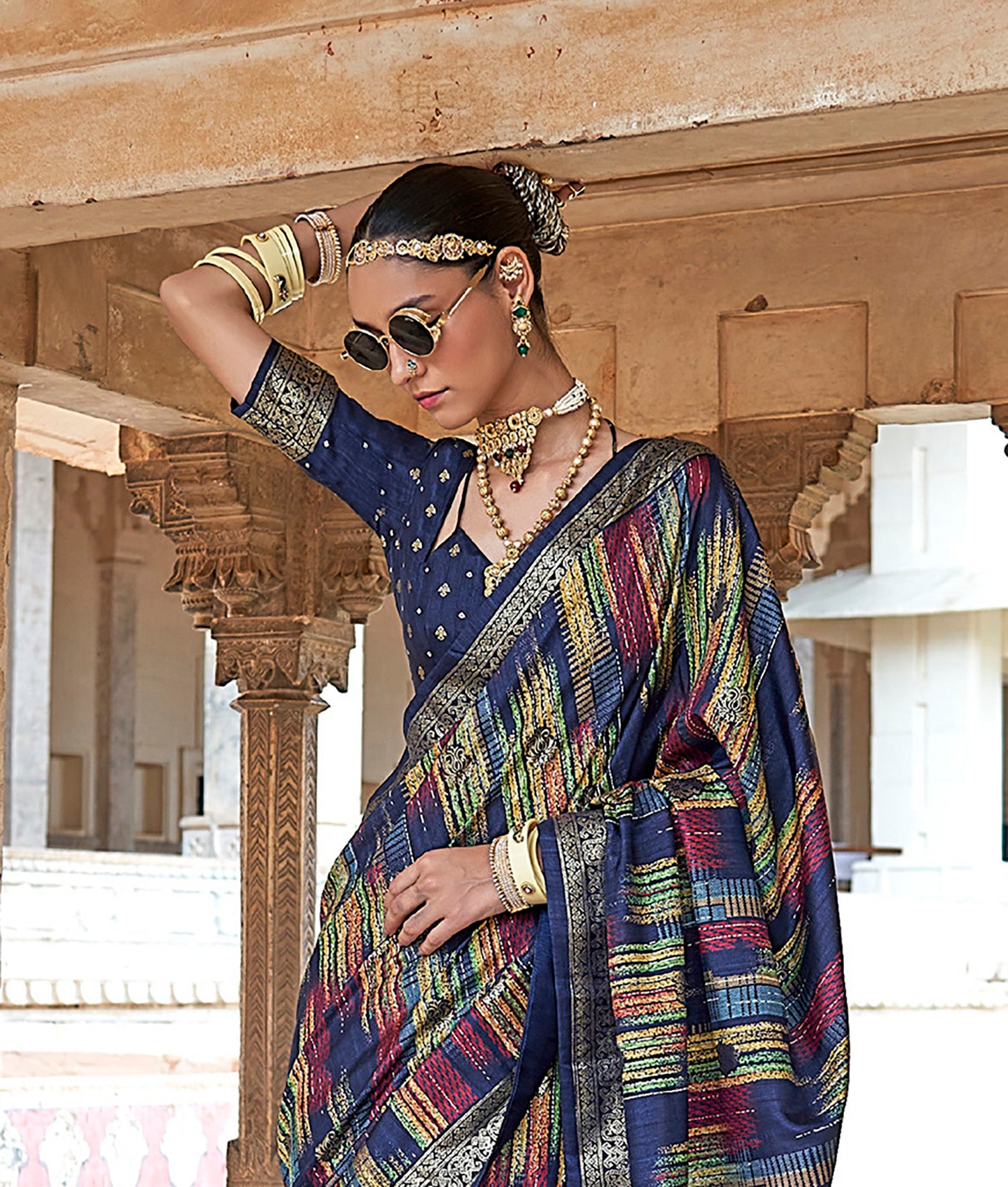 Elevate your style with this Navy Blue Soft Silk Woven Patola Printed Saree. Its rich silk texture and vibrant patola patterns make it perfect for weddings, festivals, and special occasions.