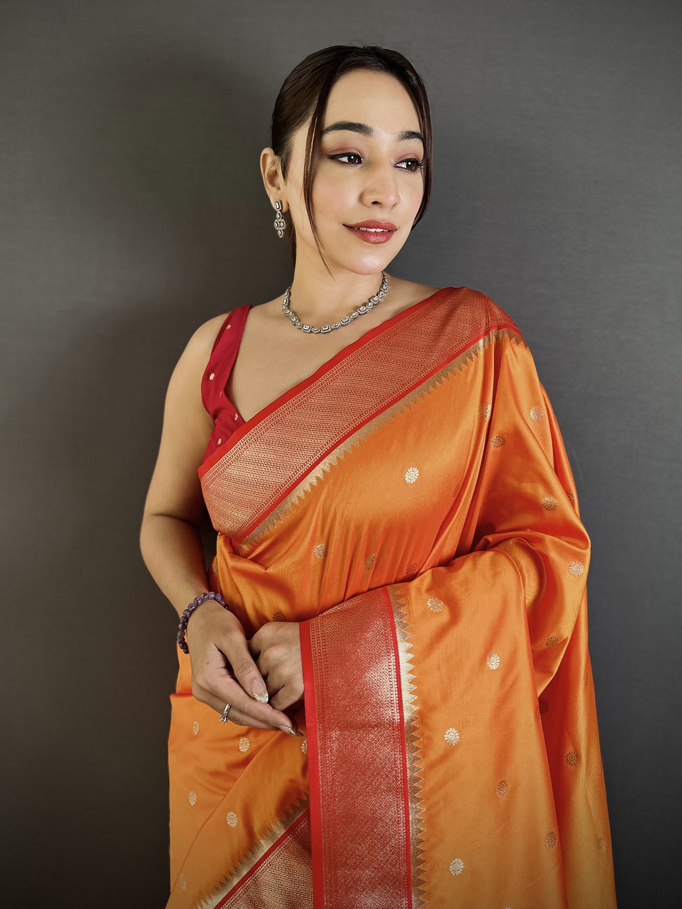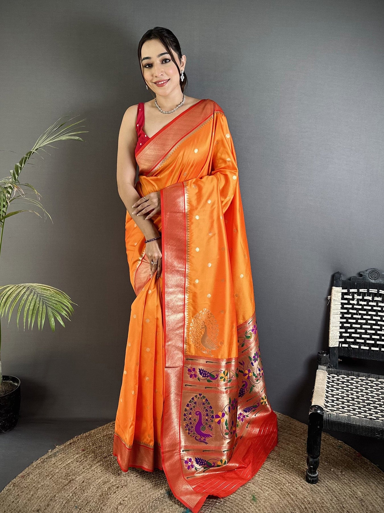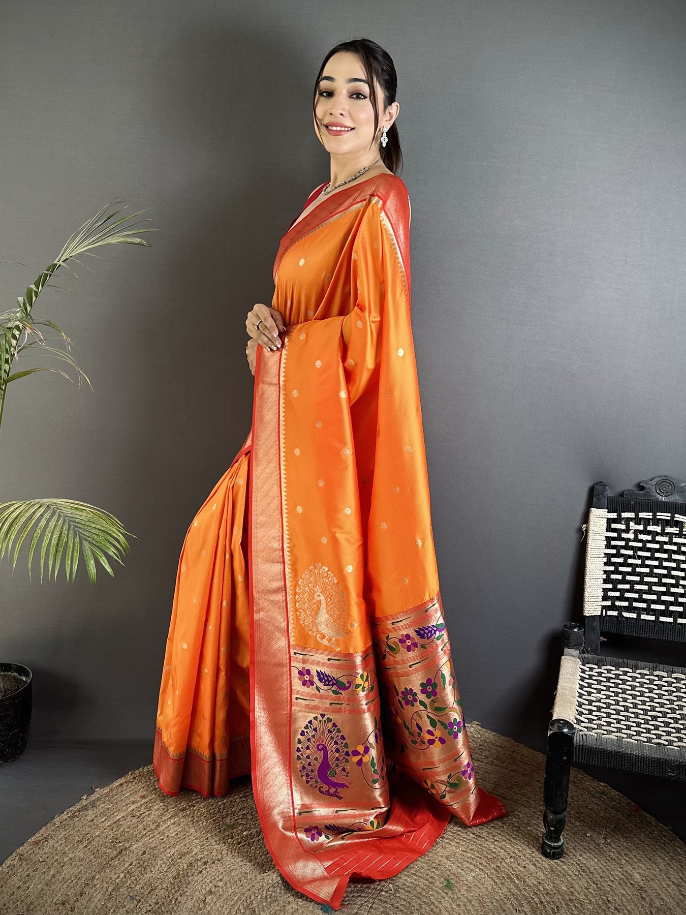 Orange Lichi Silk Paithani Peacock Motifs Zari Work Saree