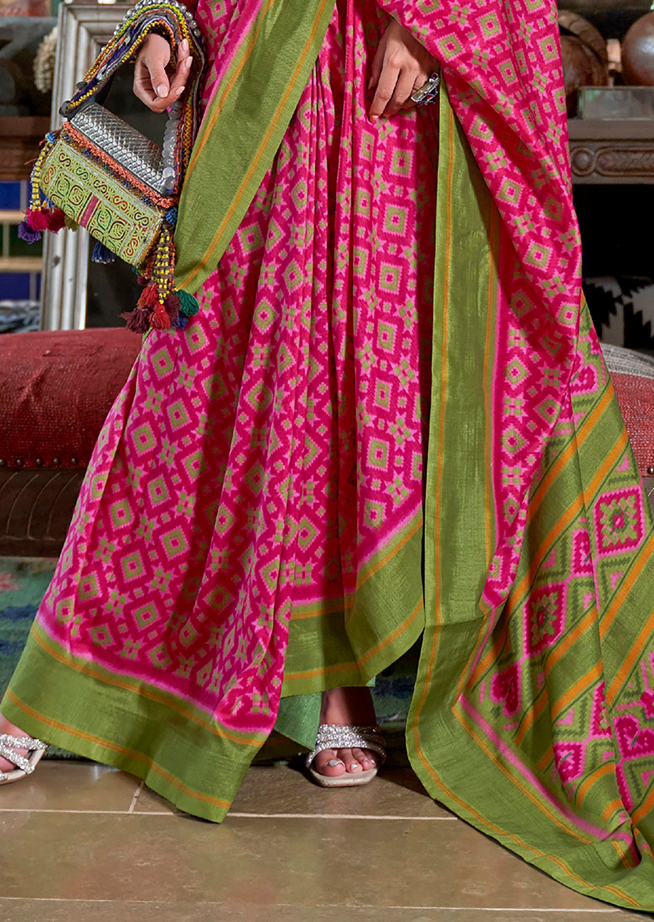 Add charm to your wardrobe with this Pink Soft Silk Ikkat Printed Patola Saree. Its soft pink hue and intricate Ikkat designs reflect timeless Indian tradition, perfect for weddings, festivals, and special events.