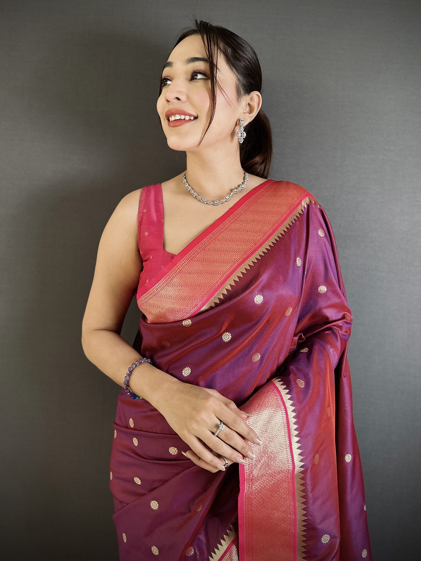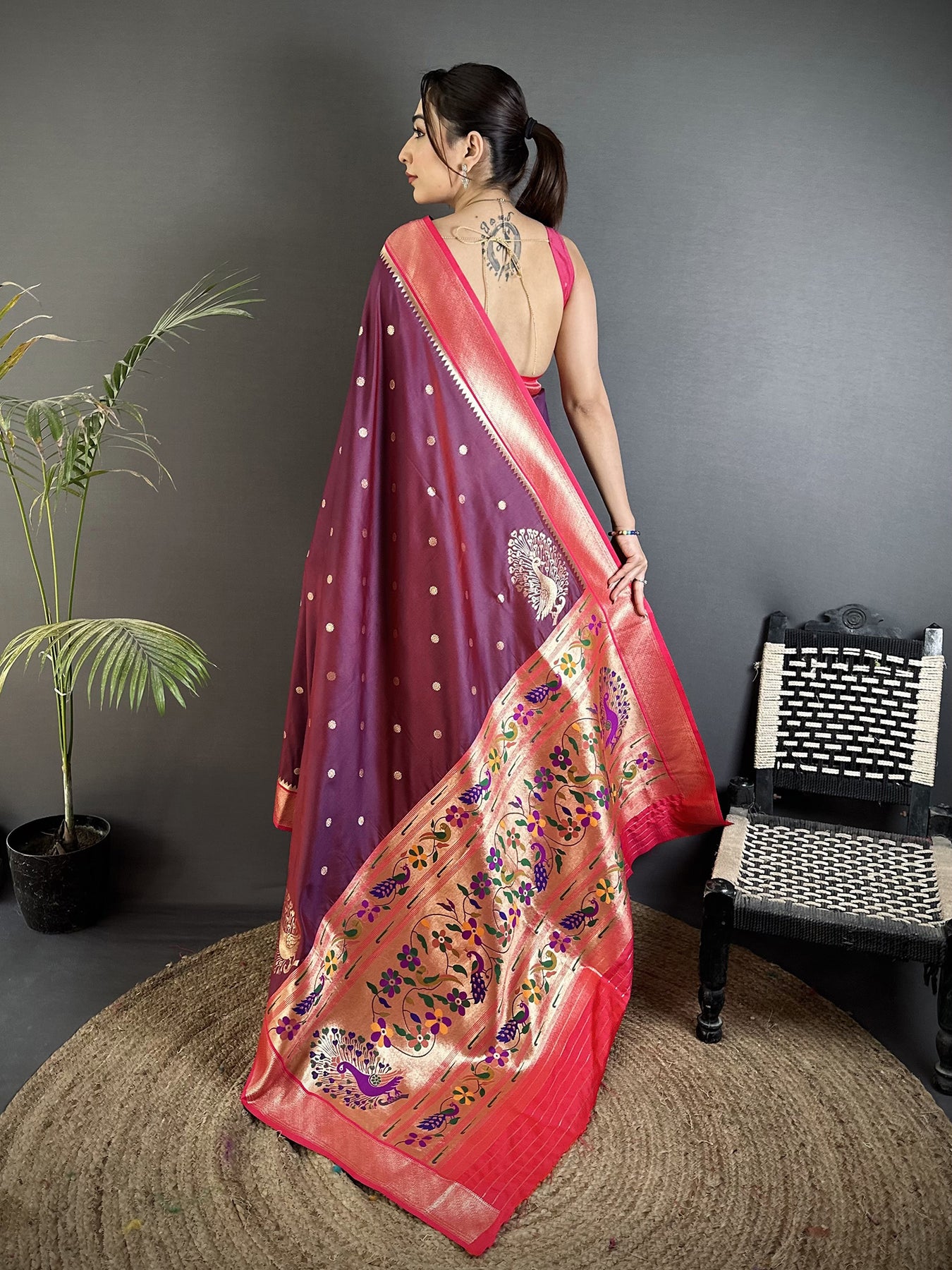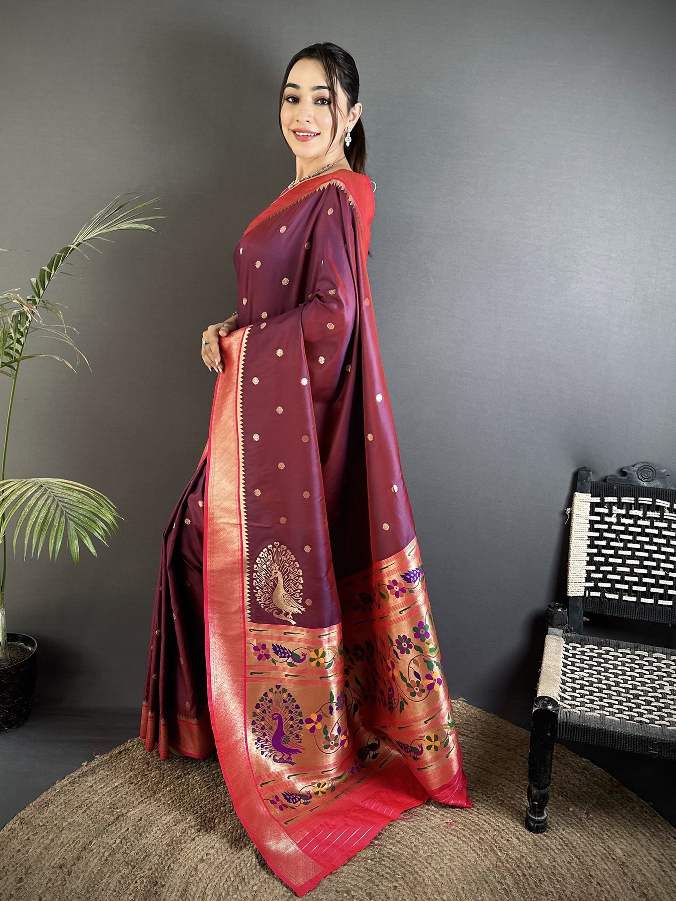 Wine Lichi Silk Paithani Peacock Motifs Zari Work Saree